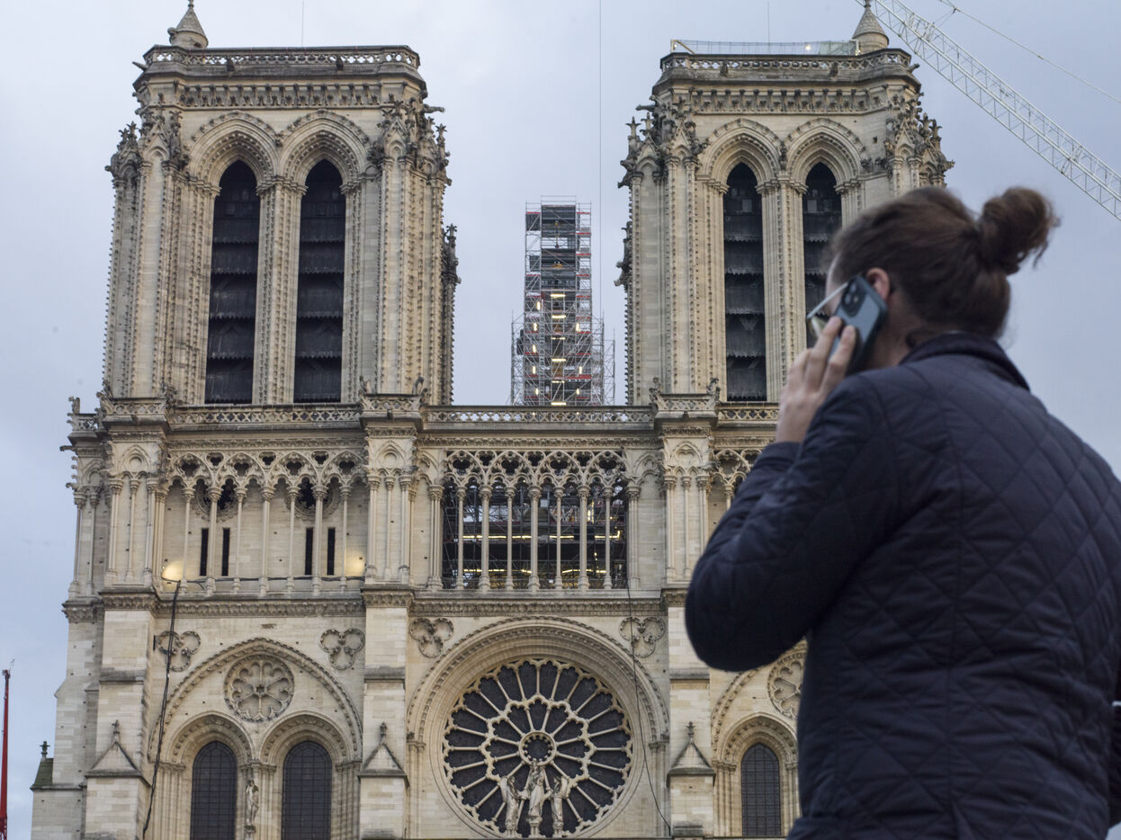 Quatre ans et demi après l'incendie de la cathédrale Notre-Dame et un an avant sa réouverture, on distingue à nouveau la silhouette de la flèche à travers les échafaudages.
