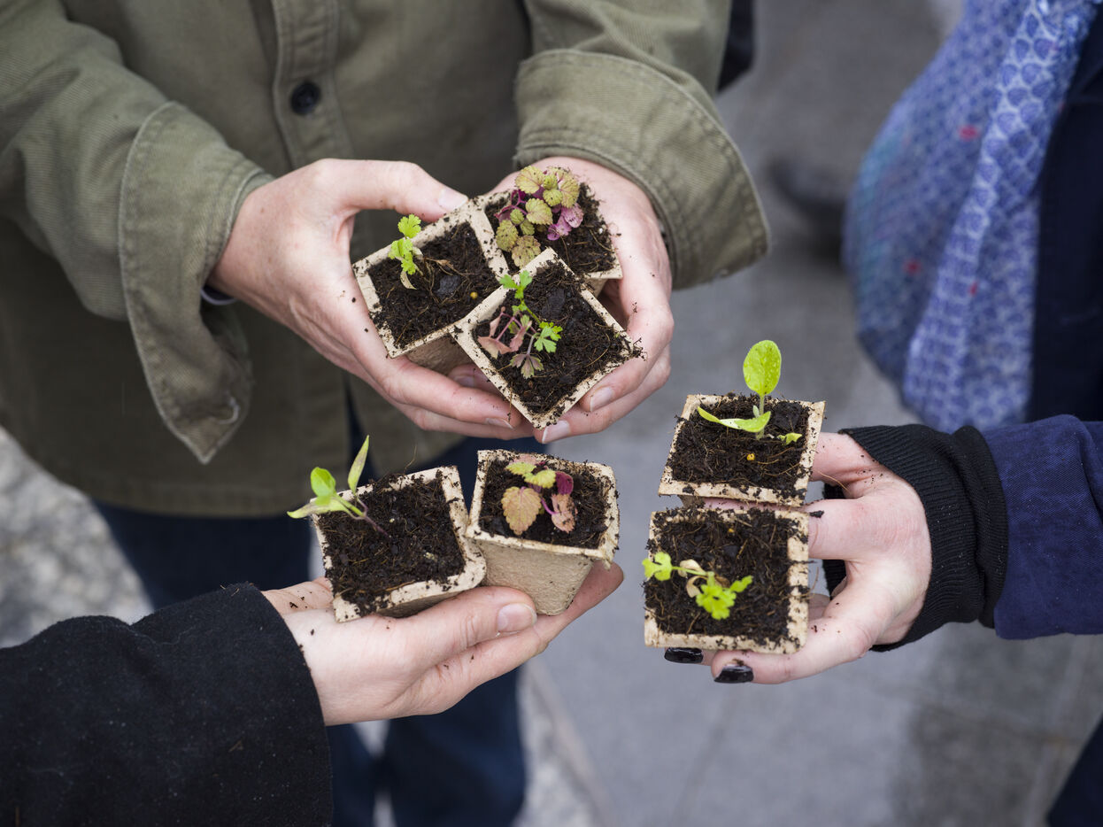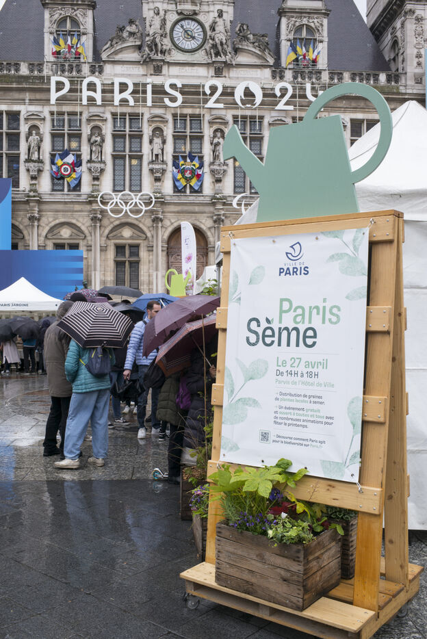 Paris celebrates spring in the rain on Place de l'Hotel de Ville. The City of Paris is distributing seed packets and seedlings of local plants to Parisians who want to help green the city and promote biodiversity in the capital.