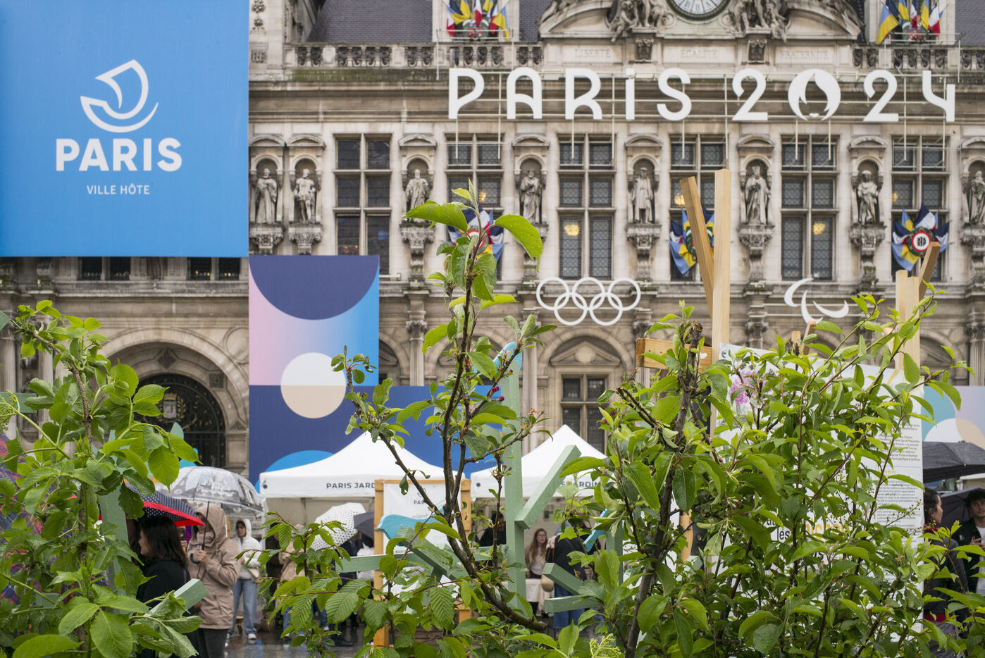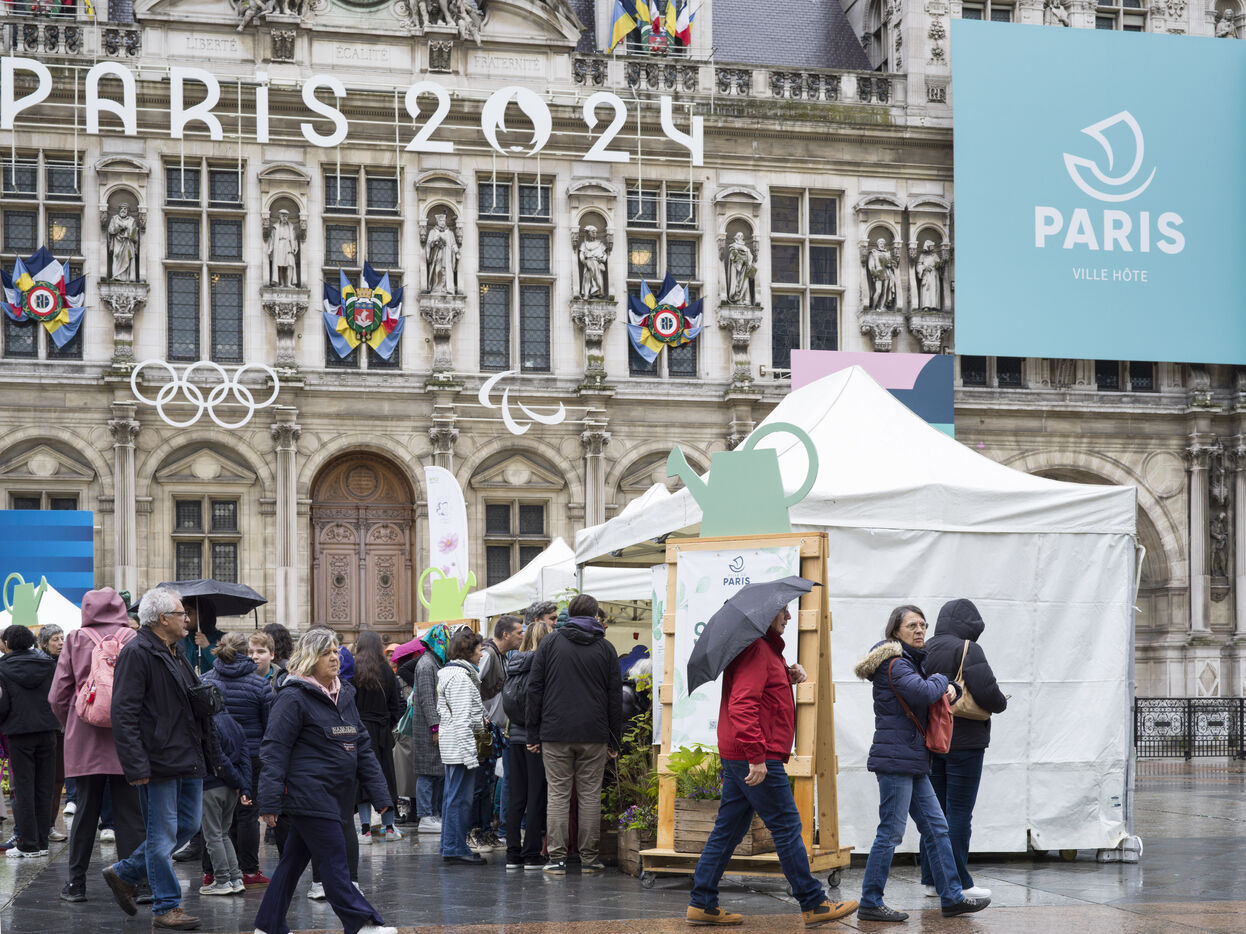 Paris fête le printemps sur la place de l'Hotel de Ville sous la pluie. La ville de Paris distribue des sachets de graines et des semis de plantes locales aux parisiennes et Parisiens désireux de contribuer à la végétalisation de la Ville et d?agir pour la biodiversité de la capitale.