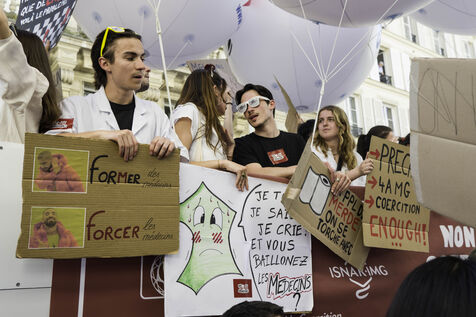 Les médecins en gréve, depuis lundi, manifestent contre la proposition de loi Garot et une contre proposition du gouvernement les obligeant à travailler 2 jours par mois en désert medical. Une manifestation part de la place du Panthéon en direction du ministère de la santé.