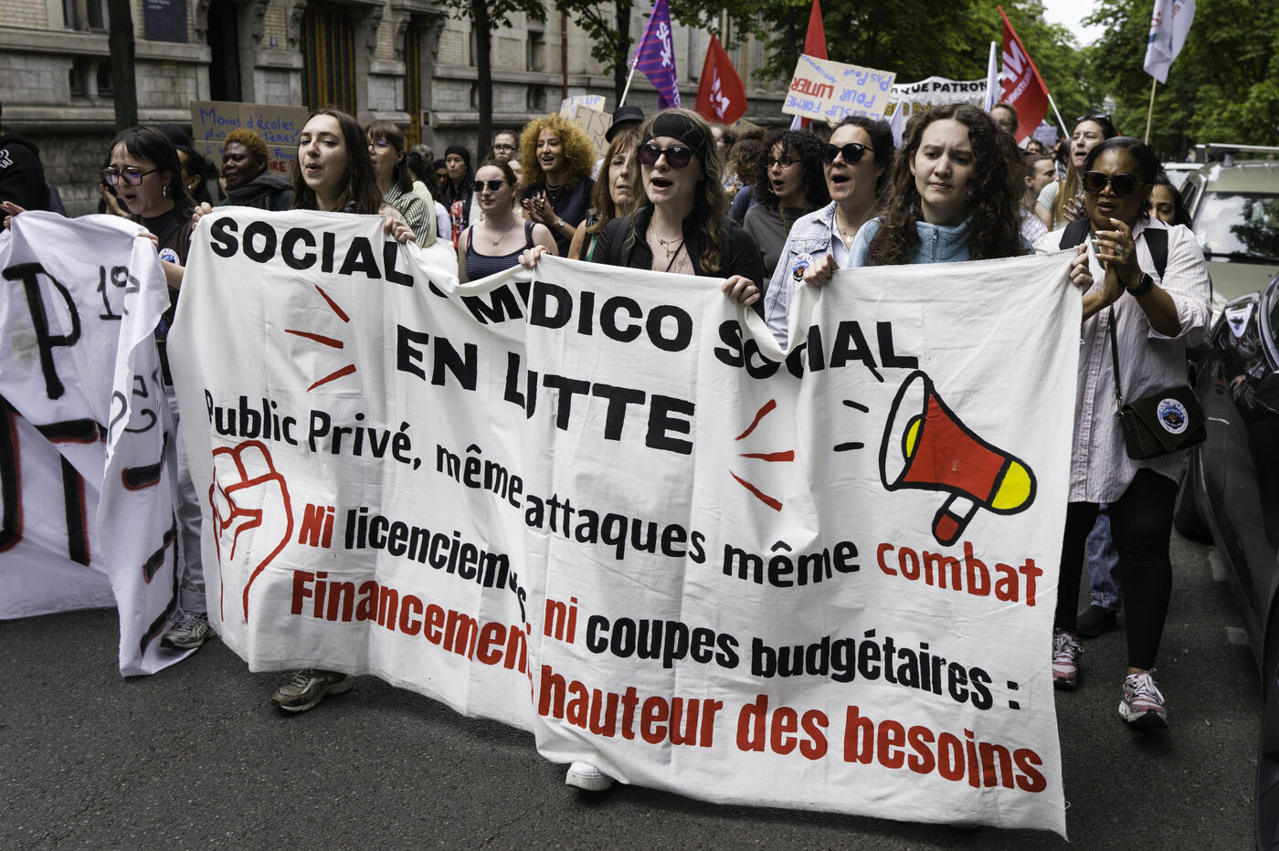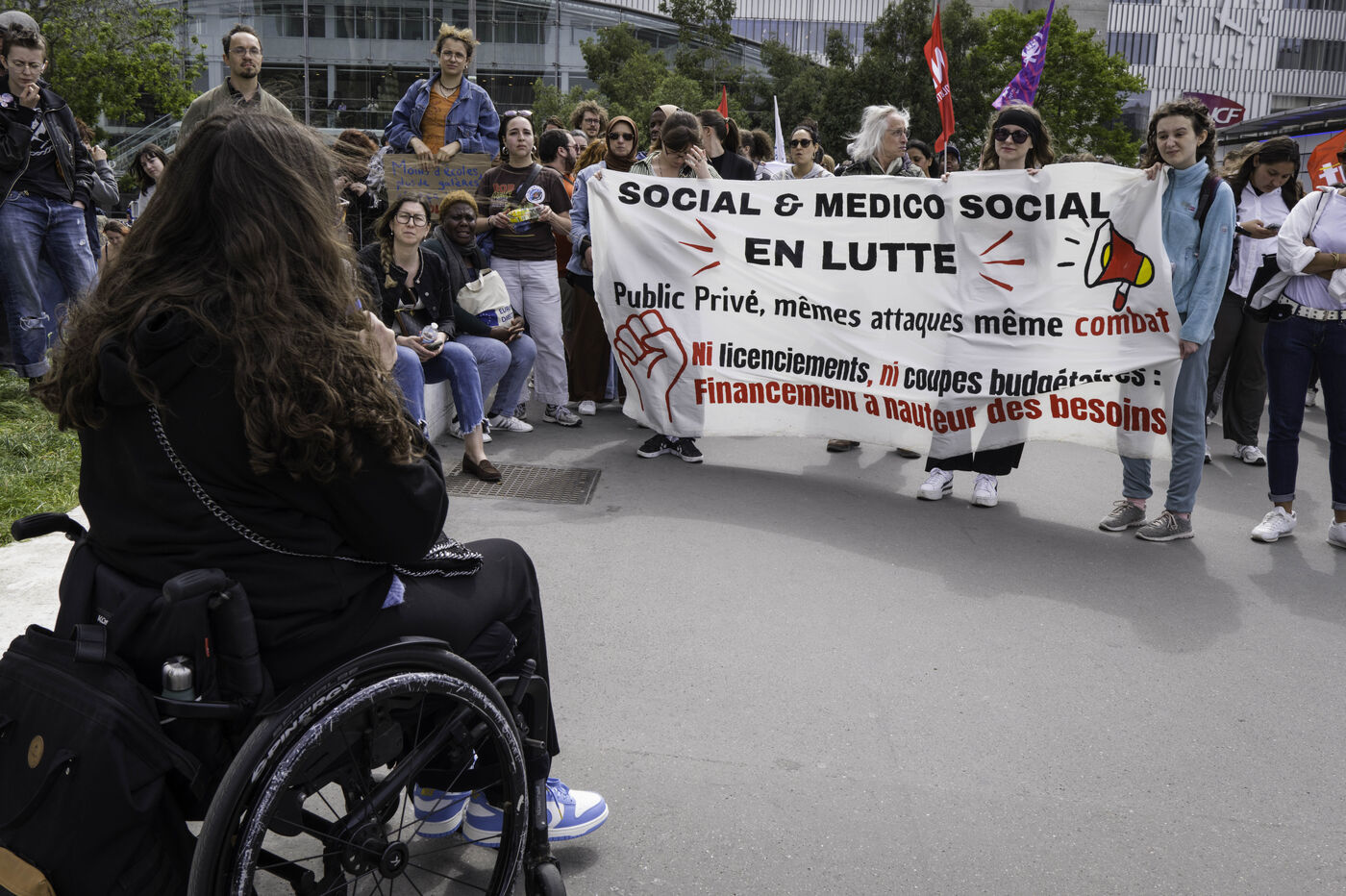 e jeune femme porte une pancarte avec le texte «Moins d’écoles, plus de galères, c’est ça la France Solidaire». Les travailleurs du secteur social et médico- social appellent à une gréve pour une hausse des salaires, de meilleurs conditions de travail et une meilleur valorisations des diplômes et des formations. Une manifestation au depart de l’Esplanade des Invalides doit se diriger vers l’ETSUP au pied de la tour Montparnasse.