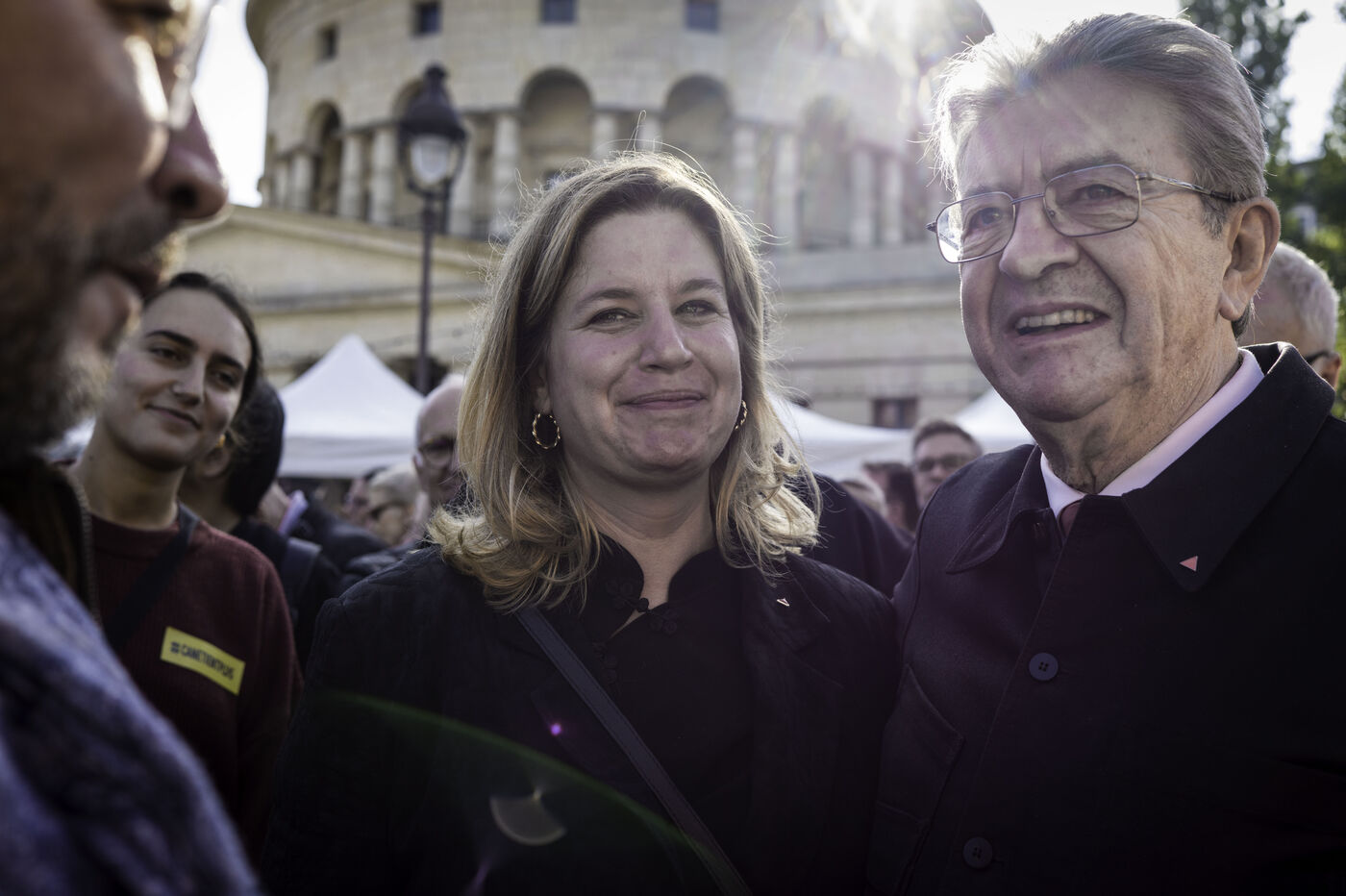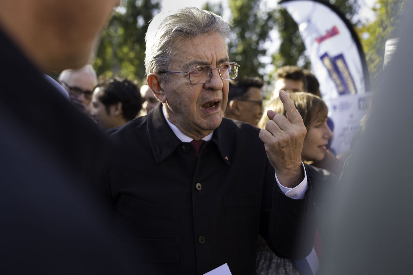 A Paris, Jean Luc Mélenchon vient soutenir les associations qui se mobilisent contre les coupes budgétaires, place Stalingrad.