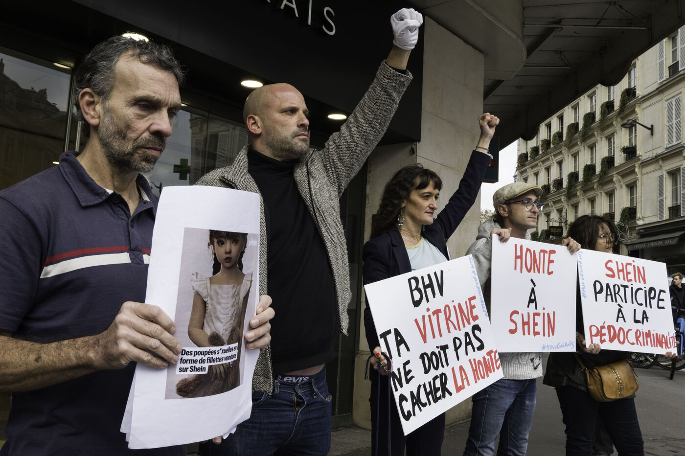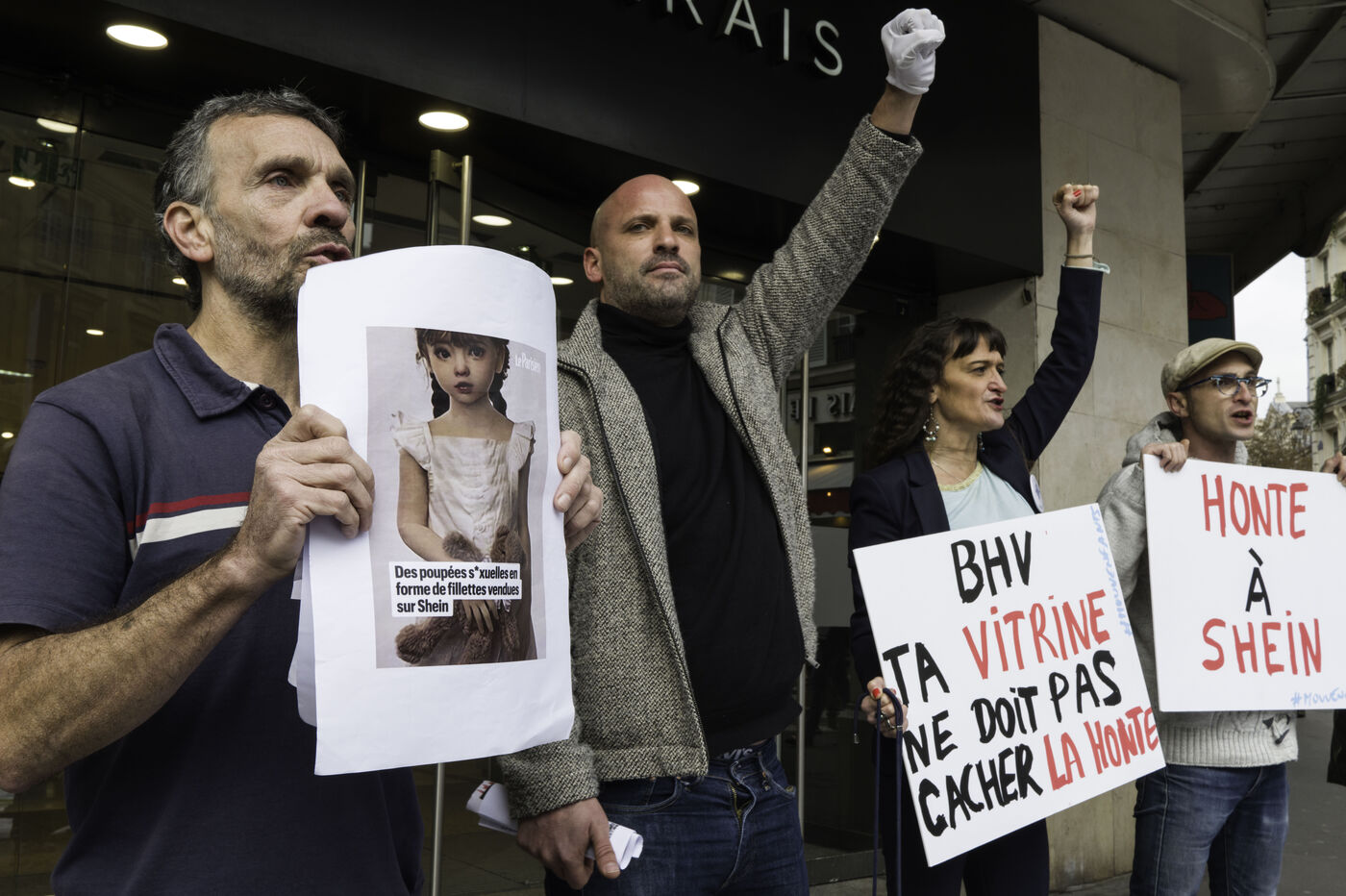 Des poupées à caractère sexuel ont été découvertes début novembre sur la plateforme d’e-commerce Shein. Le 5 novembre 2025, le géant chinois de l’ultra fast fashion Shein, va ouvrir un corner de 1200 m2 au sein du grand magasin du BHV Marais. L’association Mouv’Enfants a manifesté devant l’entrée du magasin.