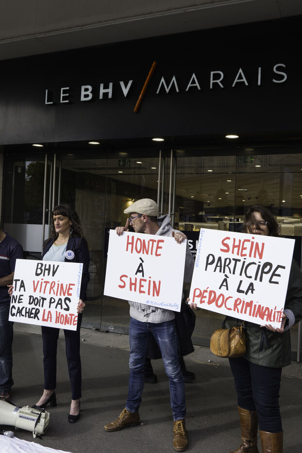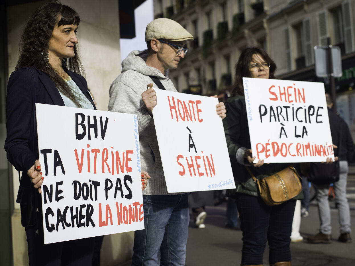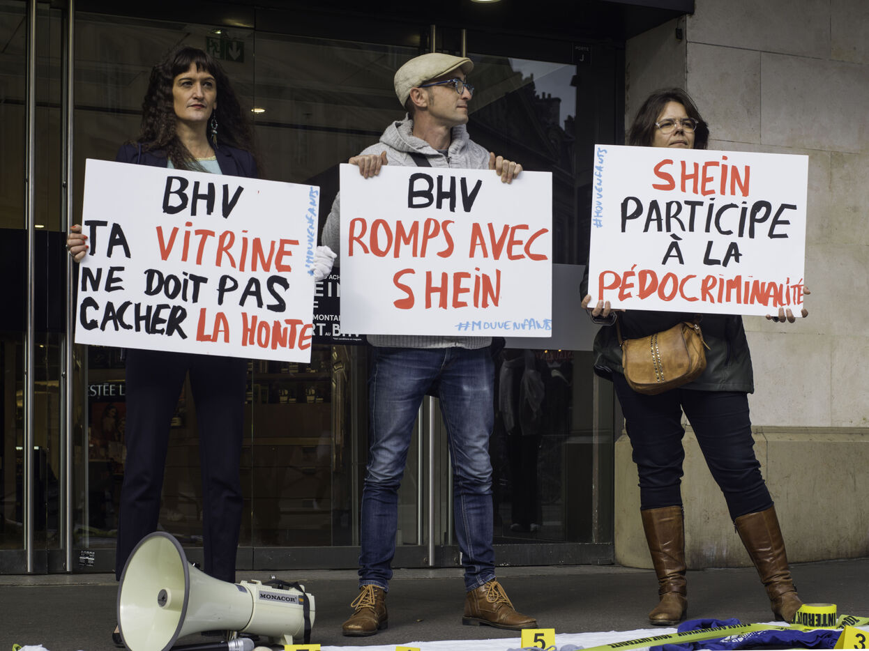Sexually suggestive dolls were discovered in early November on the Shein e-commerce platform. On 5 November 2025, Chinese ultra-fast fashion giant Shein will open a 1,200 m² corner in the BHV Marais department store. The Mouv’Enfants association protested in front of the store entrance.