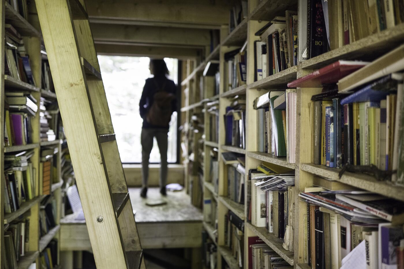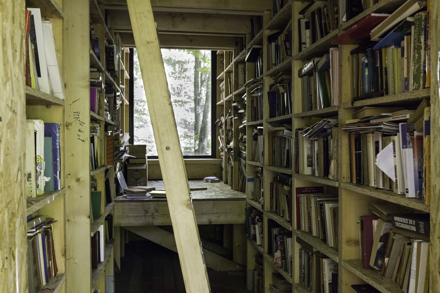 Dans la forêt de Csinger, une cabane en bois a été imaginée par des étudiants de l’Université d’art et design de Moholy- Nagy en 2022. C’est un cabane de lecture. Les 2 grandes murs latéraux sont recouverts d’étagère sur 3 niveaux. Elle permet également le bivouac pour 3 personnes au milieu d’une forêt de hêtre.