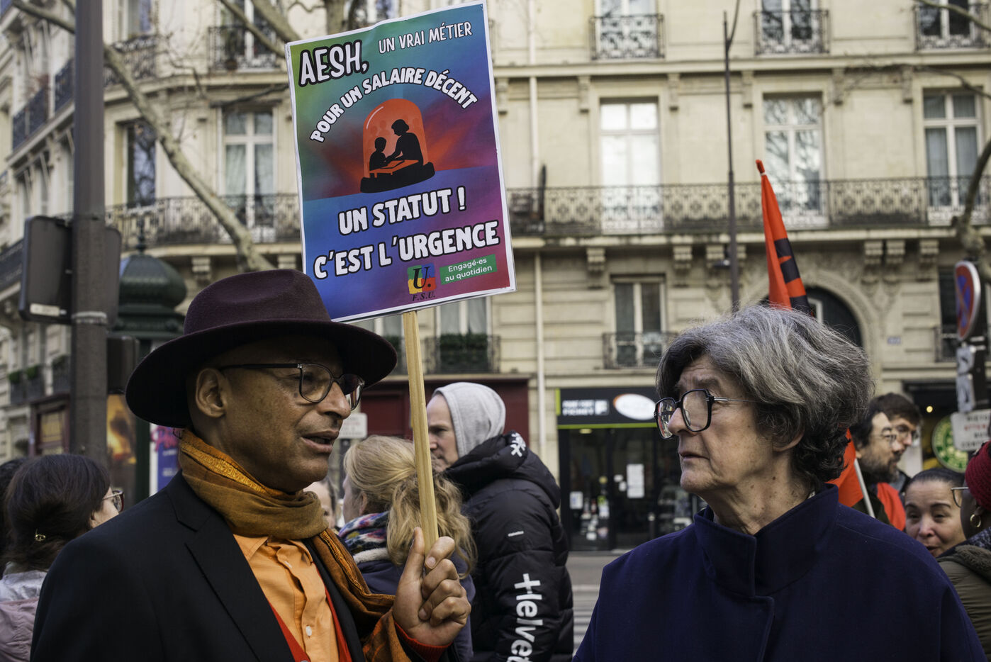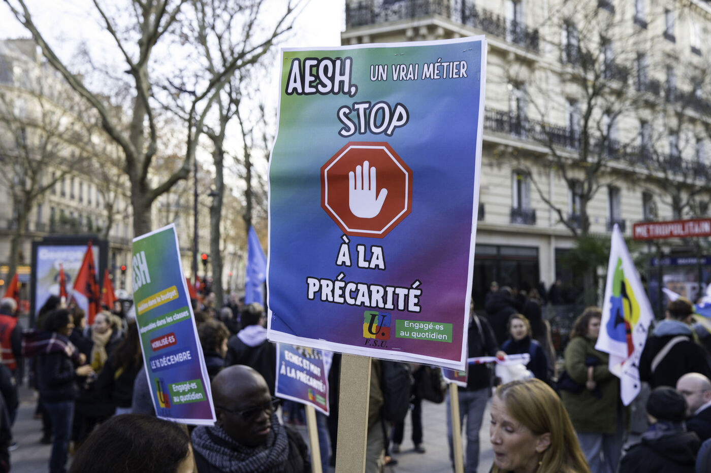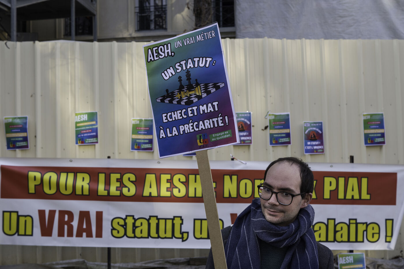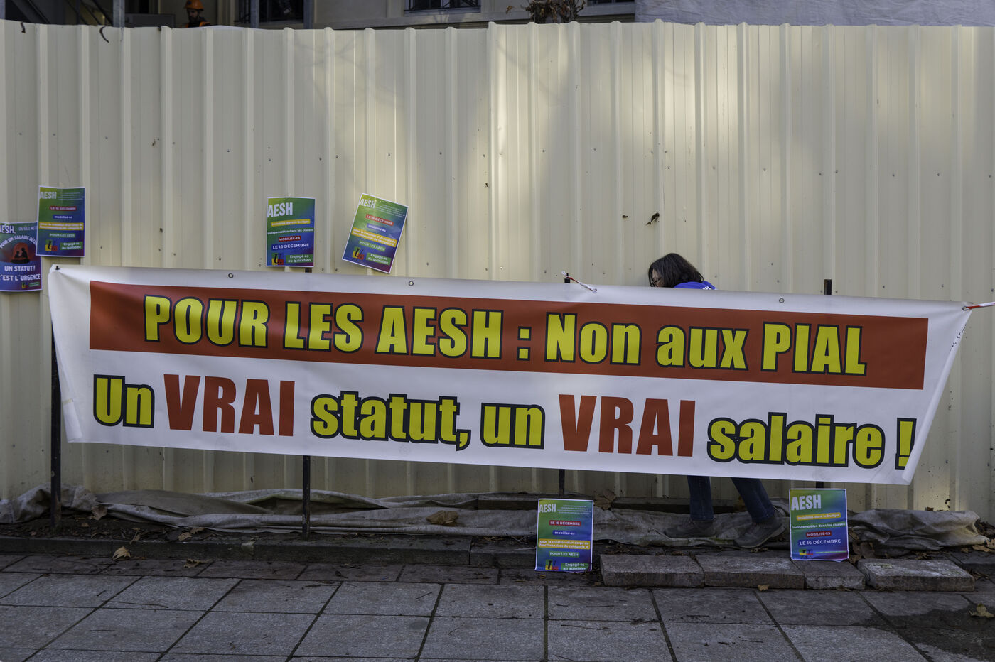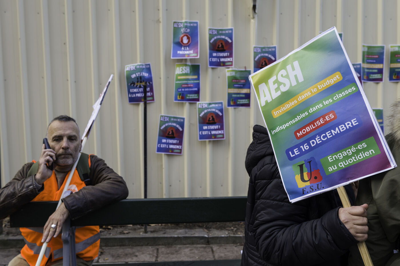 AESH and AEd staff are on strike and gathering at Place de Bainville in Paris's 7th arrondissement to demand proper pay and status. AESH and AED jobs are the most precarious in the French education system.