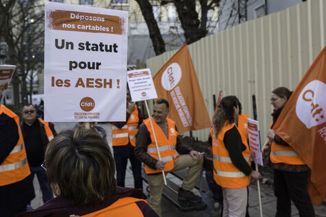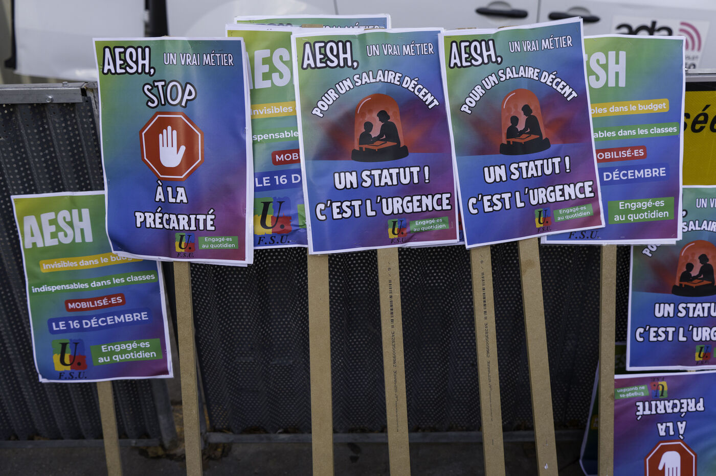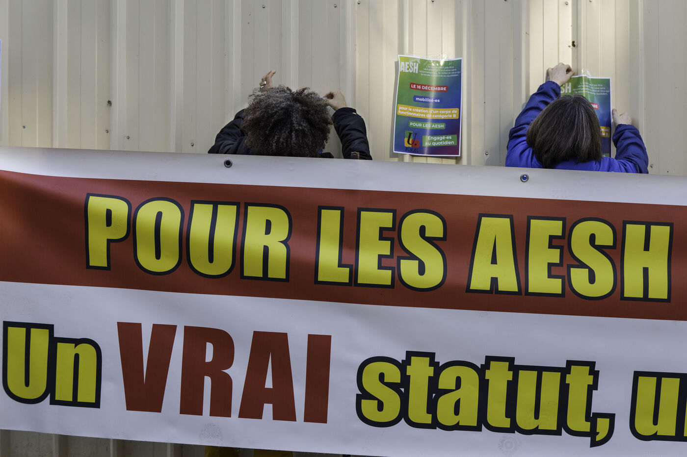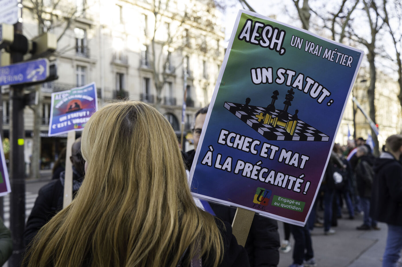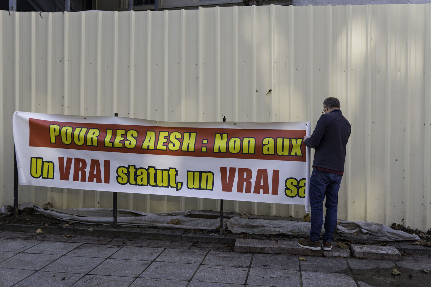 AESH and AEd staff are on strike and gathering at Place de Bainville in Paris's 7th arrondissement to demand proper pay and status. AESH and AED jobs are the most precarious in the French education system.