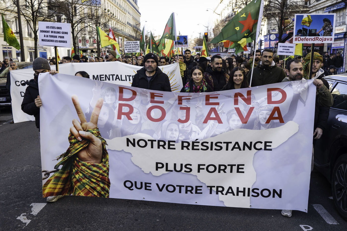 Le HTS, gouvernement transitoire de Damas, déclenche une guerre contre le peuple kurde de Syrie afin de consolider son contrôle sur l’ensemble du territoire. Une manifestation de soutien au Rojava est organisée place de la République.