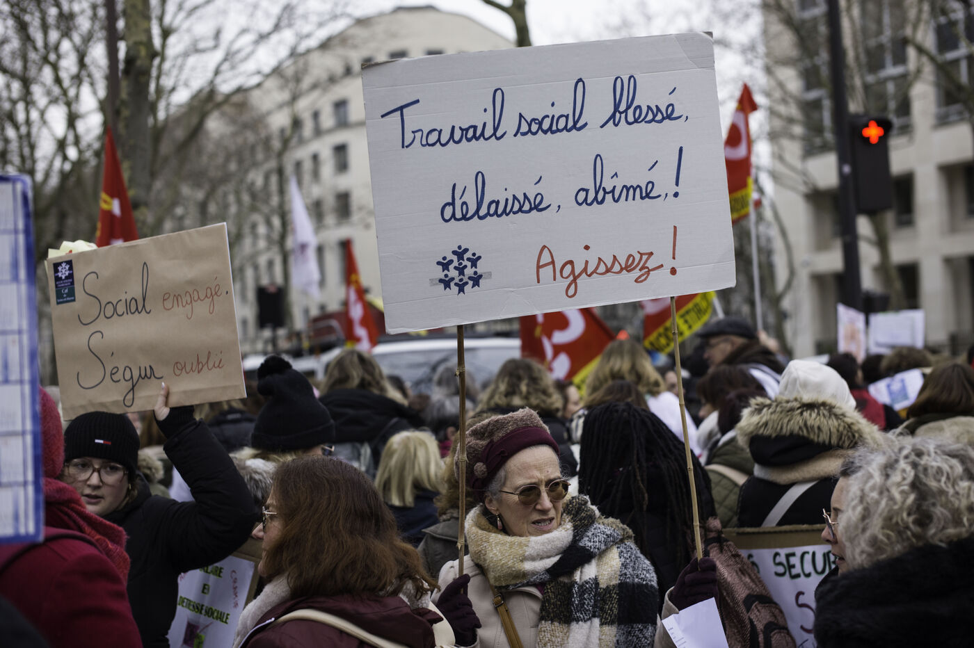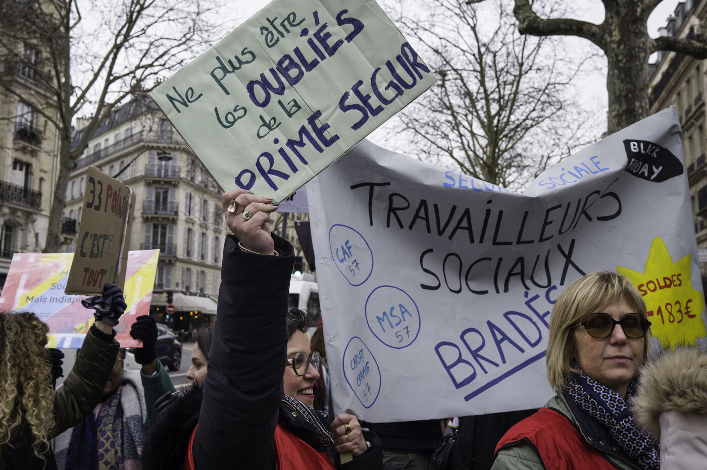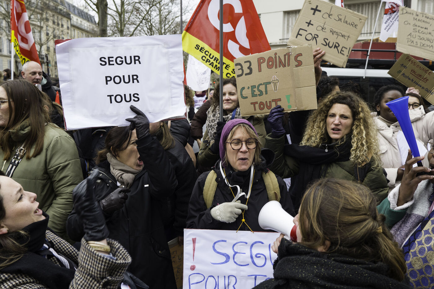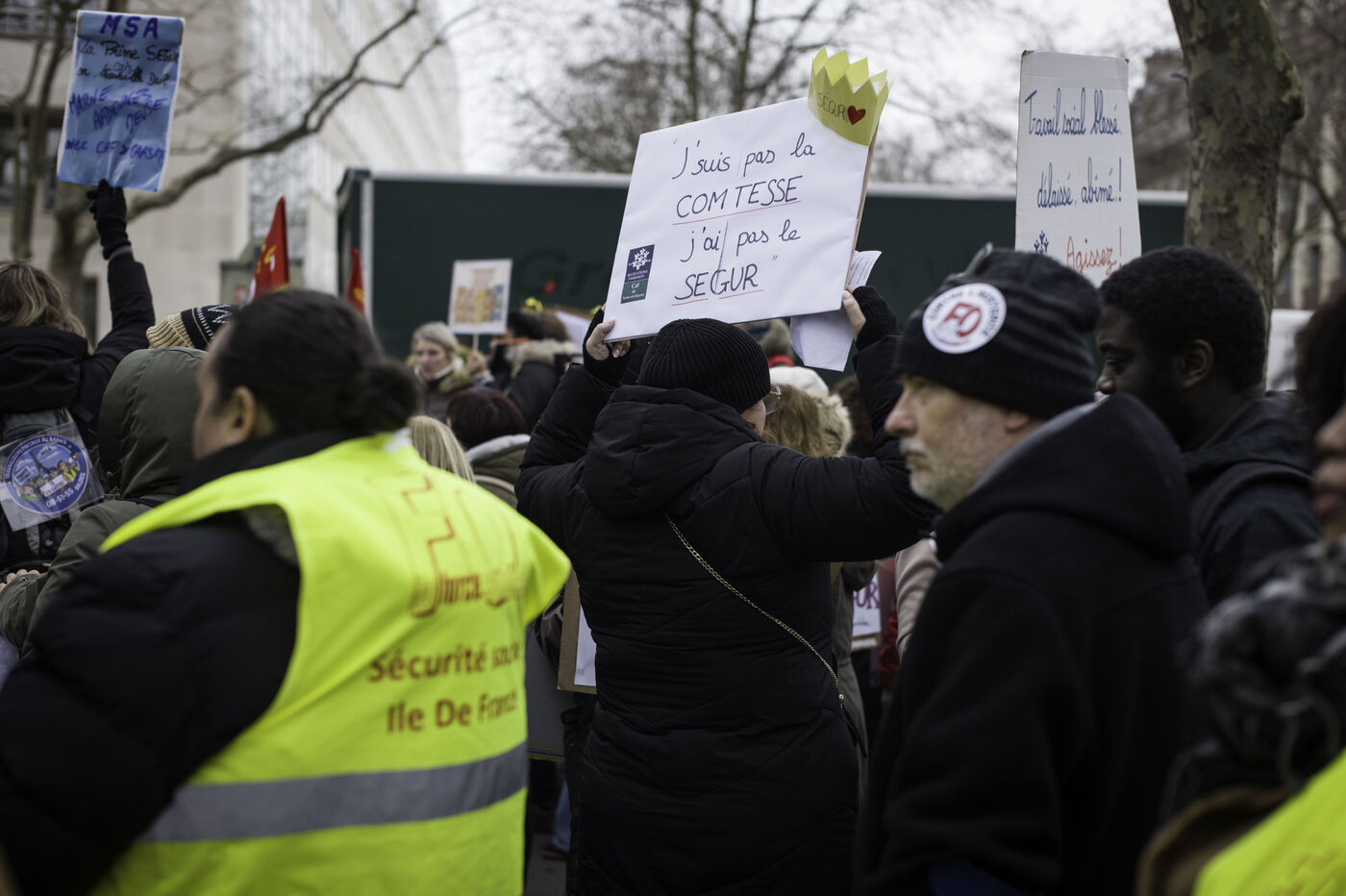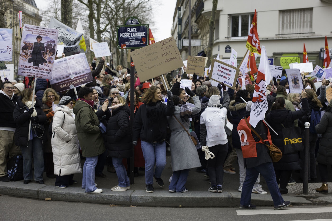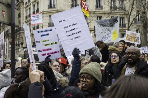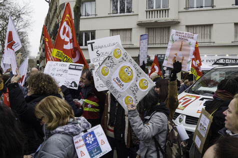 Social workers on strike are demanding the €183 Ségur bonus and recognition of their three-year post-secondary diploma at level 6. They are gathering in front of the Ministry of Health to make their voices heard.