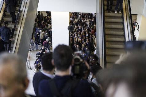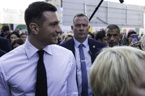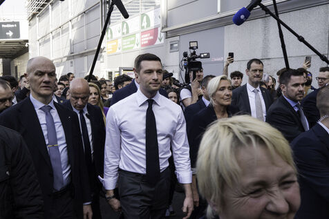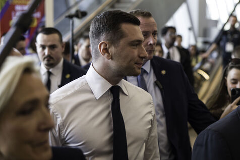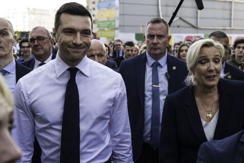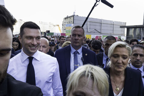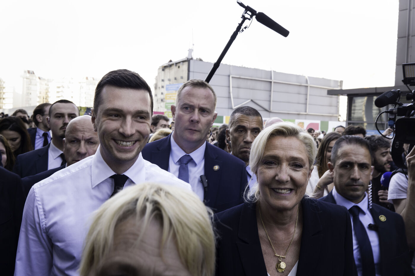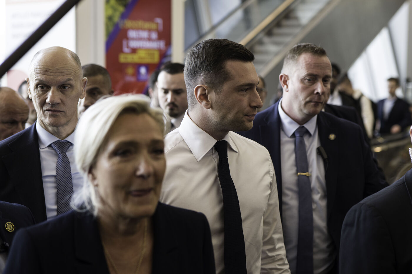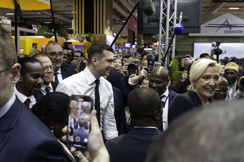 Marine Le Pen, president of the National Rally in the Assembly, and Jordan Bardella, Member of the European Parliament, walk the aisles of the International Agricultural Show during the presidential campaign.