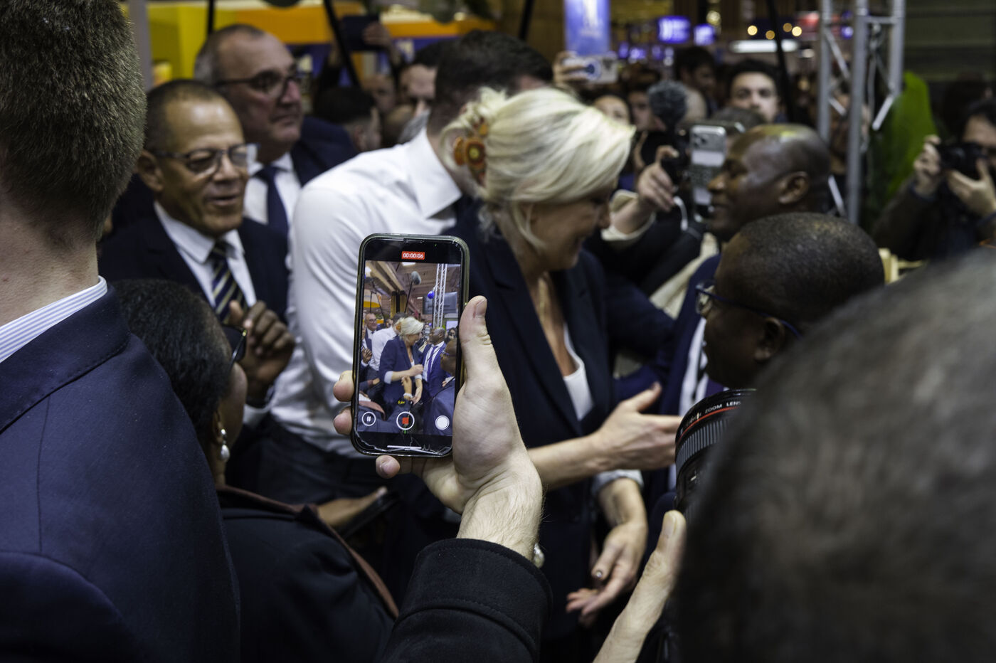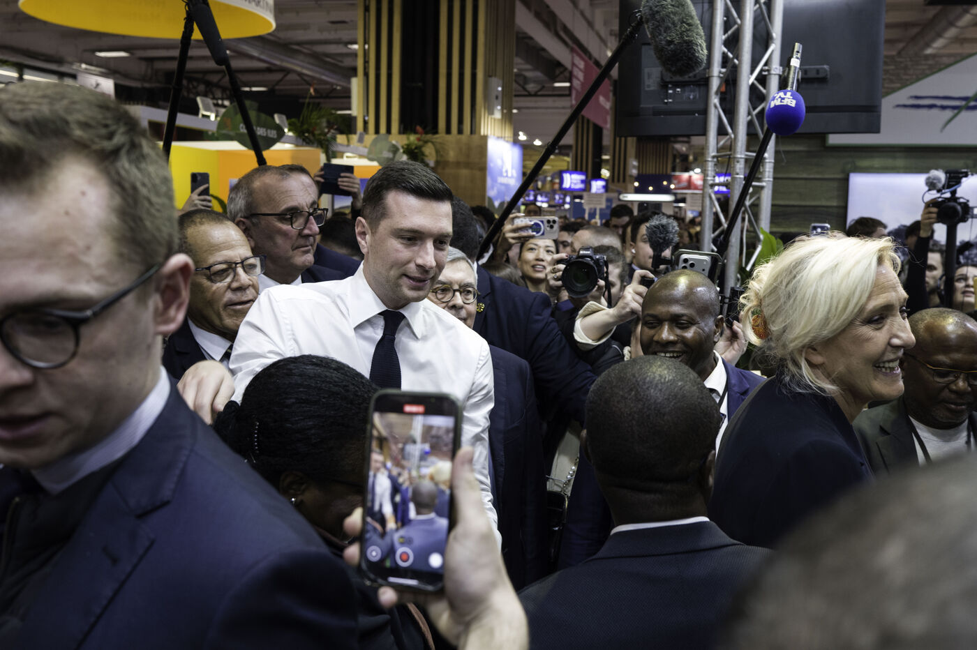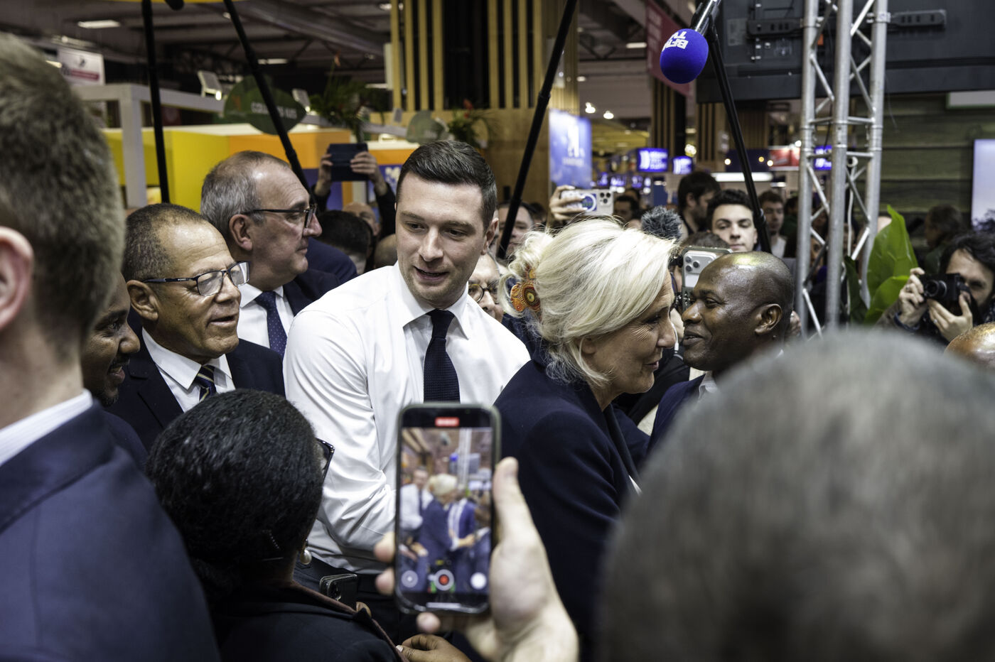 Marine Le Pen, présidente du Rassemblement nationale à l'Assemblée et Jordan Bardella, député Européen arpentent les allées du salon international de l’Agriculture en campagne présidentielle.