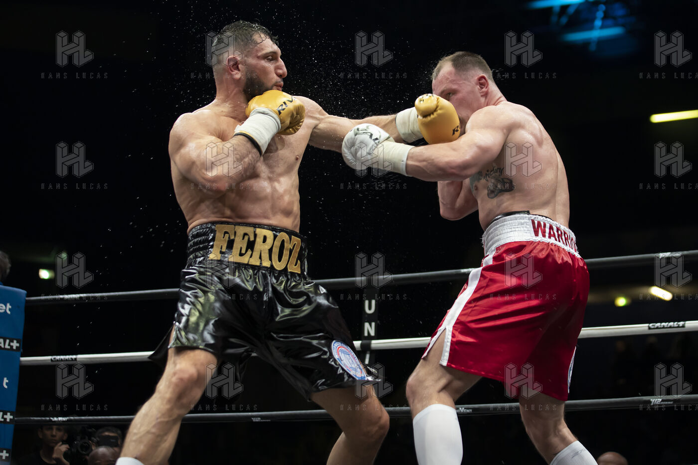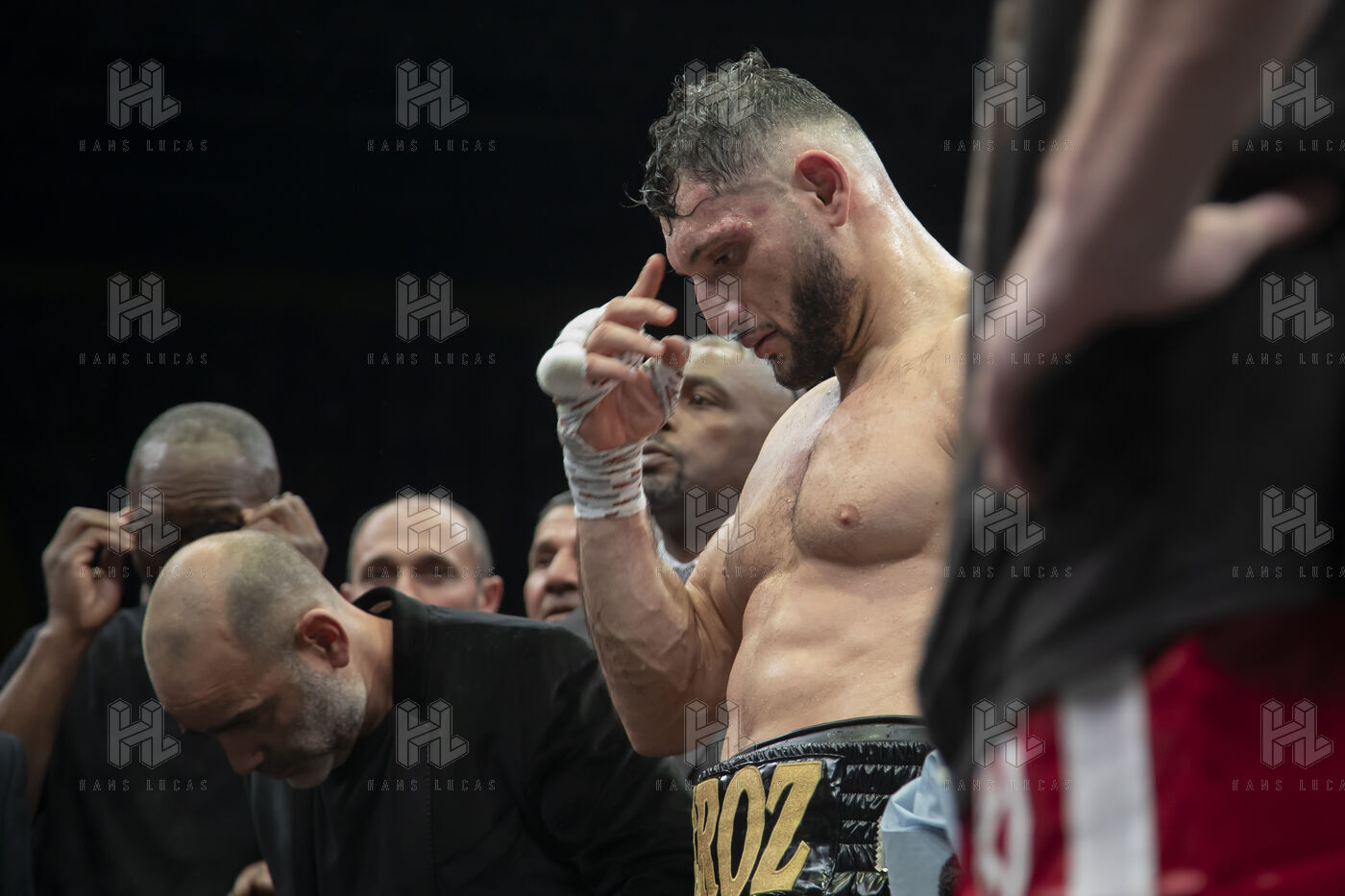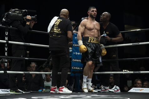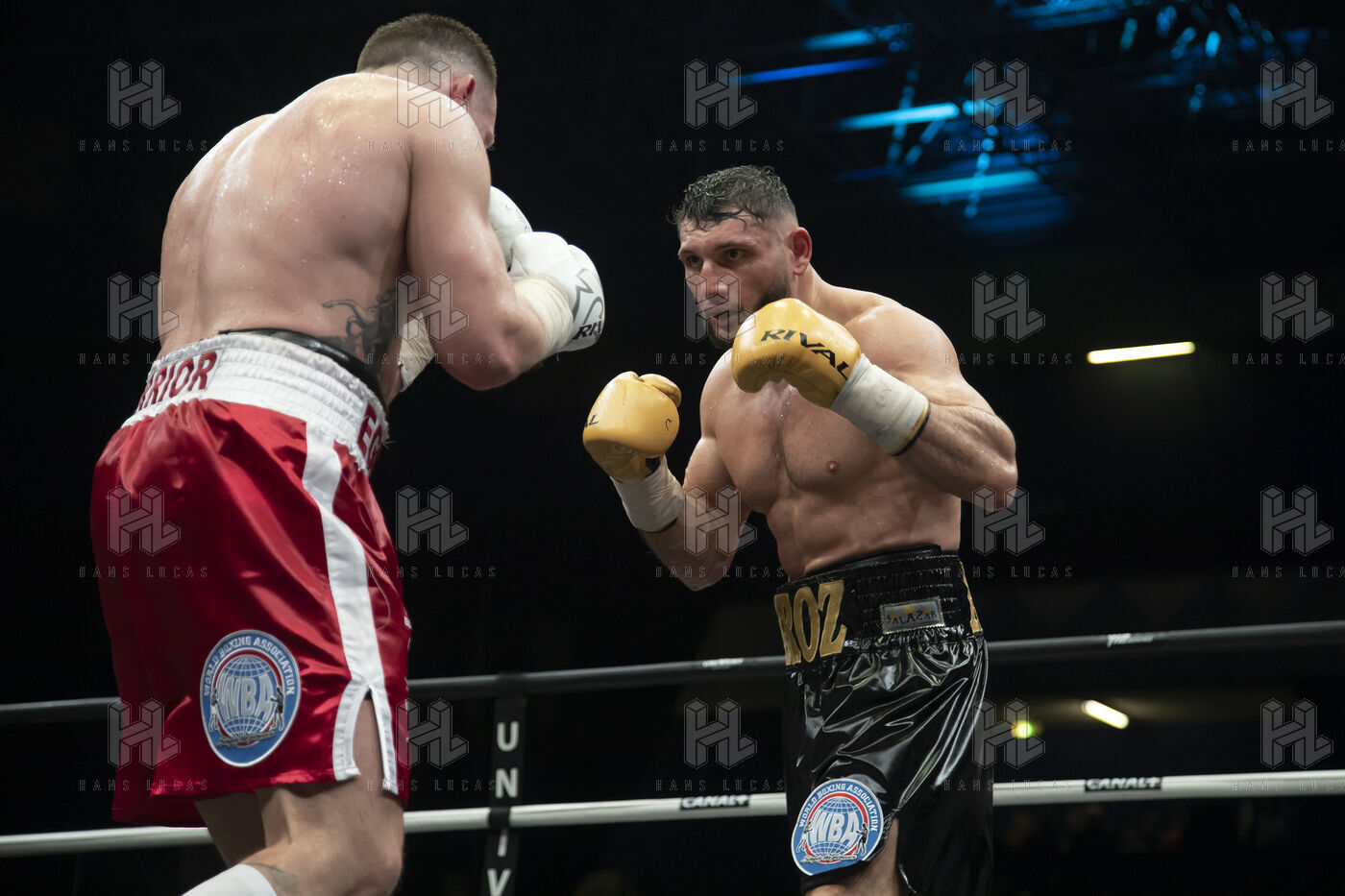 Le champion du monde français d origine armenienne Arsen Goulamirian affronte le boxeur russe Alexei Egorov lors du championnat du monde WBA des lourds-légers.