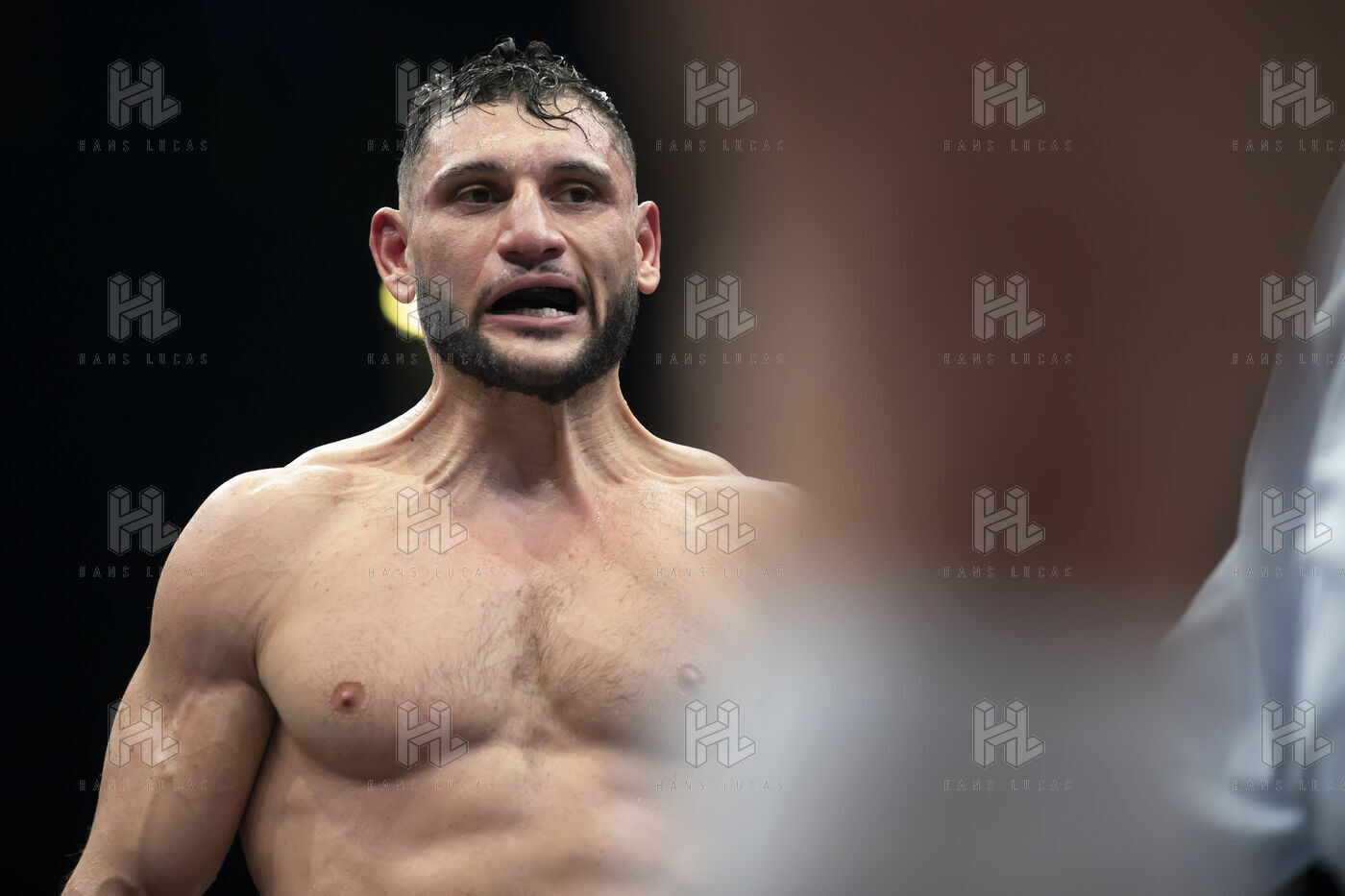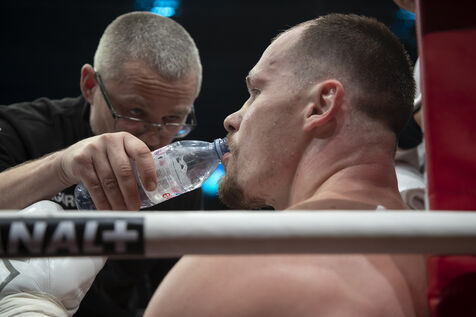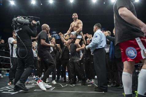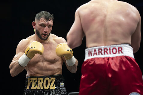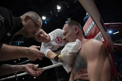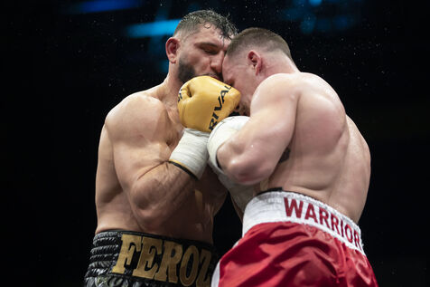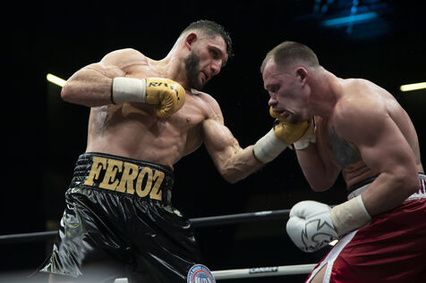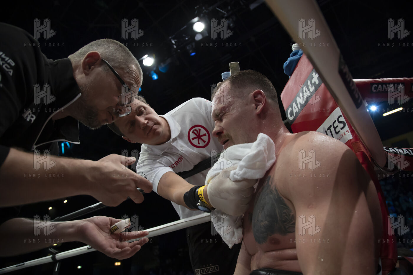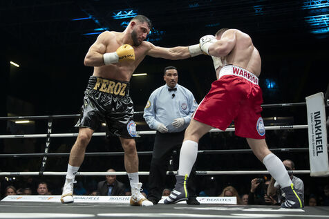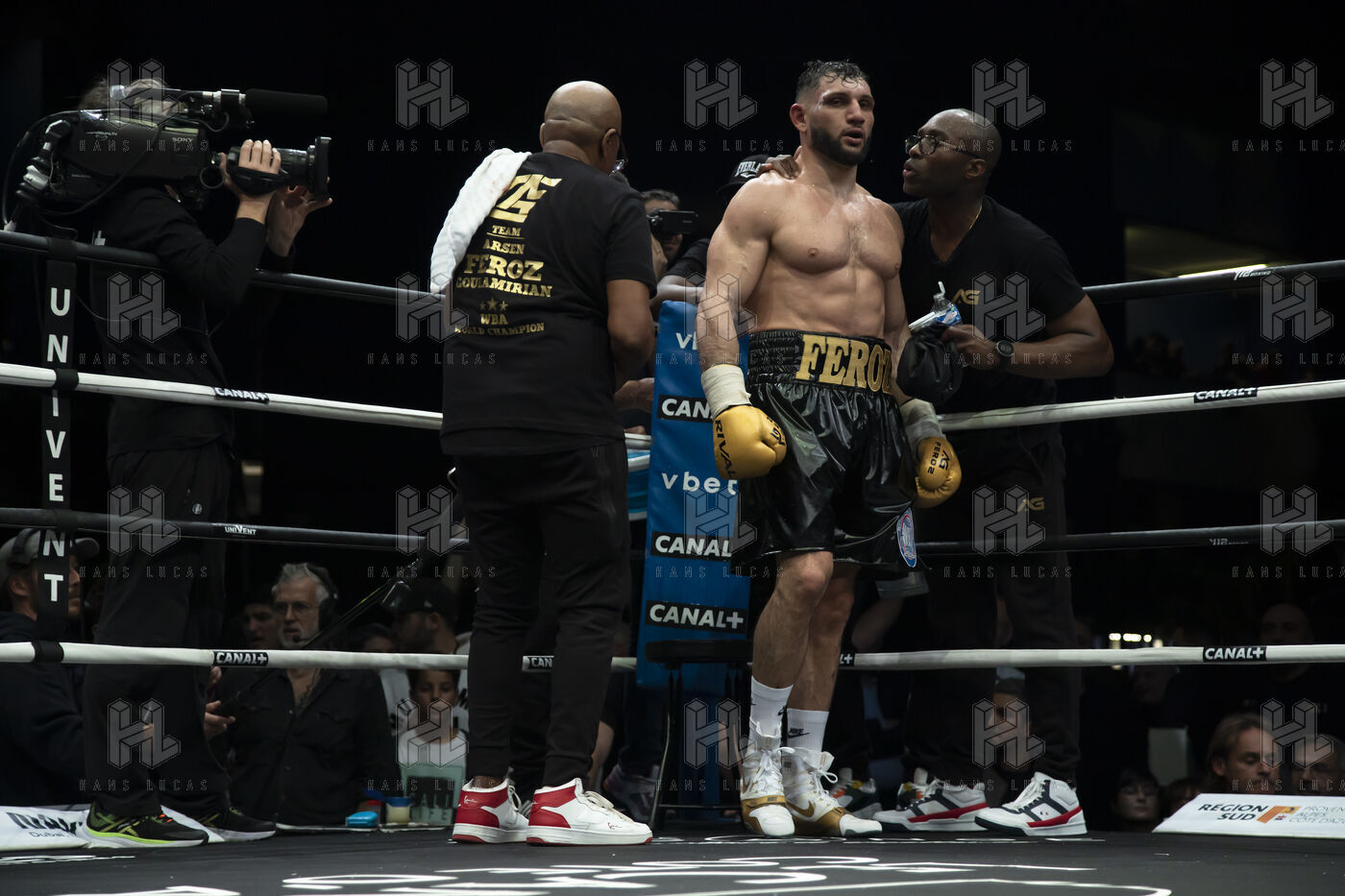 Le champion du monde français d origine armenienne Arsen Goulamirian affronte le boxeur russe Alexei Egorov lors du championnat du monde WBA des lourds-légers.