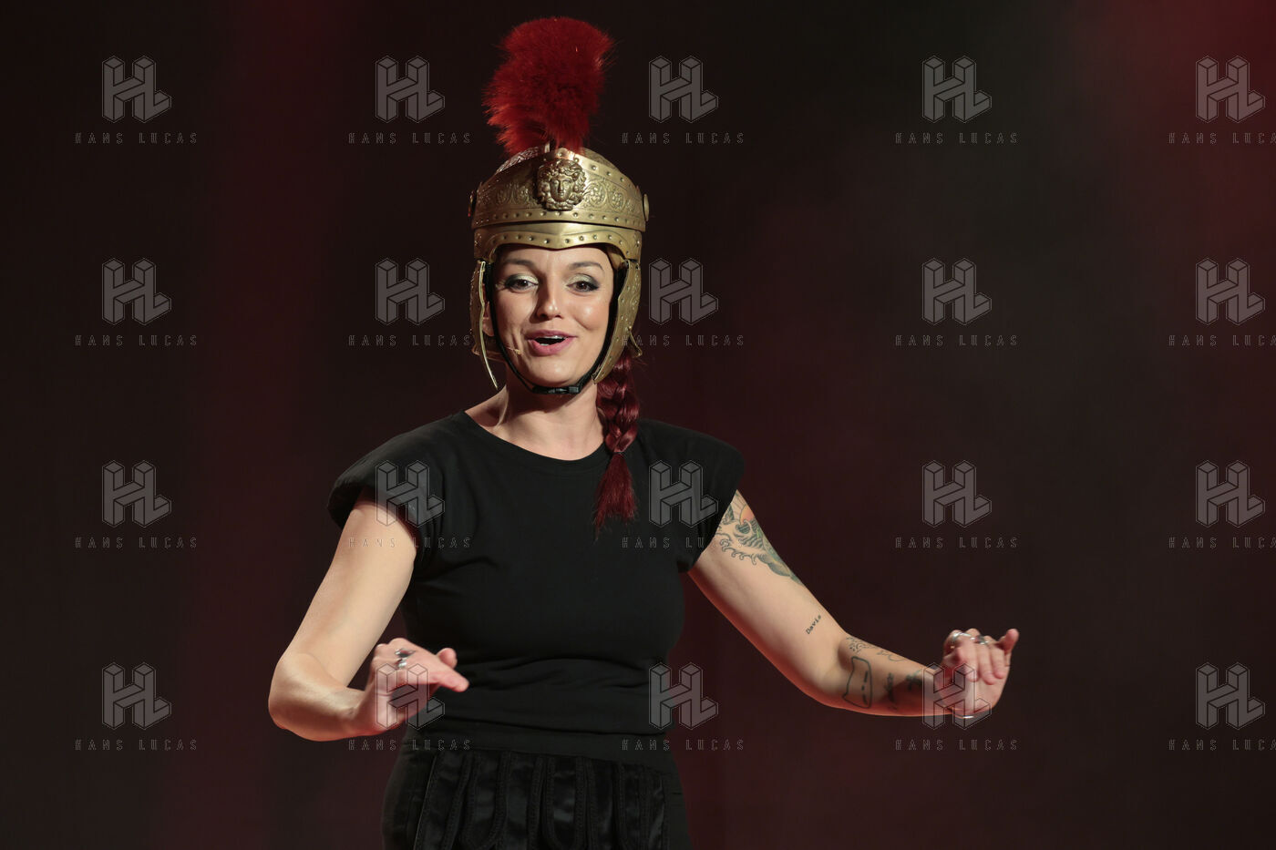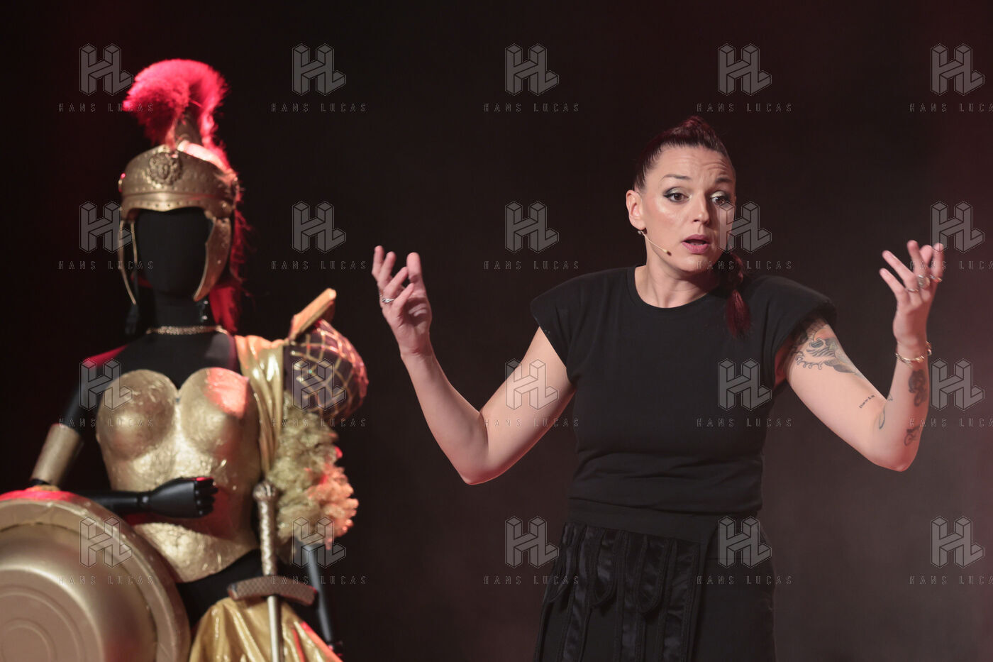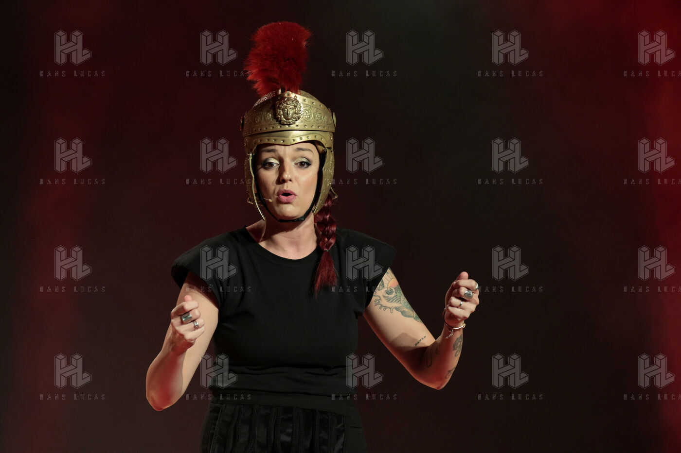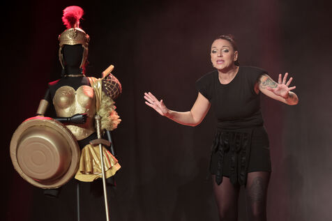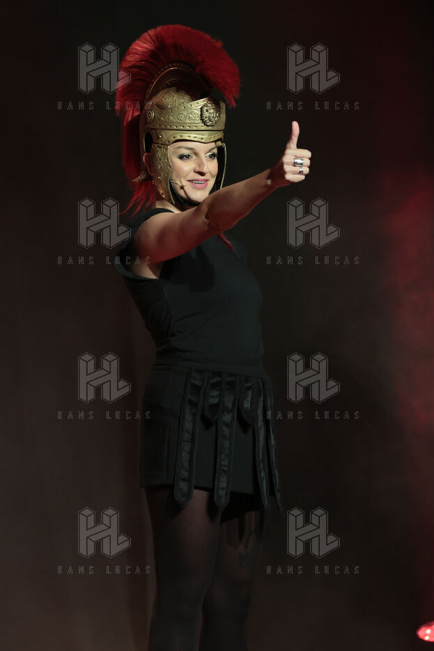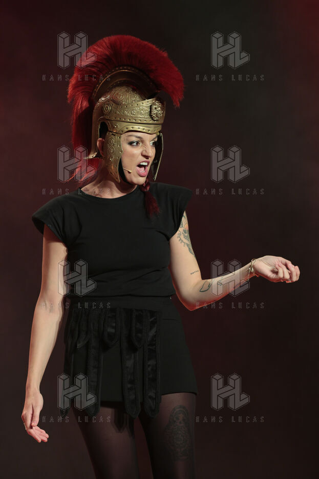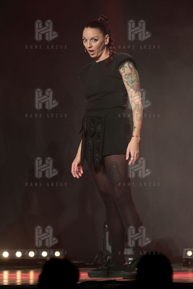 Actress and comedian Laura Calu performs on stage at the "Les Royals du Rire" Festival at the Joa Casino in Mandelieu.