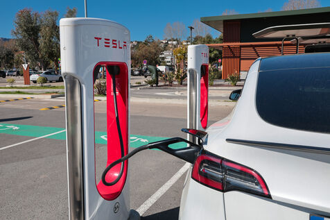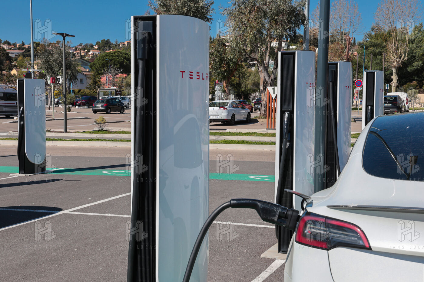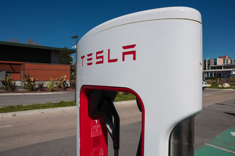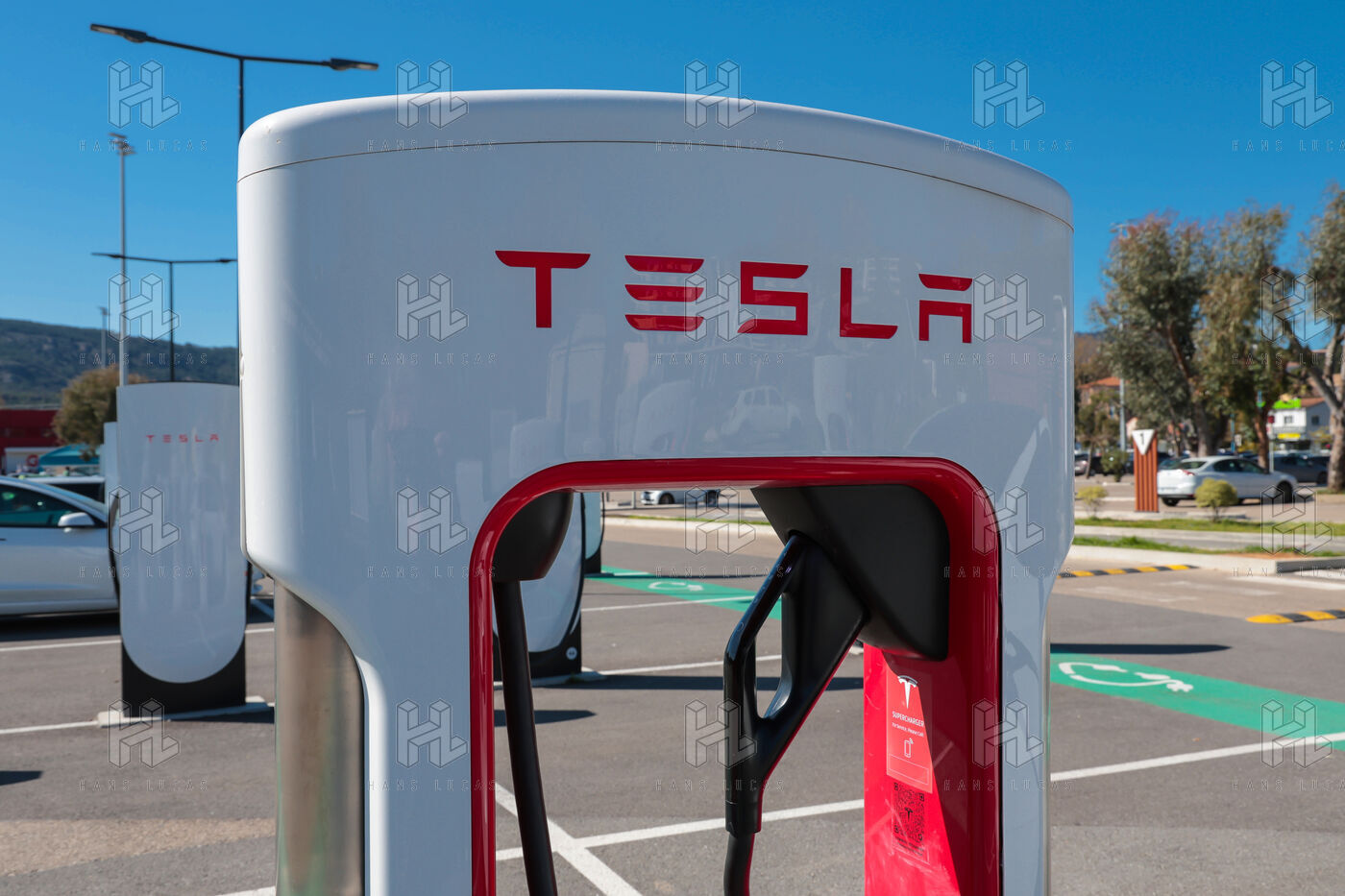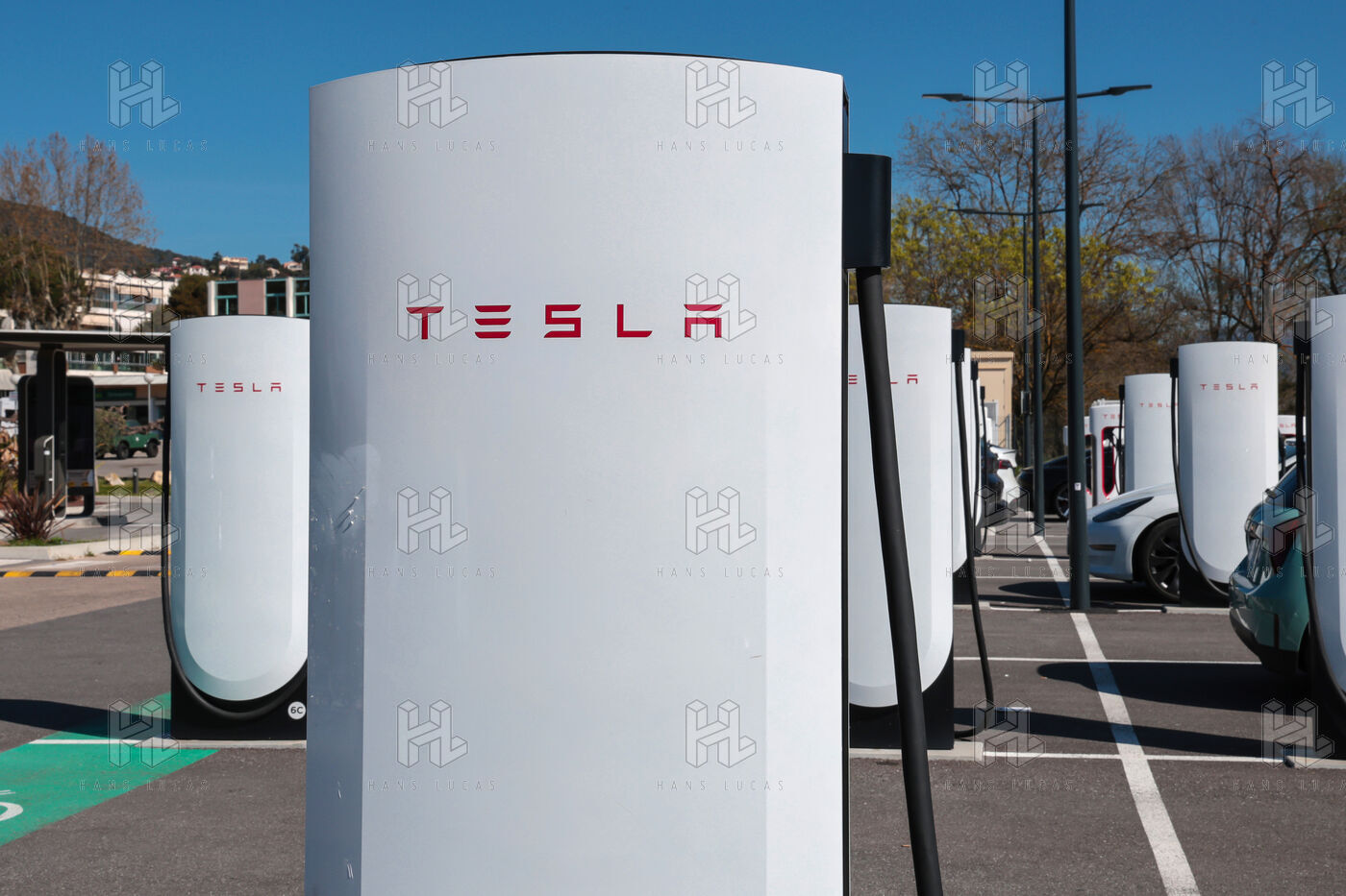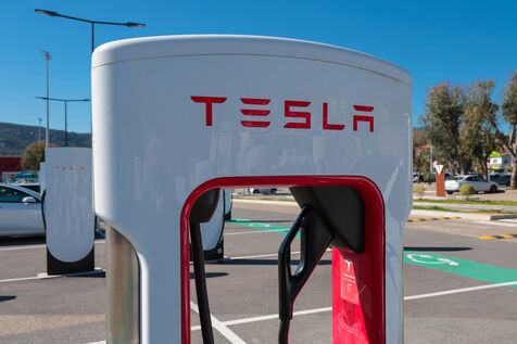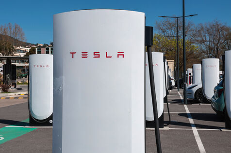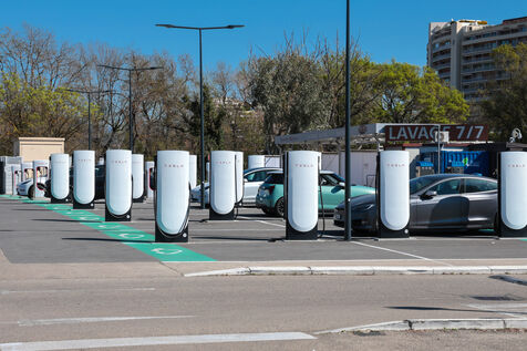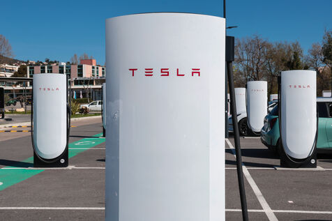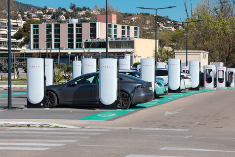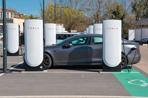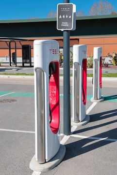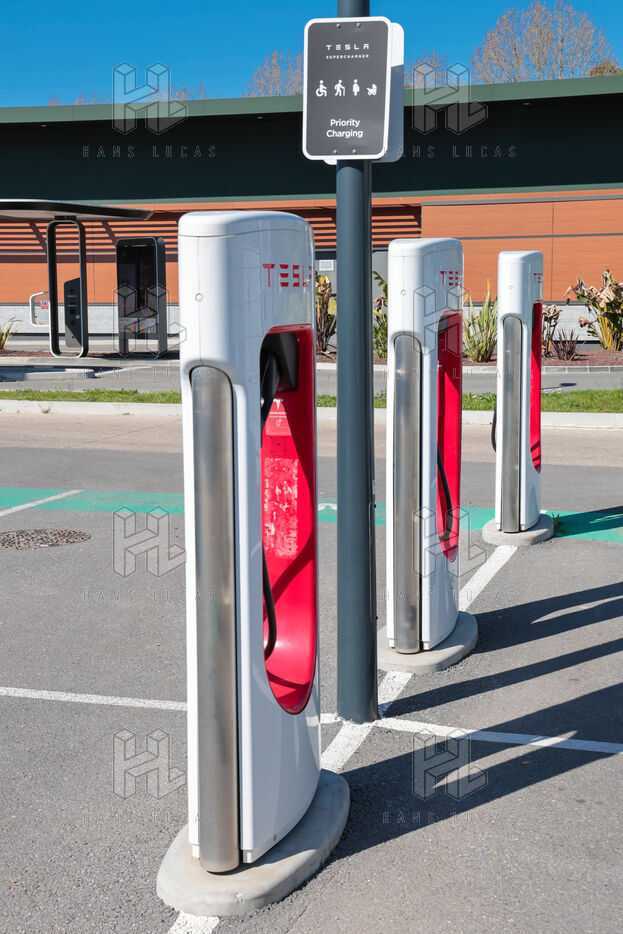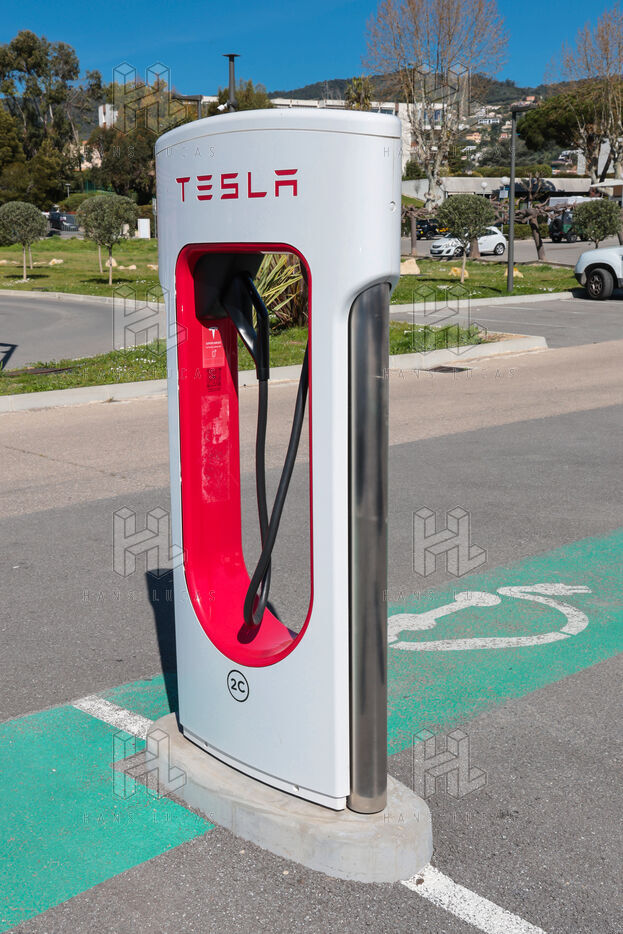 View of a Tesla Supercharger station for all electric vehicles equipped with a conventional CCS charging port.