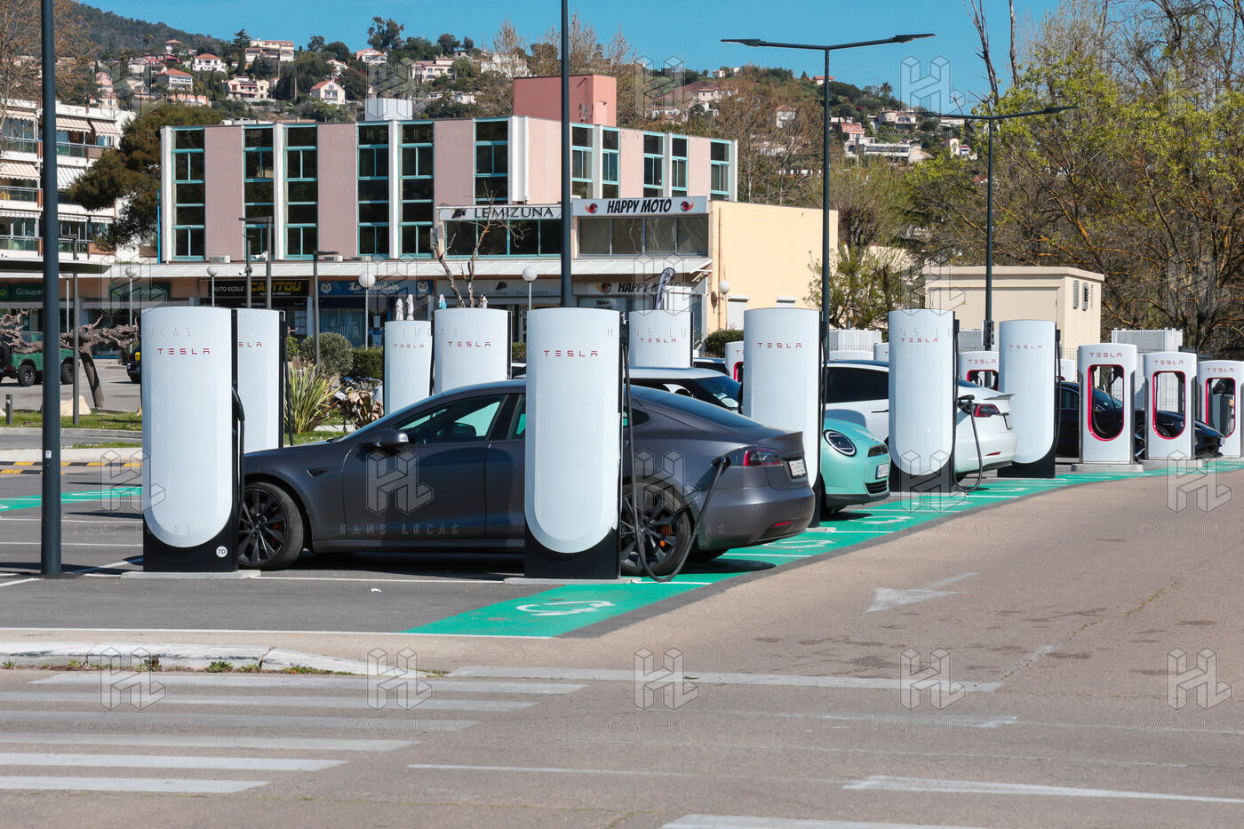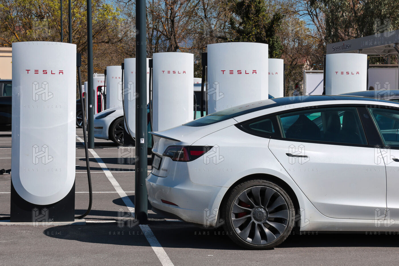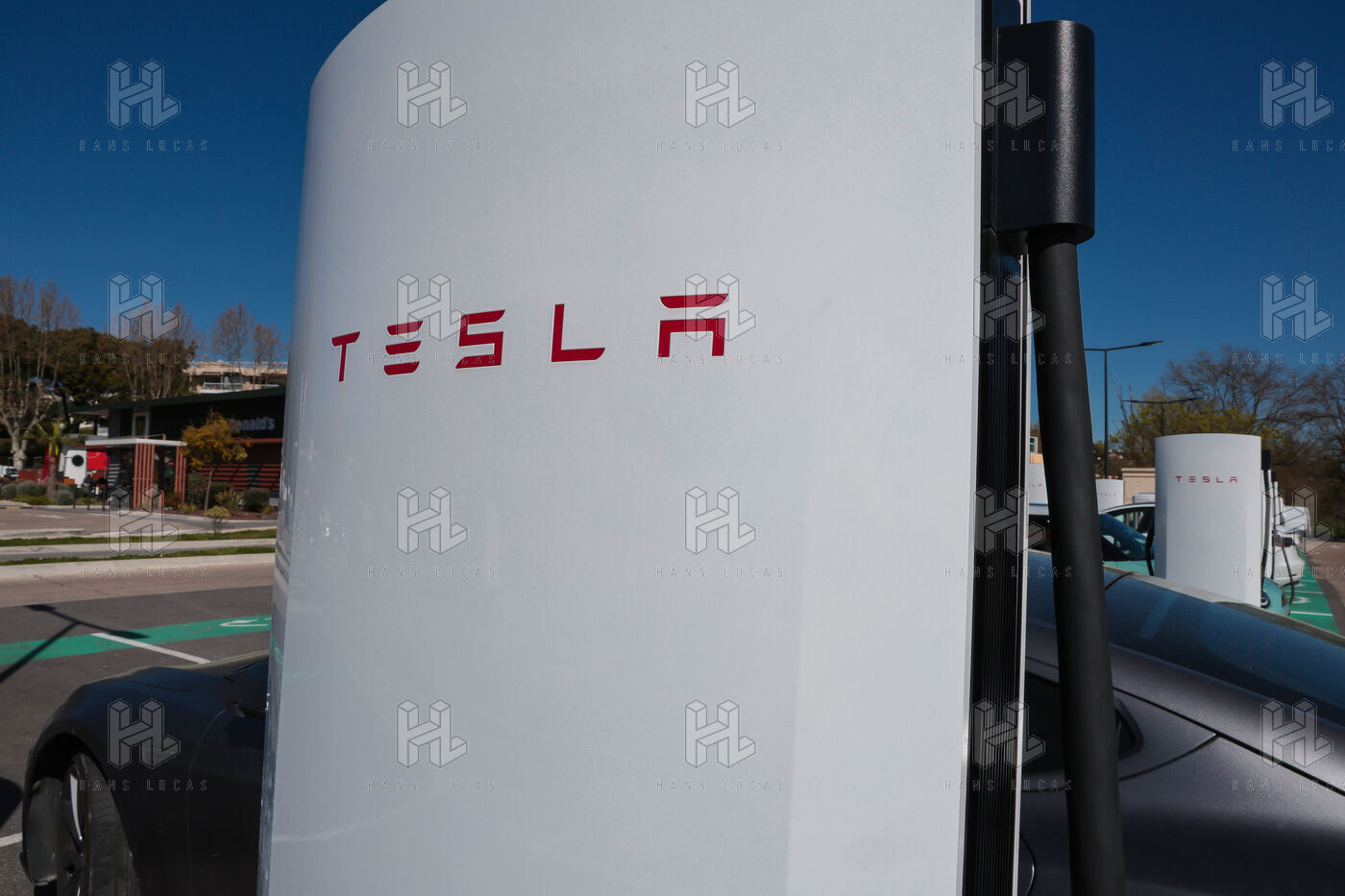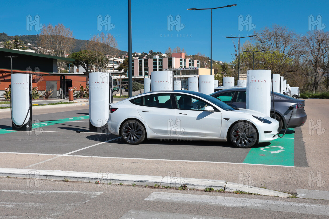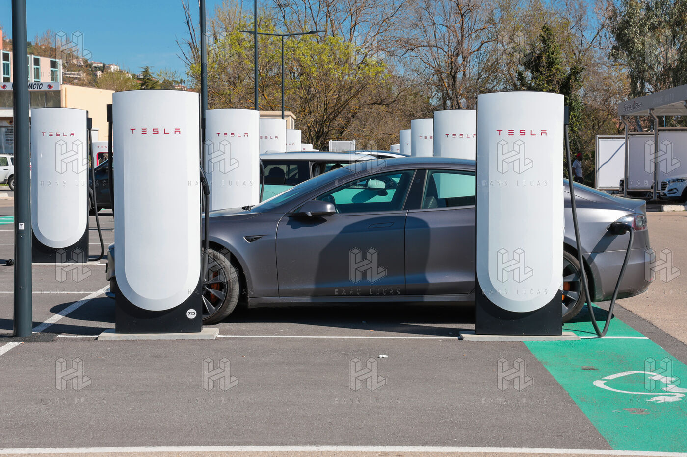 View of a Tesla Supercharger station for all electric vehicles equipped with a conventional CCS charging port.