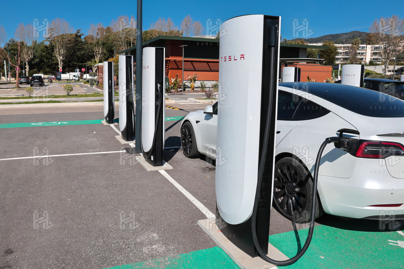 Vue d une station Superchargeur Tesla pour tous véhicules électriques dotés d un port de recharge CCS classique.
