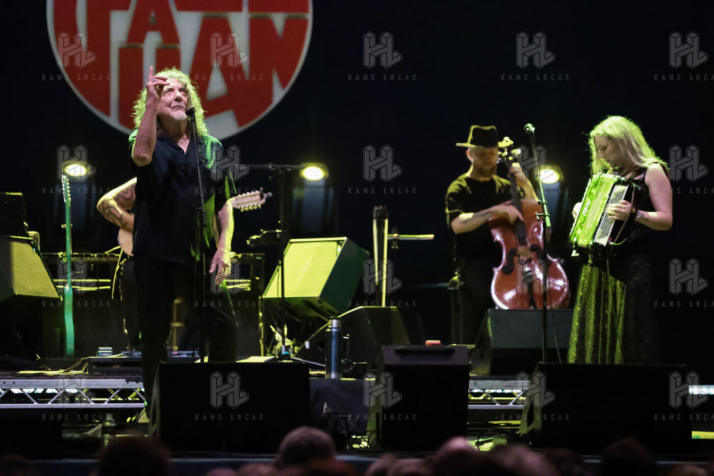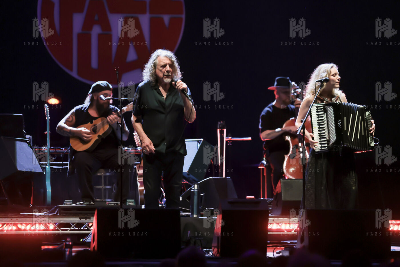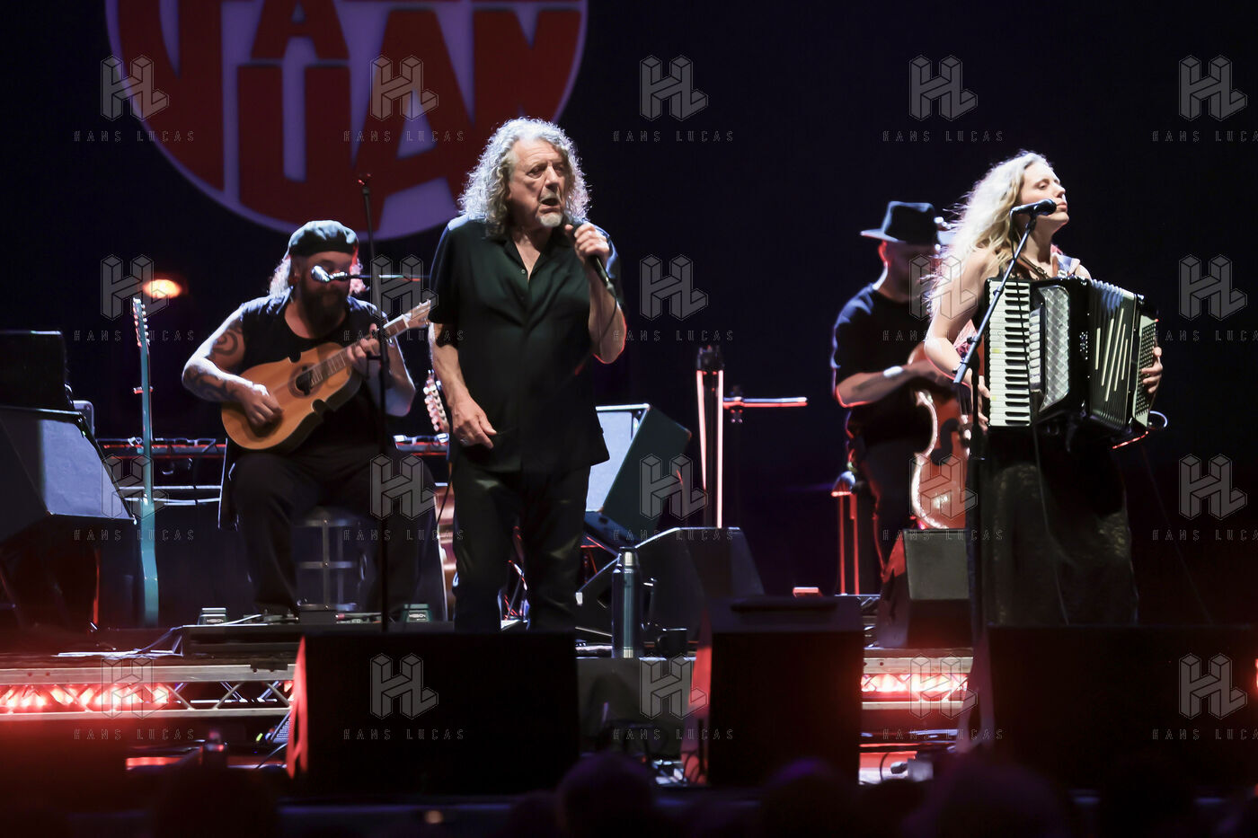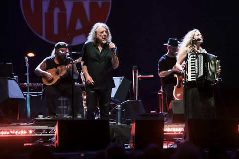 Robert Plant se produit avec son groupe Saving Grace et Suzi Dian sur la scène du festival Jazz à Juan 2025.