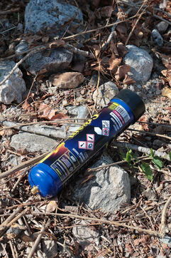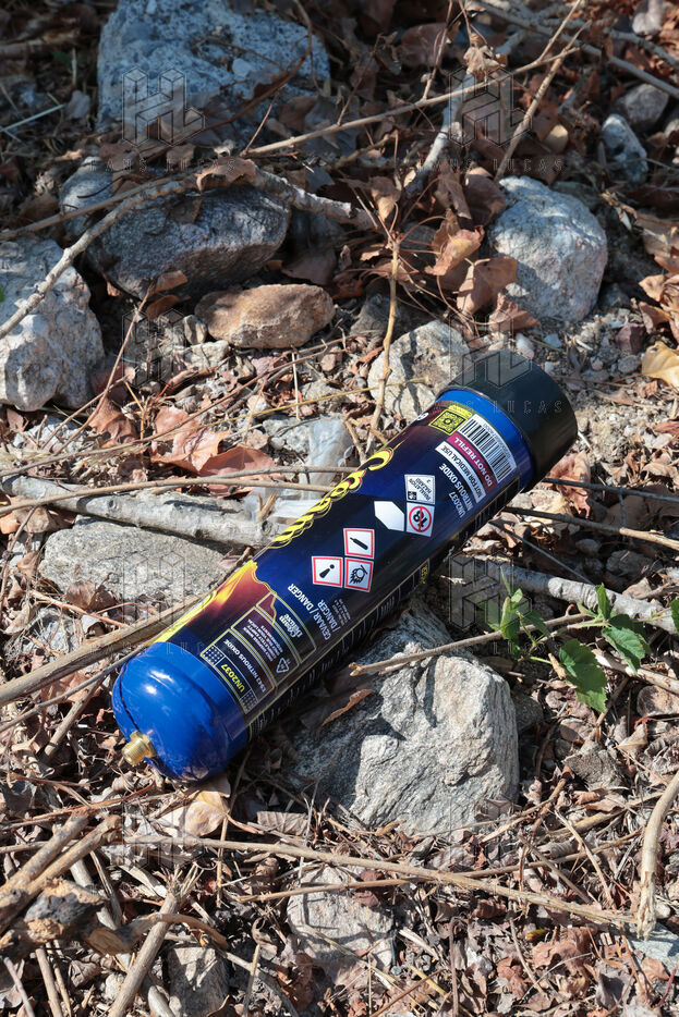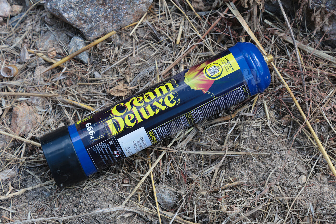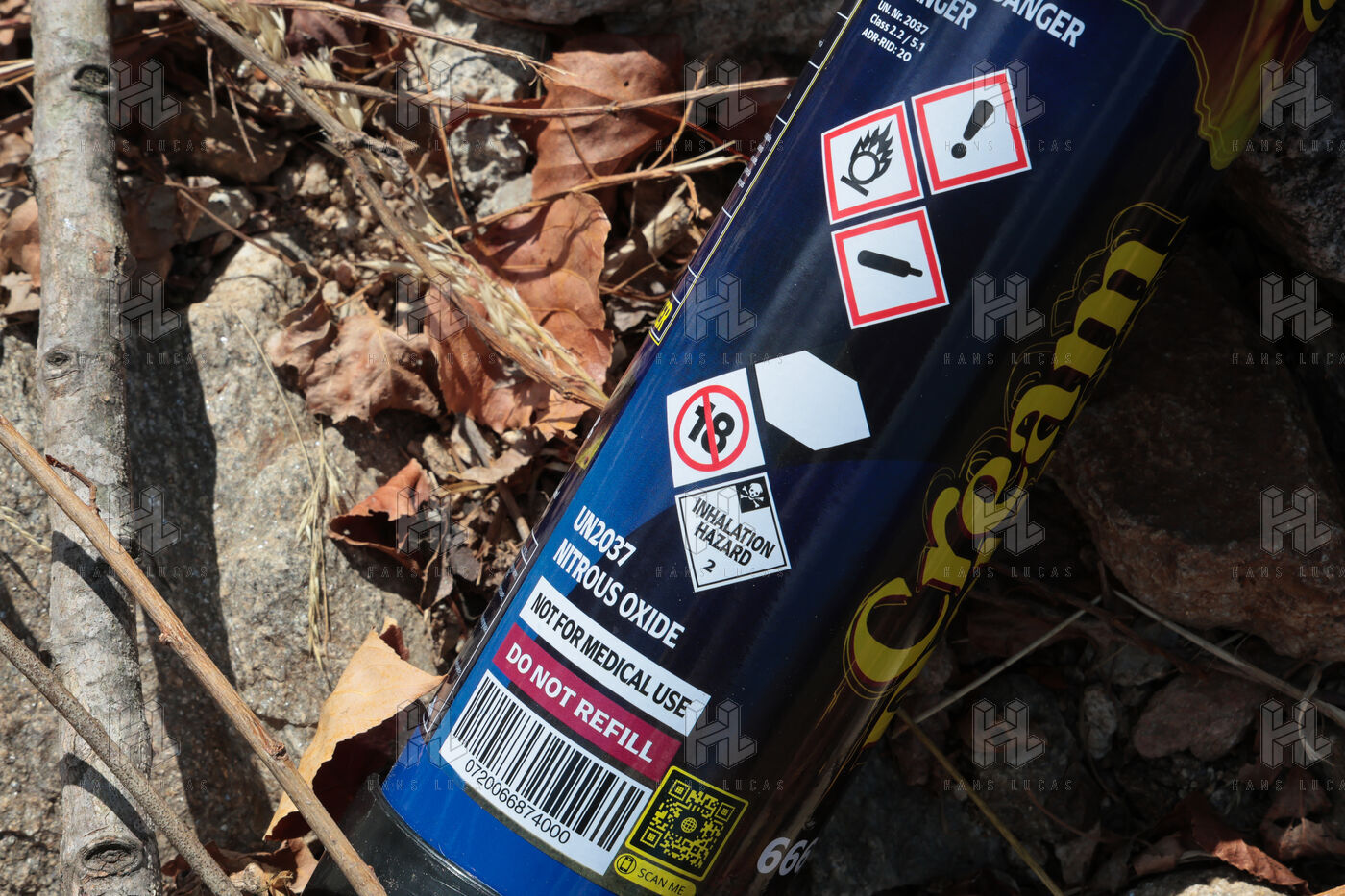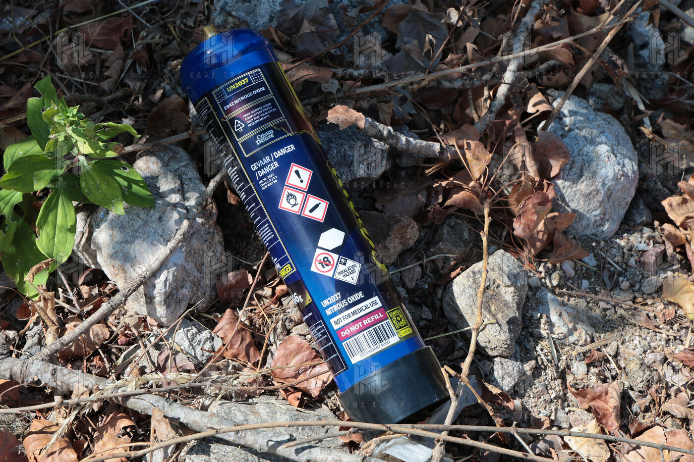 Nitrous oxide bottle abandoned in nature after being consumed.
