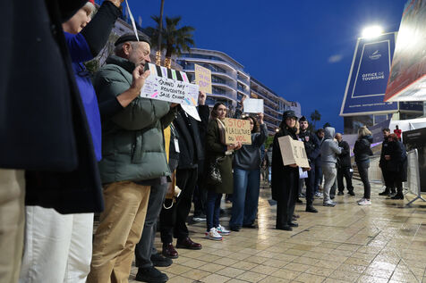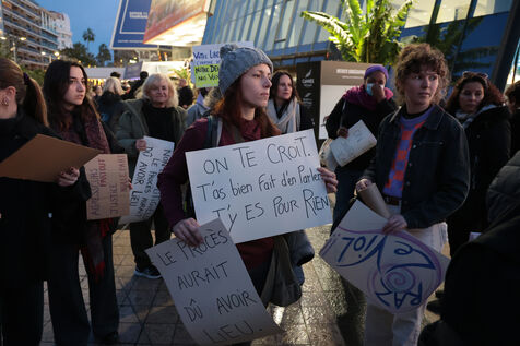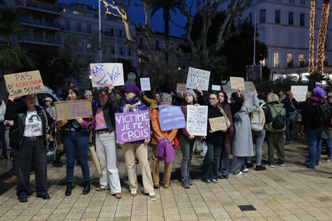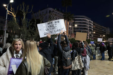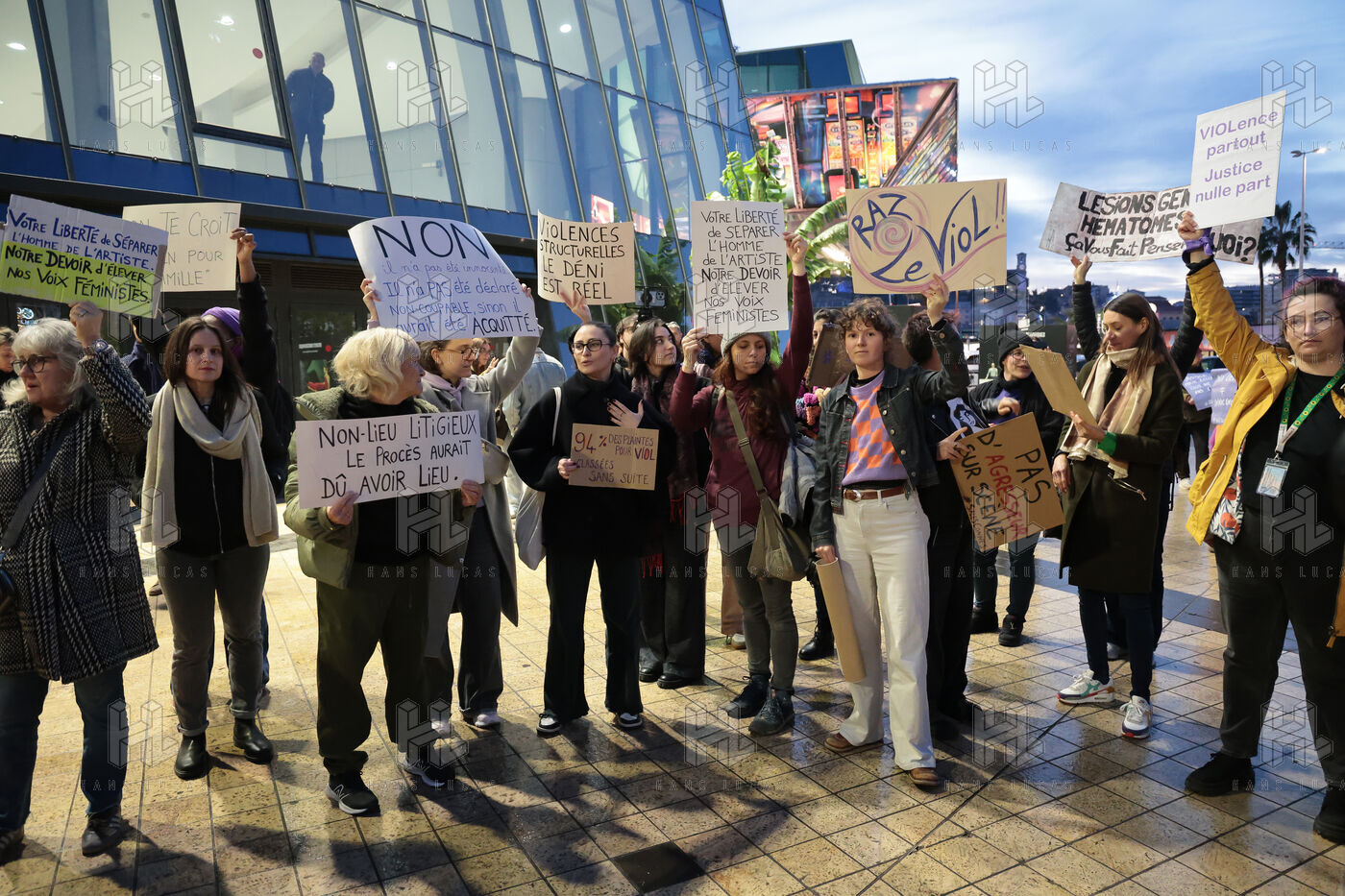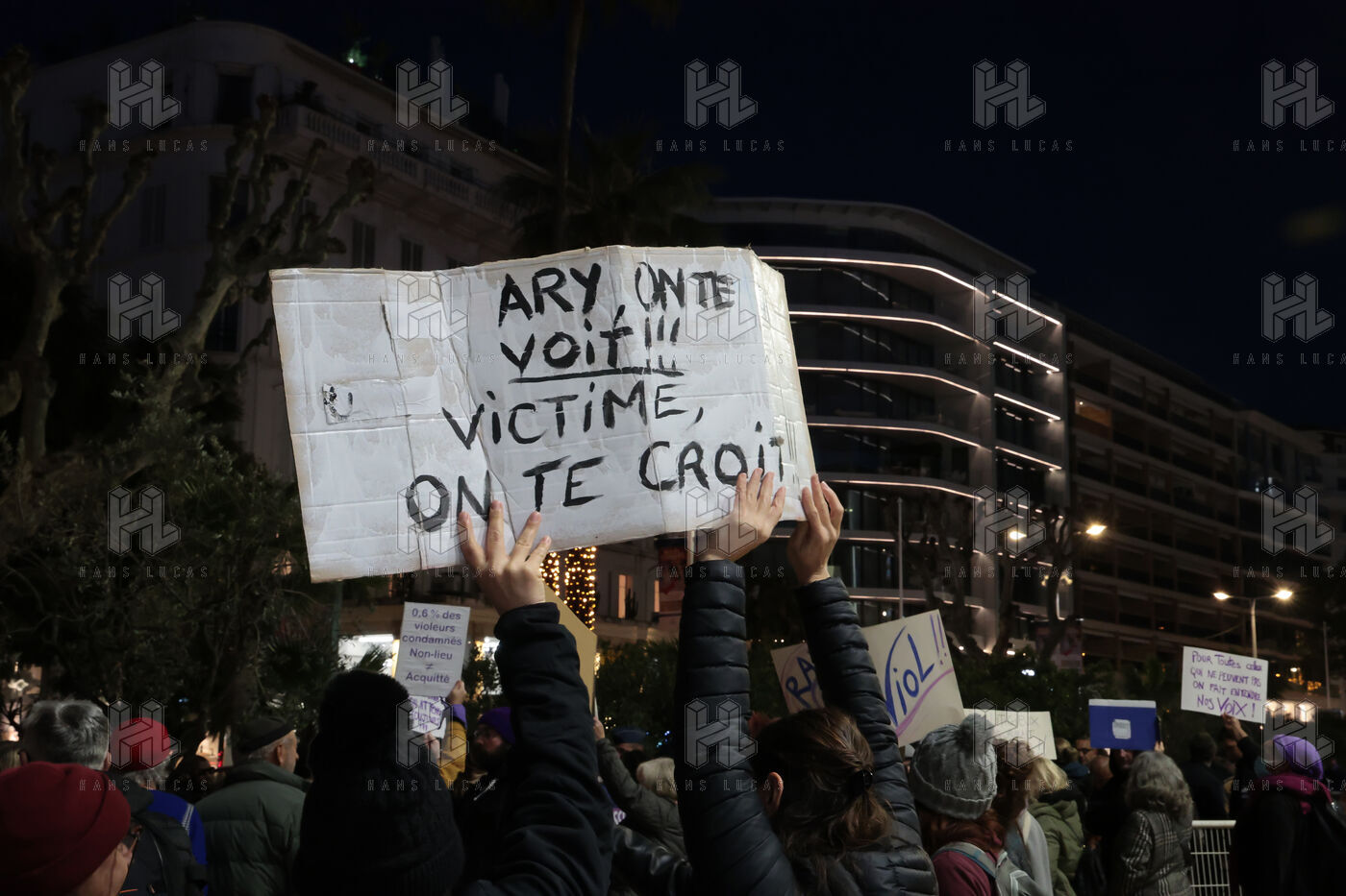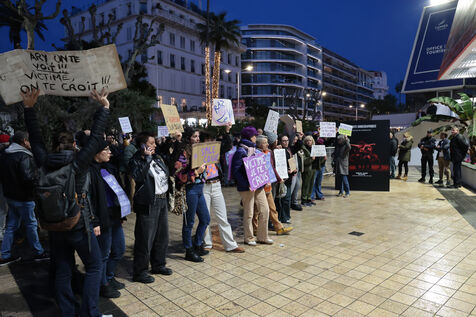Feminists from the group "Nous Toutes 06" (All of Us 06) demonstrate in front of the Palais des Festivals in Cannes, where Ary Abittan is scheduled to perform, to raise awareness about violence against women. Ary Abittan was accused of rape but was acquitted.