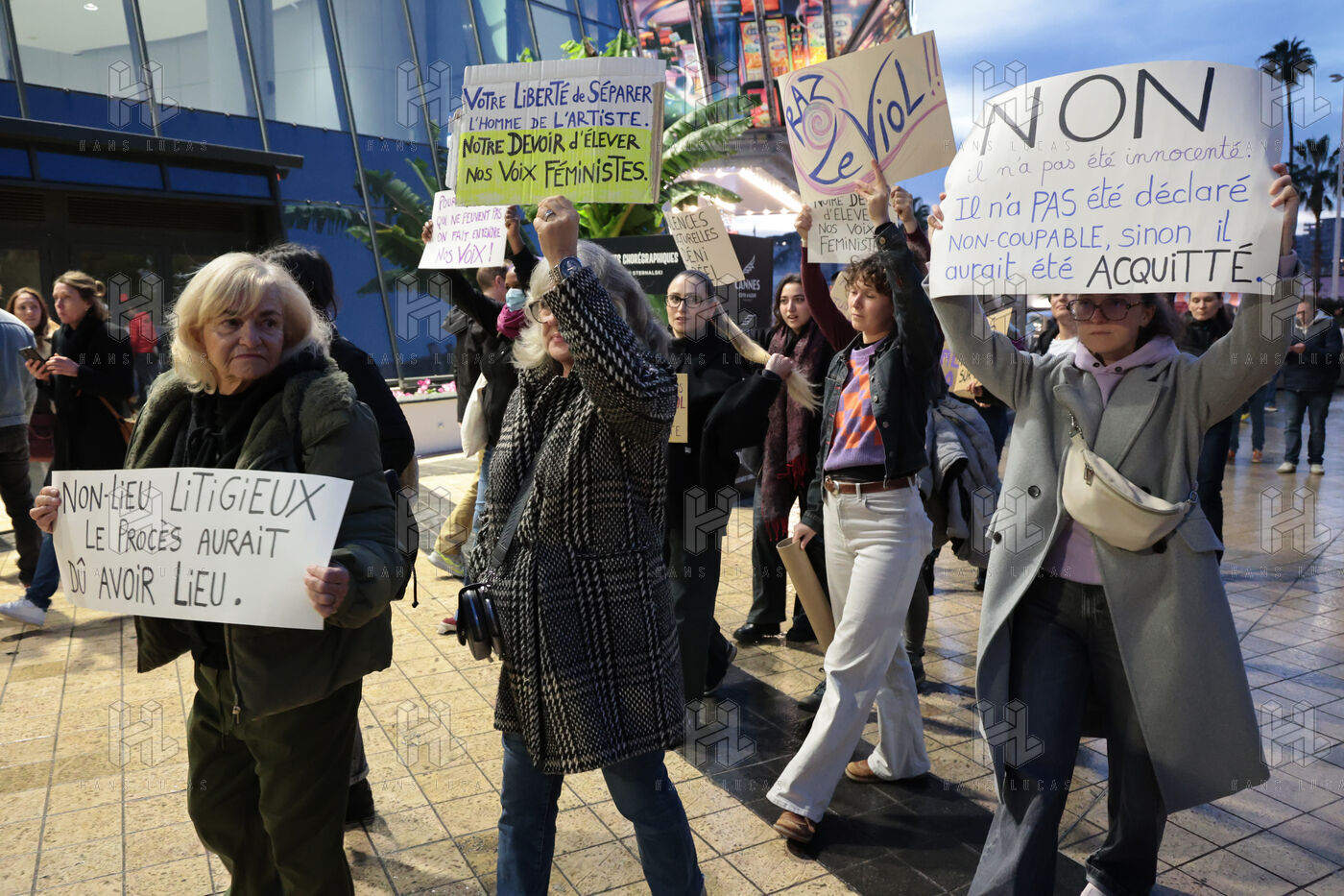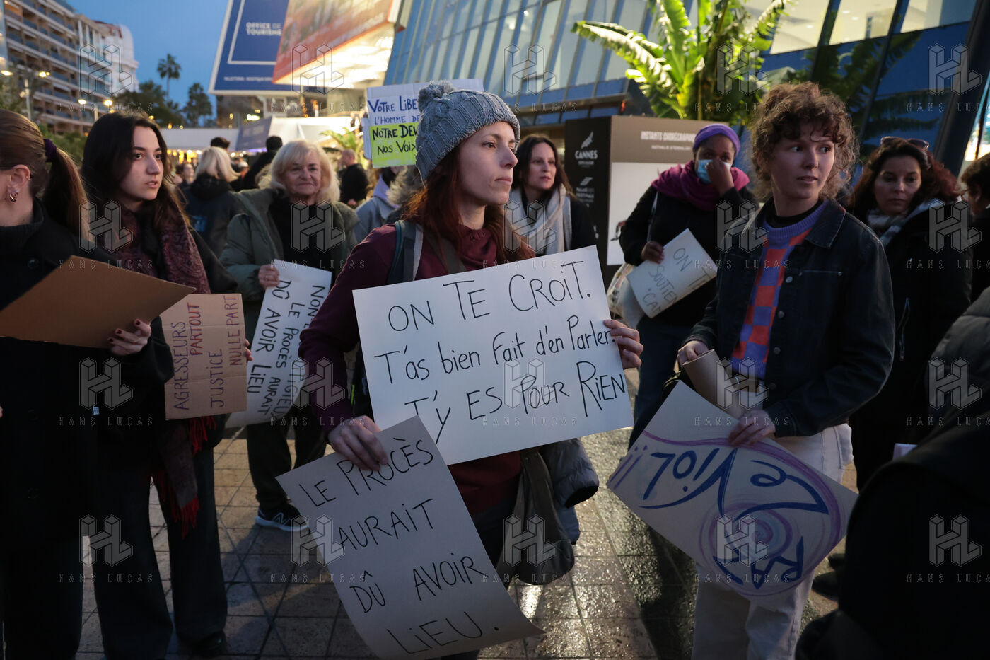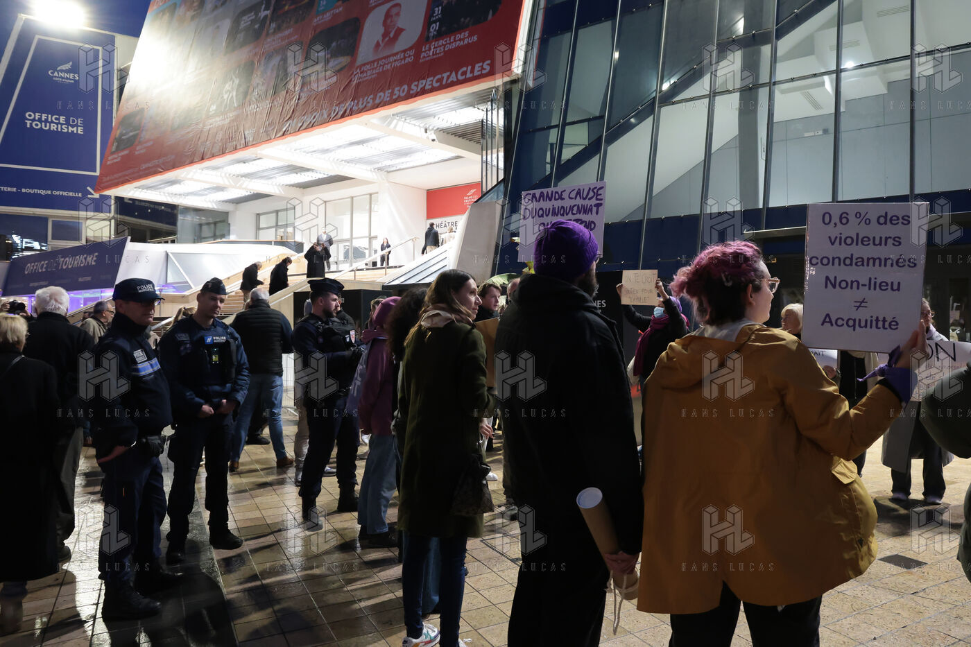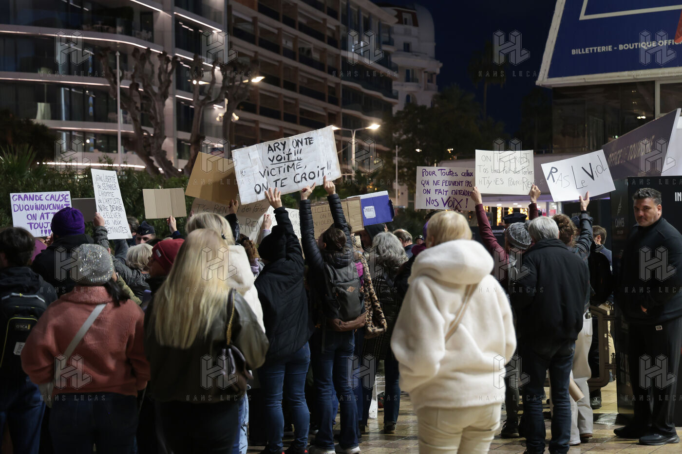 Des féministes du groupe "Nous Toutes 06" manifestent devant le Palais des Festivals de Cannes où doit se produire Ary Abittan pour sensibiliser le public contre les violences faites aux femmes. Ary Abittan a été accusé de viol et a bénéficié d un non-lieu.