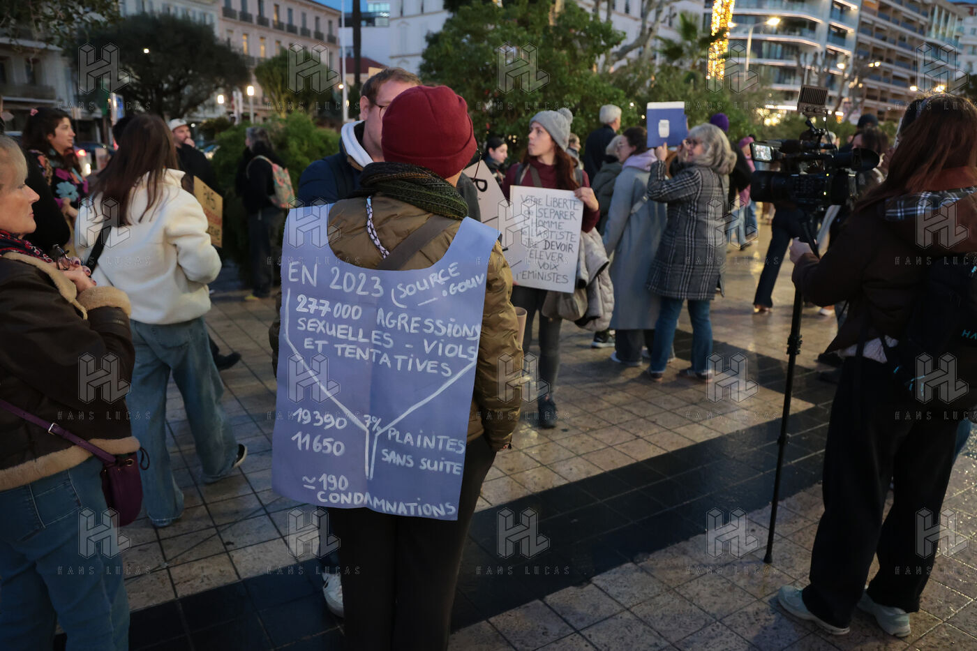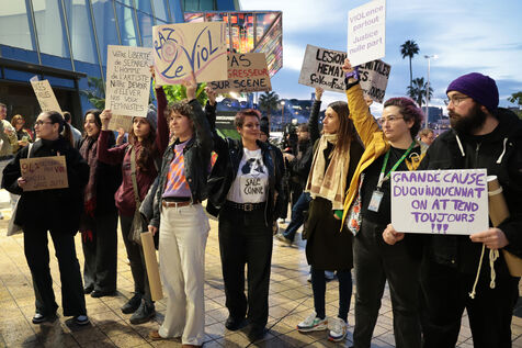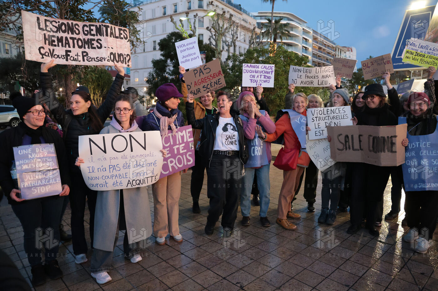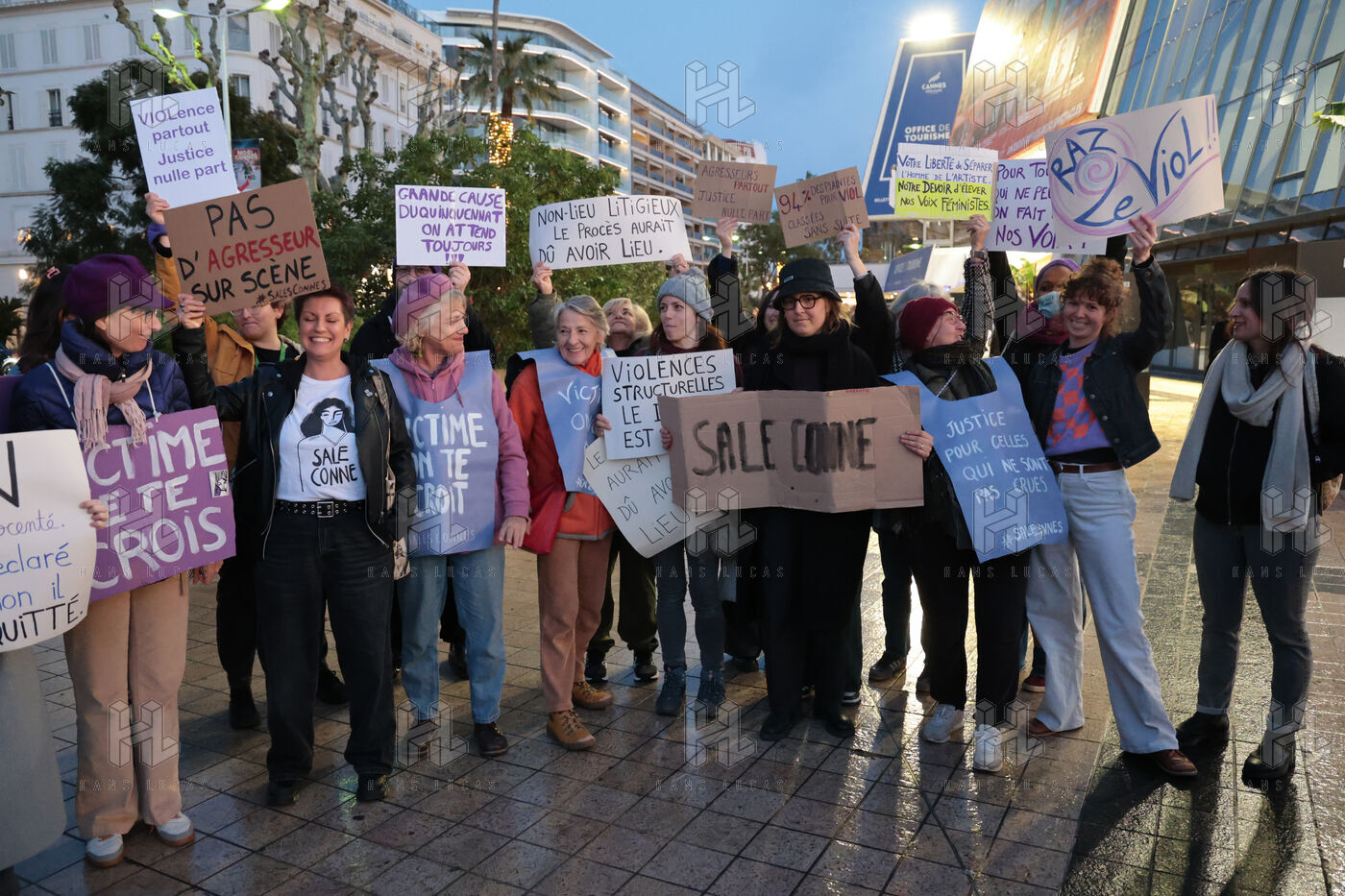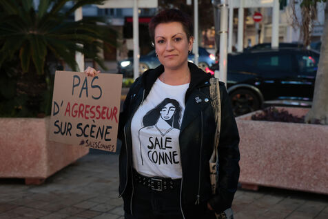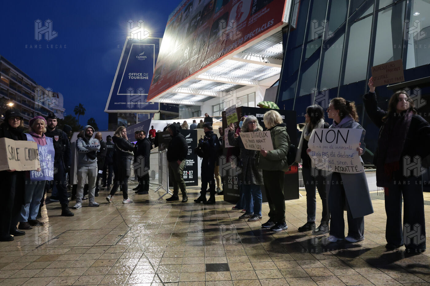 Des féministes du groupe "Nous Toutes 06" manifestent devant le Palais des Festivals de Cannes où doit se produire Ary Abittan pour sensibiliser le public contre les violences faites aux femmes. Ary Abittan a été accusé de viol et a bénéficié d un non-lieu.