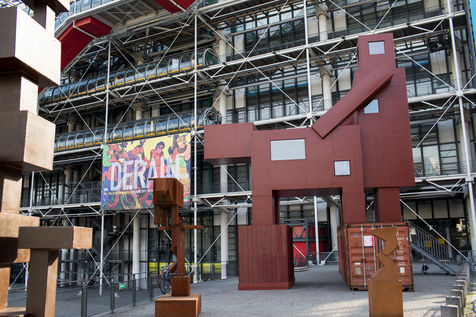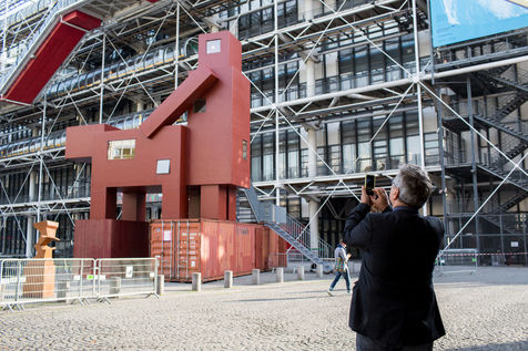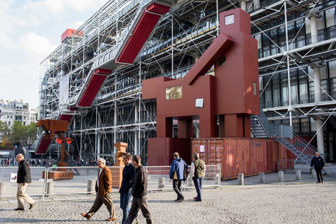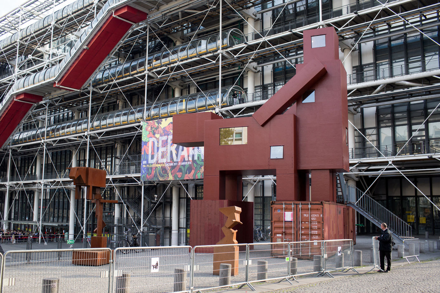 The piece of art Domestikator is a 12 meter high sculpture made up of red Lego blocks that evokes a couple in a doggy-style position. Initially planned to be exhibited in front of the Louvre, which refused it, he was welcomed in the forecourt of the Georges Pompidou Centre in Beaubourg.