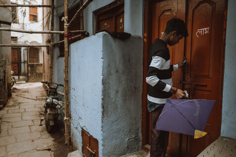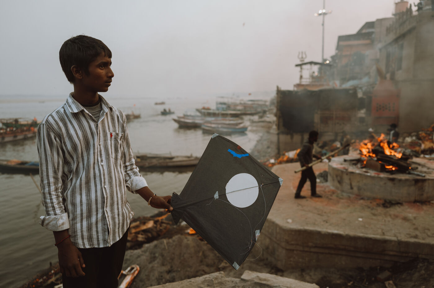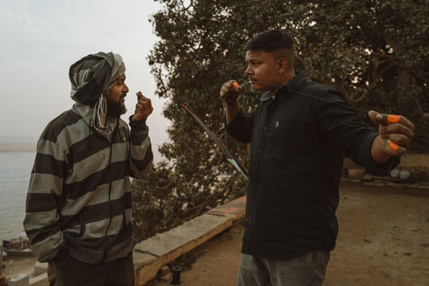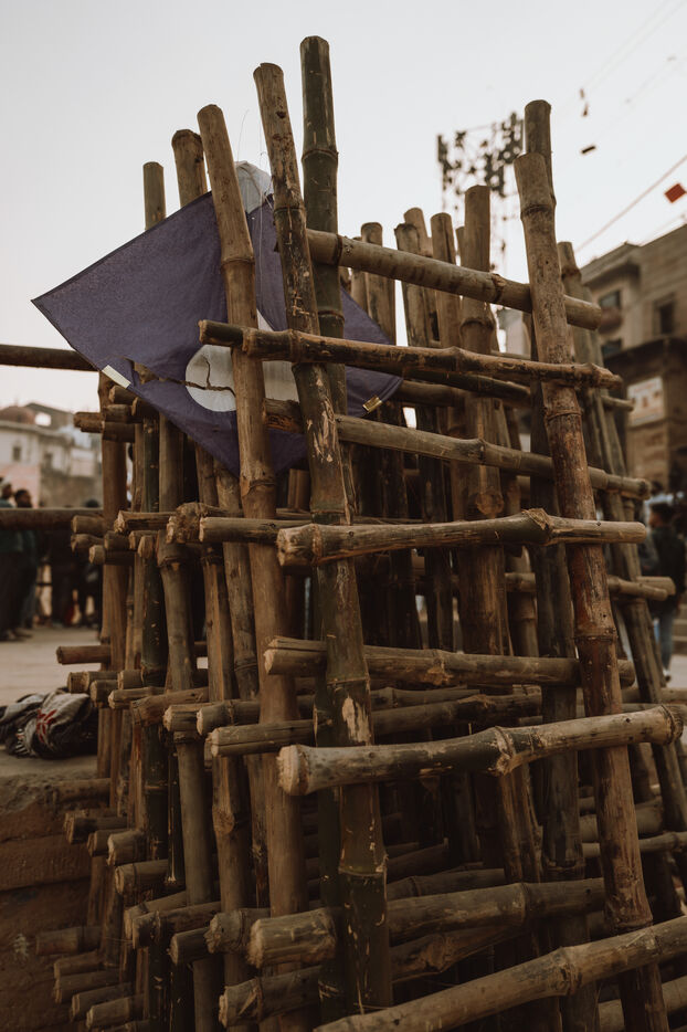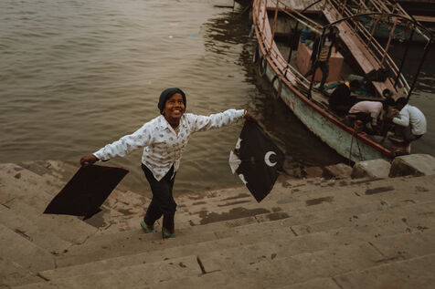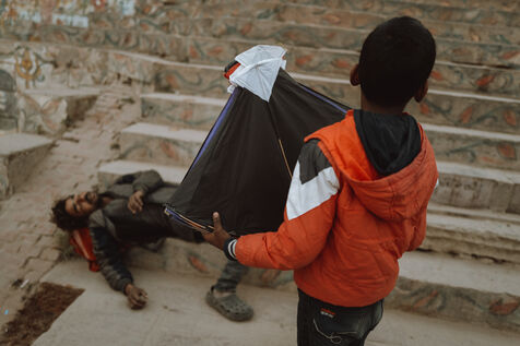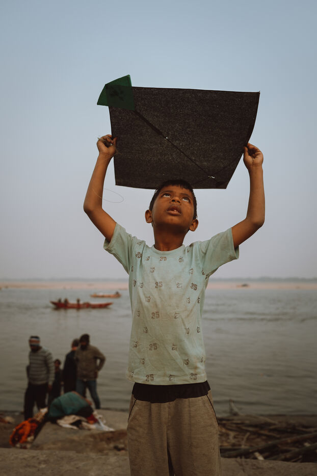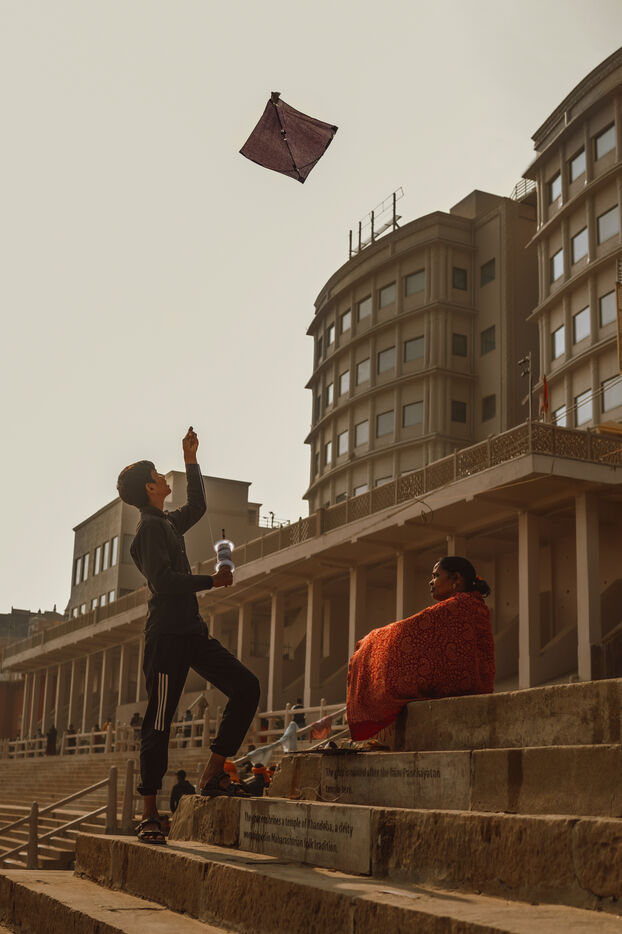 Les batailles de cerfs-volants sont le cœur de la fête à Varanasi. Au-dessus du dédale de toits, des centaines de cerfs-volants se croisent dans une toile dense et mouvante. Une traction nette, un angle précis, une ligne qui vibre : un cerf-volant tombe dans les ruelles — immédiatement poursuivi par les enfants — tandis qu’un autre s’élève en triomphe. Pour de nombreux jeunes participants, ces duels marquent leur première véritable rencontre avec la compétition, la stratégie et la fierté de quartier.