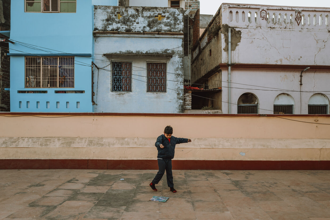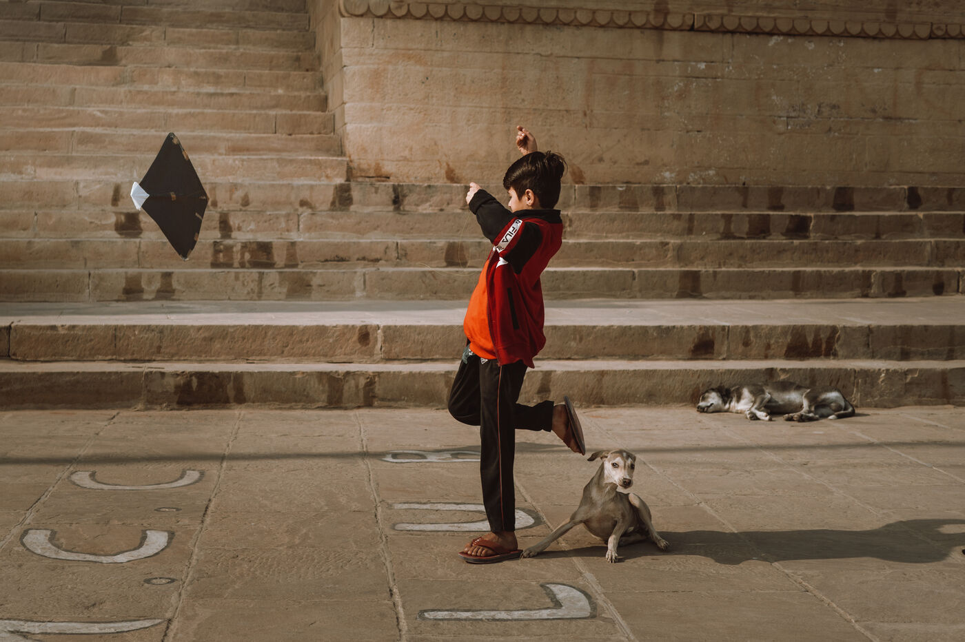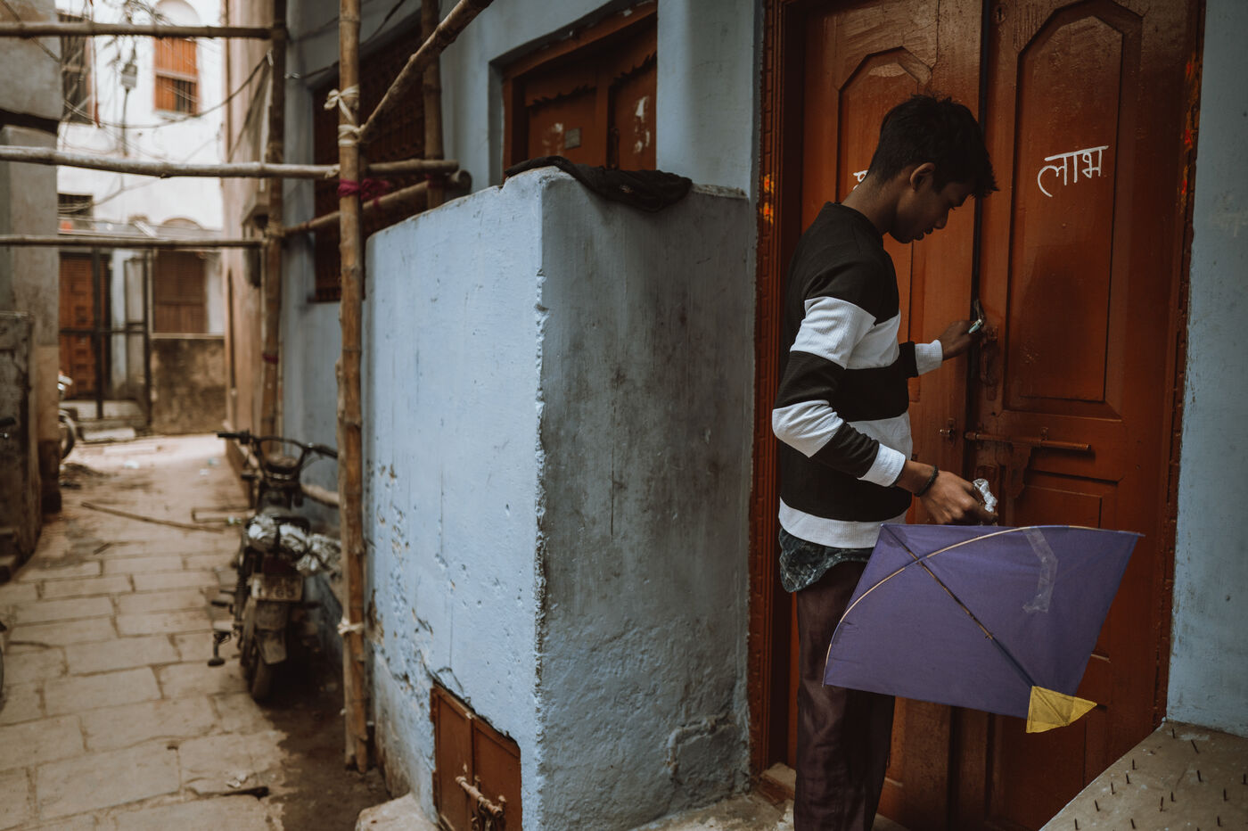 Les batailles de cerfs-volants sont le cœur de la fête à Varanasi. Au-dessus du dédale de toits, des centaines de cerfs-volants se croisent dans une toile dense et mouvante. Une traction nette, un angle précis, une ligne qui vibre : un cerf-volant tombe dans les ruelles — immédiatement poursuivi par les enfants — tandis qu’un autre s’élève en triomphe. Pour de nombreux jeunes participants, ces duels marquent leur première véritable rencontre avec la compétition, la stratégie et la fierté de quartier.