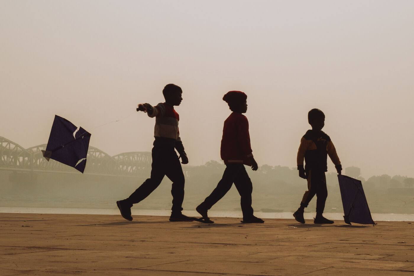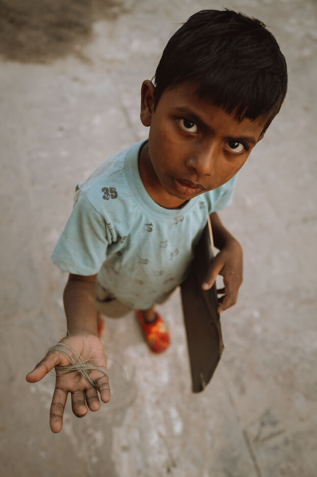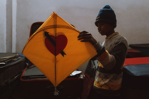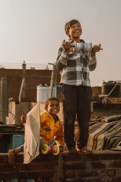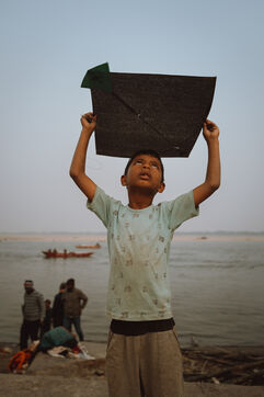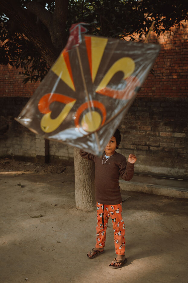 Kite battles are the heart of the festival in Varanasi. Above the maze of rooftops, hundreds of kites cross paths in a dense, shifting web. A sharp pull, a precise angle, a vibrating line: one kite drops into the alleys—immediately chased by children—while another rises in triumph. For many young participants, these duels mark their first real encounter with competition, strategy, and neighborhood pride.
