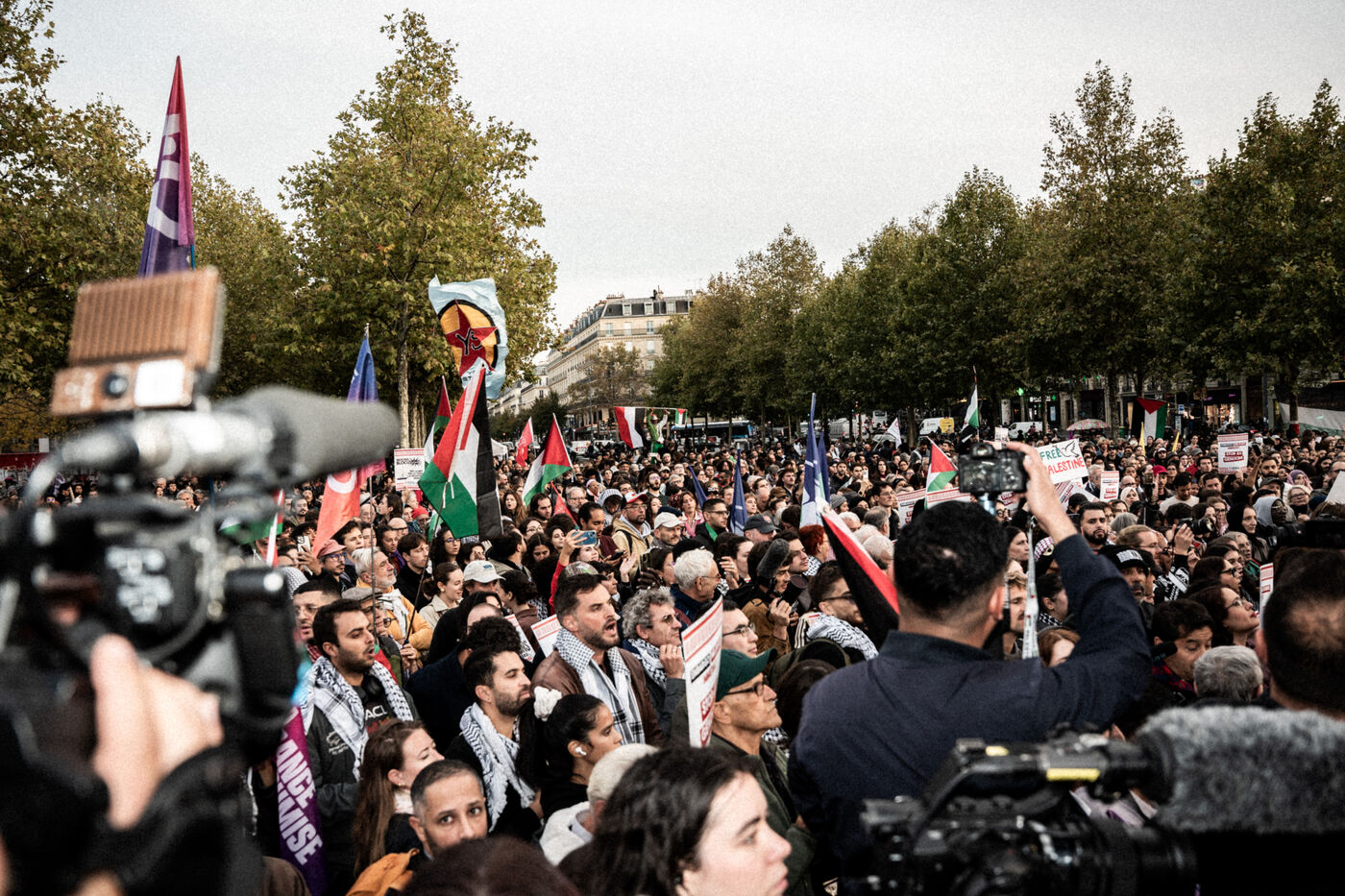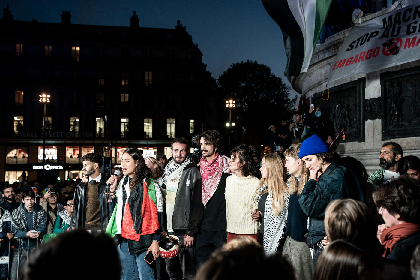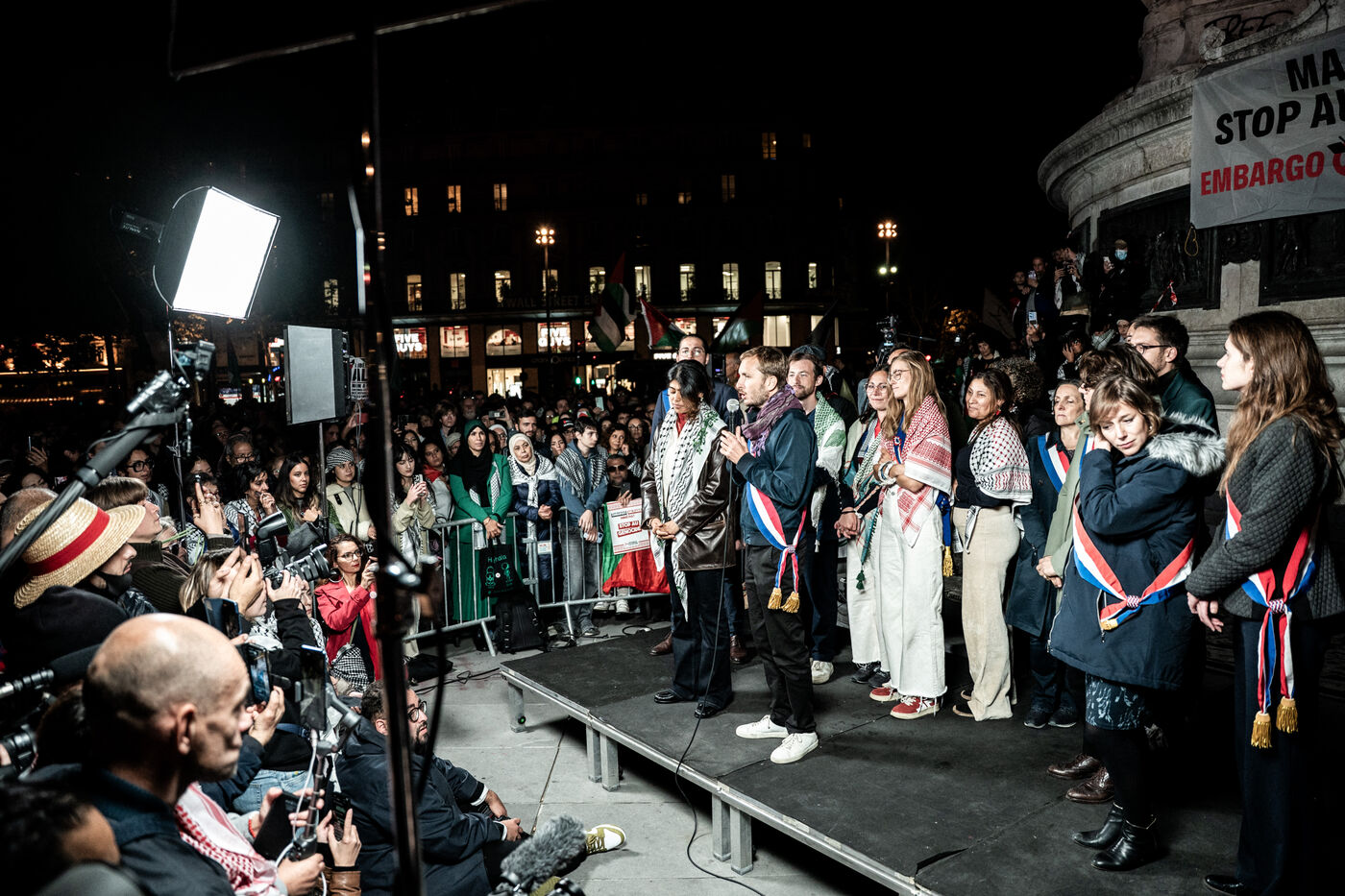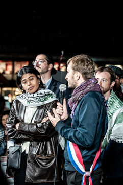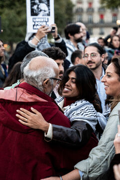 A gathering in support of Palestine took place at Place de la République following the liberation of all members of the Global Sumud Flotilla. The flotilla had attempted to break the blockade of Gaza before being illegally intercepted by the Israeli army, and its participants were detained. The rally brought together all French members of the flotilla, including members of the political party La France Insoumise, who had participated in the crew and related solidarity activities.