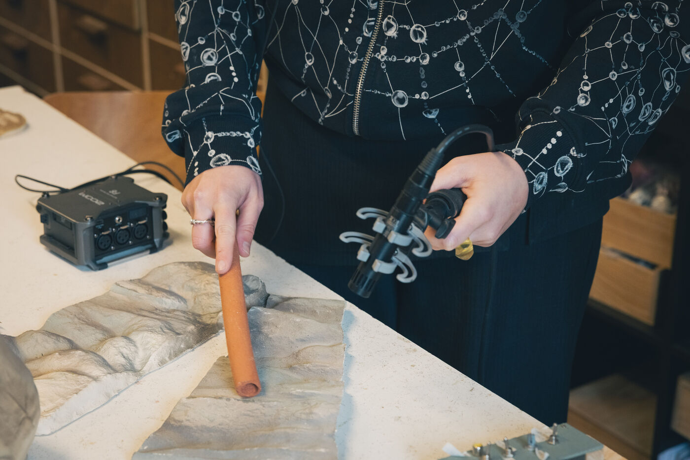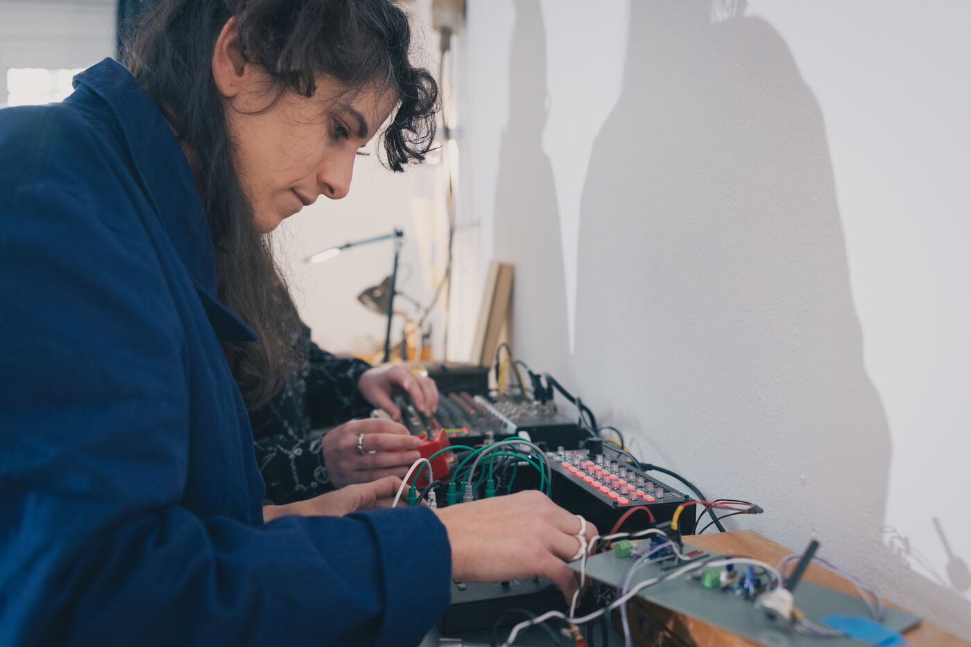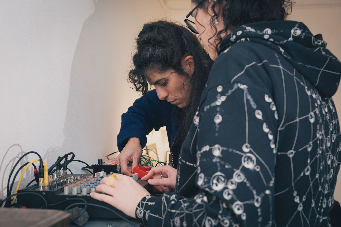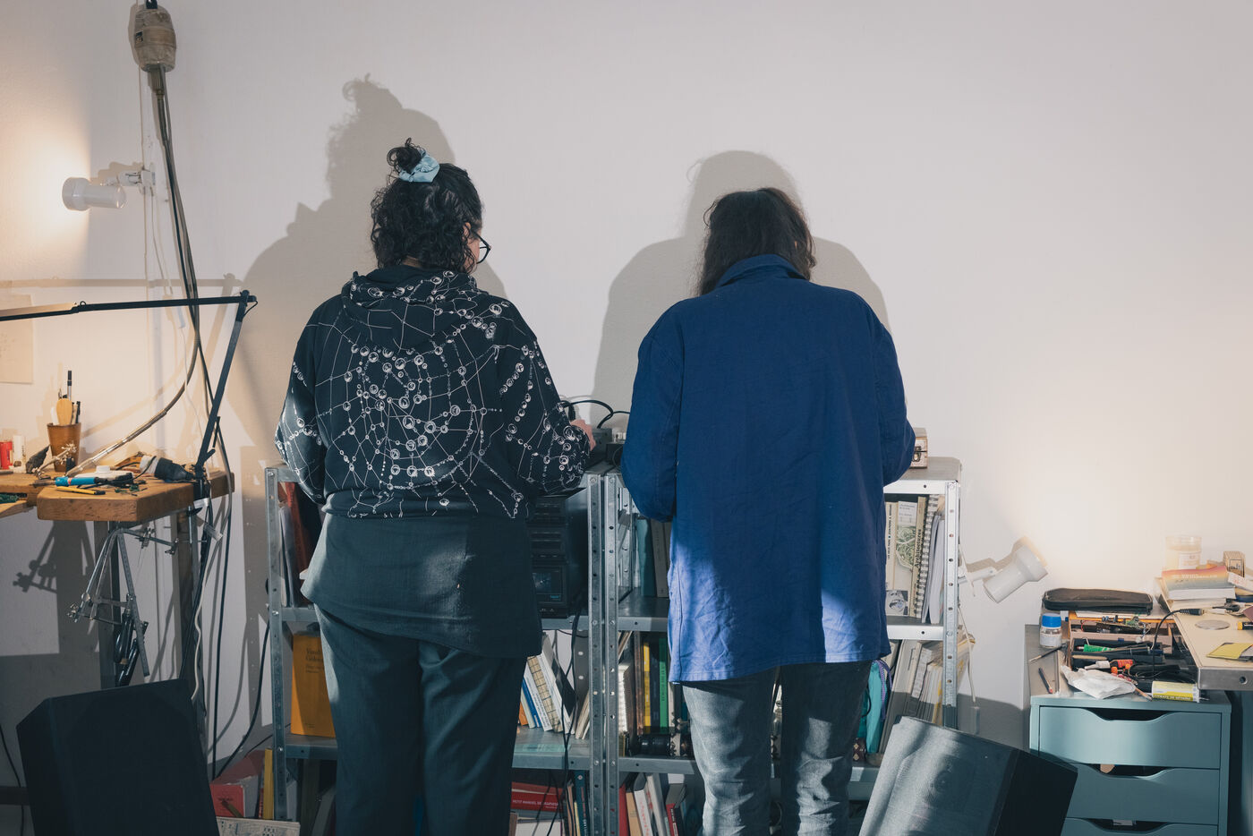 Paris, France – Portrait of artists Sonia Saroya and Fanny Testas during their Le sable se caractérise par sa capacité à s’écouler installation. Visual and sound artists Sonia Saroya (born 1993) and Fanny Testas (born 1994), based in Aubervilliers, work at the intersection of sculpture, sound and technology, exploring geological, ecological and material narratives through installations that merge documentary investigation and poetic drift, presented in exhibitions and residencies supported by FoRTE and cultural institutions.
