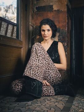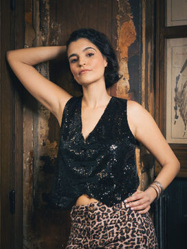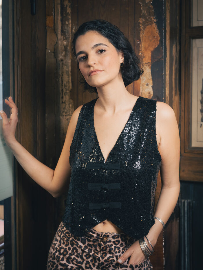 Portrait de l’actrice française Eya Bouteraa dans un bar à République, Paris, le 17 février 2026, peu après la présentation du film "À voix basse" en festival international.