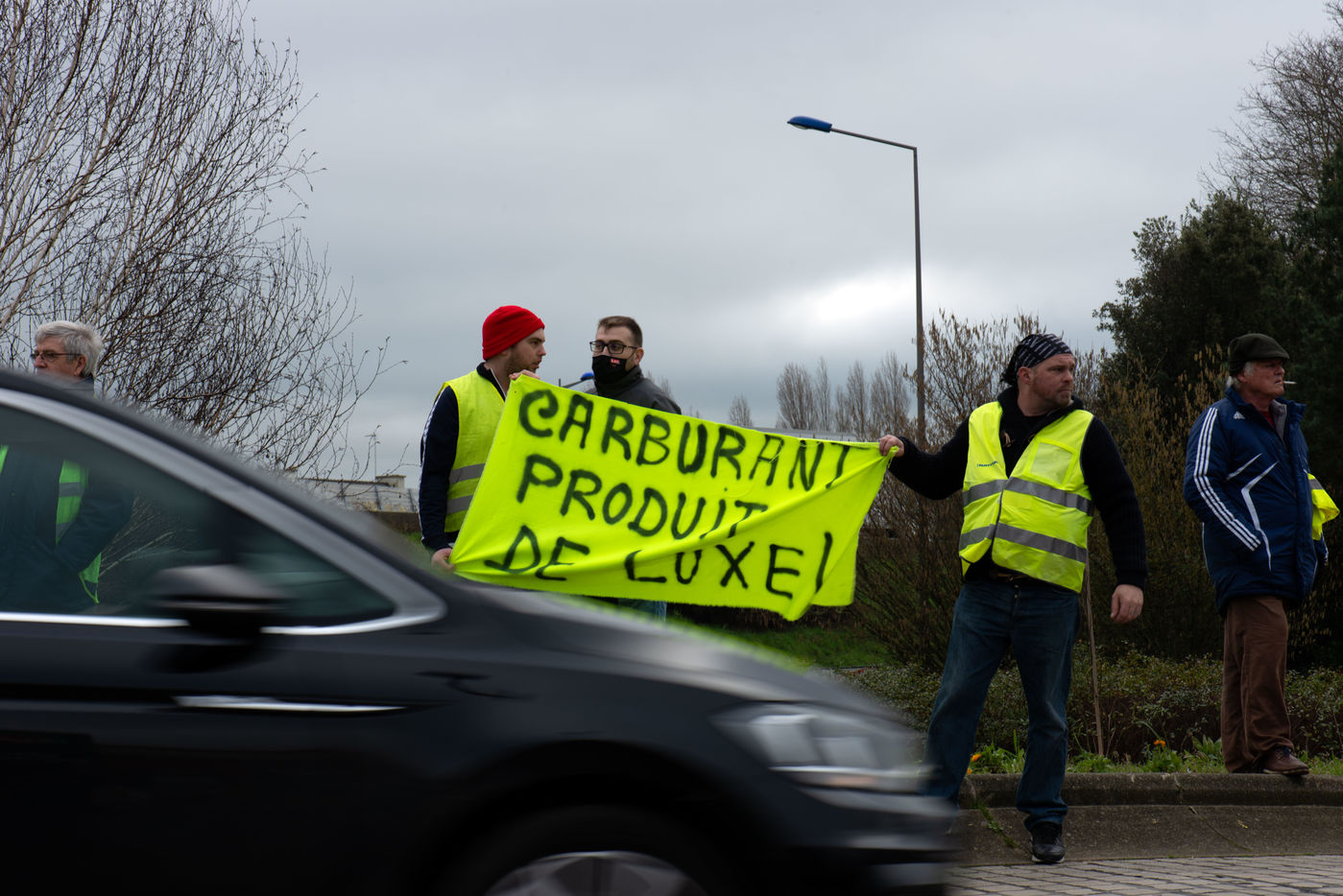 Action de quelques gilets jaunes sur une rond-point de Saint-Brieuc, contre la hausse des prix du carburant.