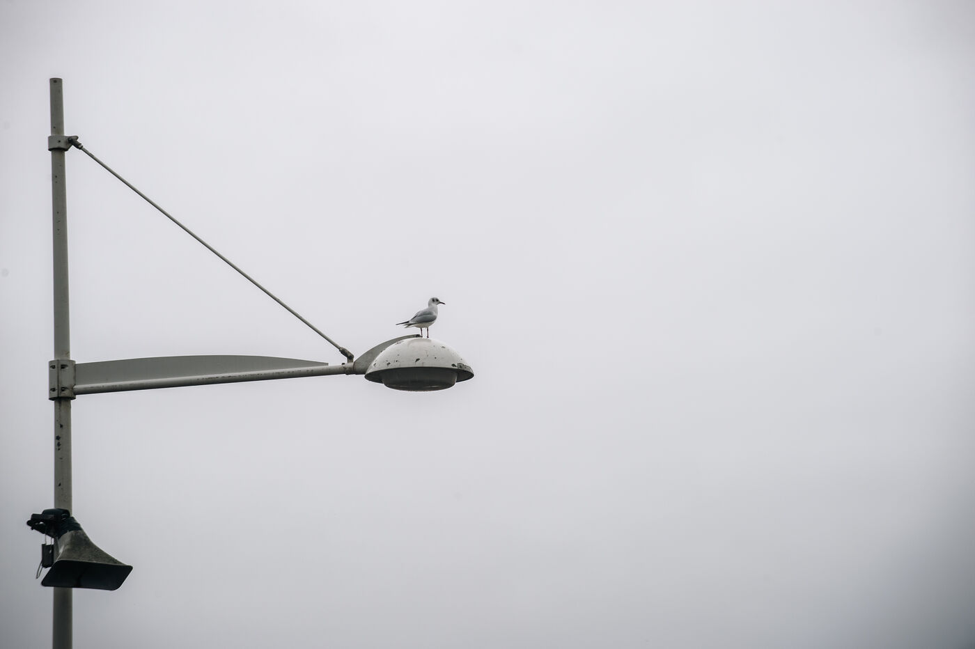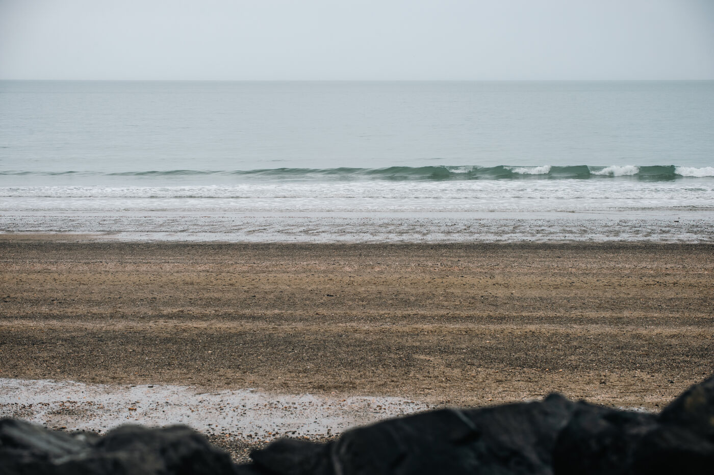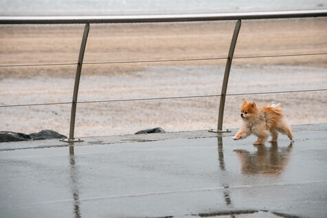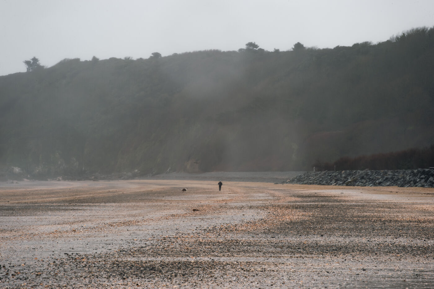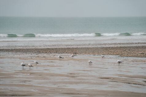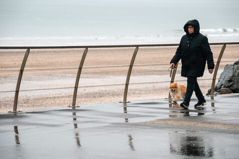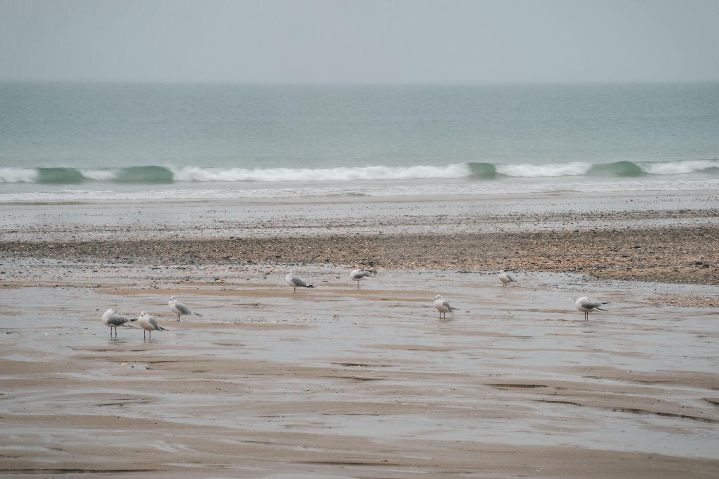 Une ambiance singulière règne sur la plage des rosaires de Plérin, où mouettes et goélands s'agitent, alors que de rares promeneurs avec leur chien bravent la pluie et font semblant de rien.