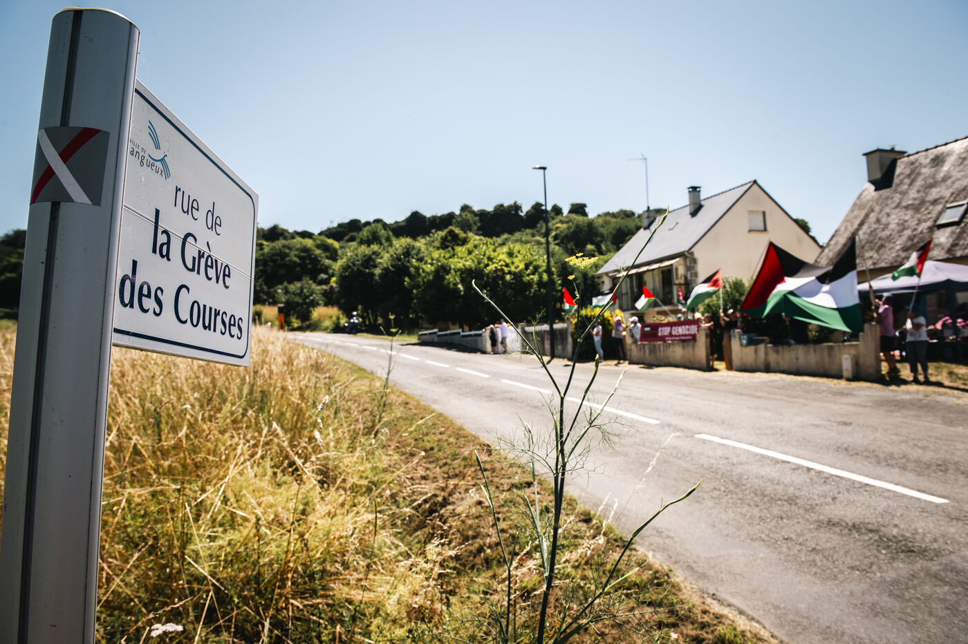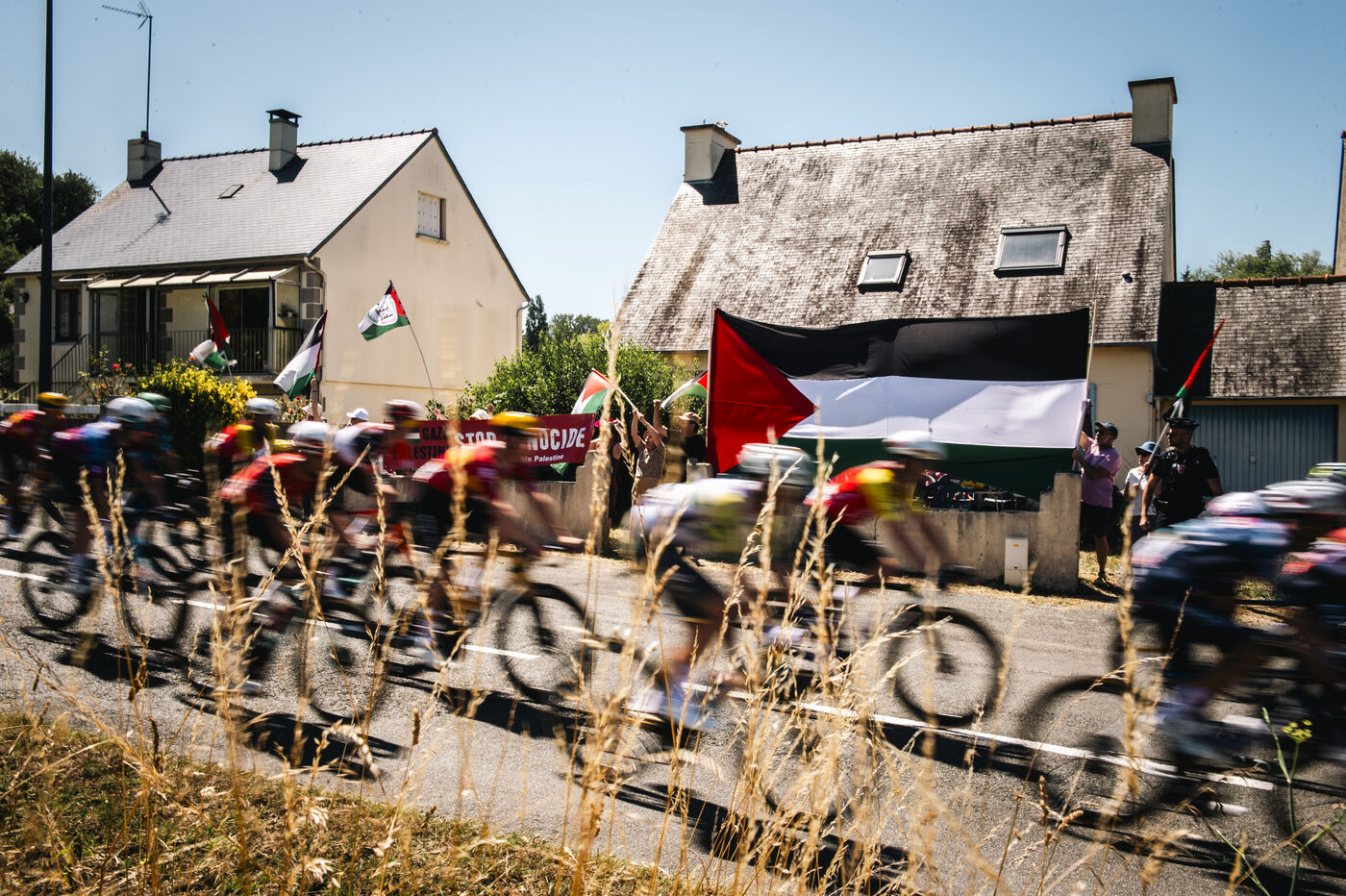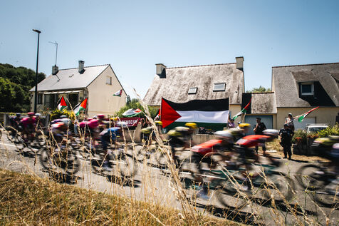 On the occasion of the Tour de France, the Collectif Paix Palestine Saint-Brieuc once again came out in support of the Palestinian people, denouncing Israel's whitewashing of genocide through sport, with its Israel-Premier Tech cycling team, unfurling a large Palestinian flag as the cyclists passed through Langueux.