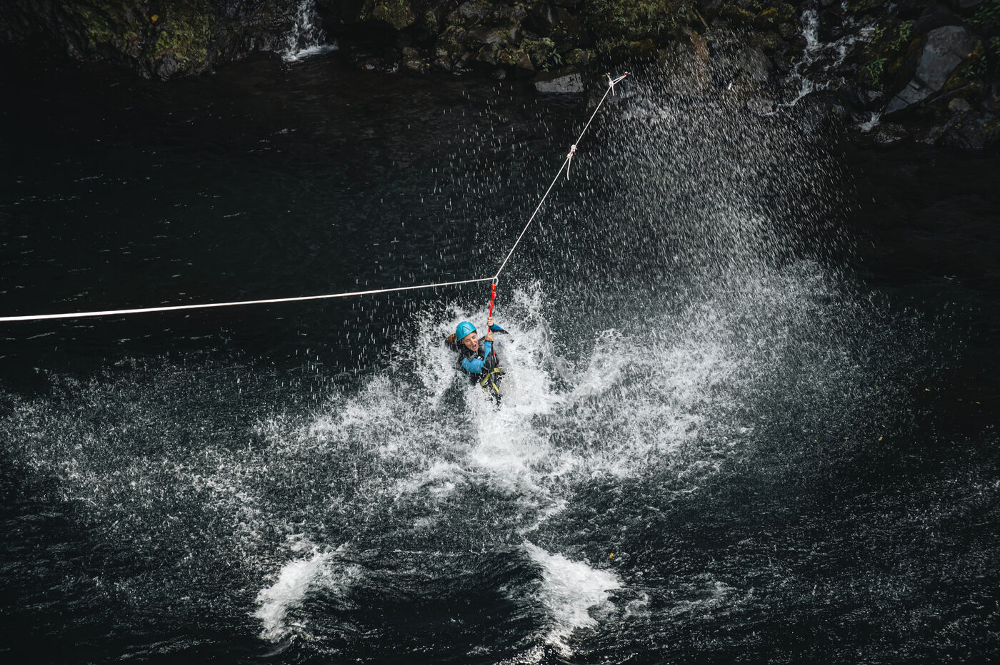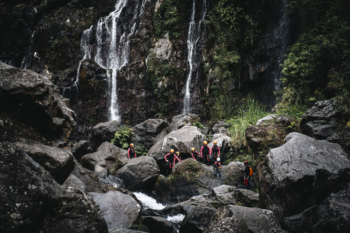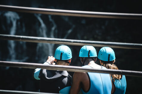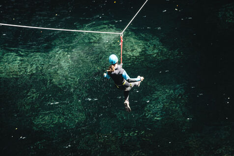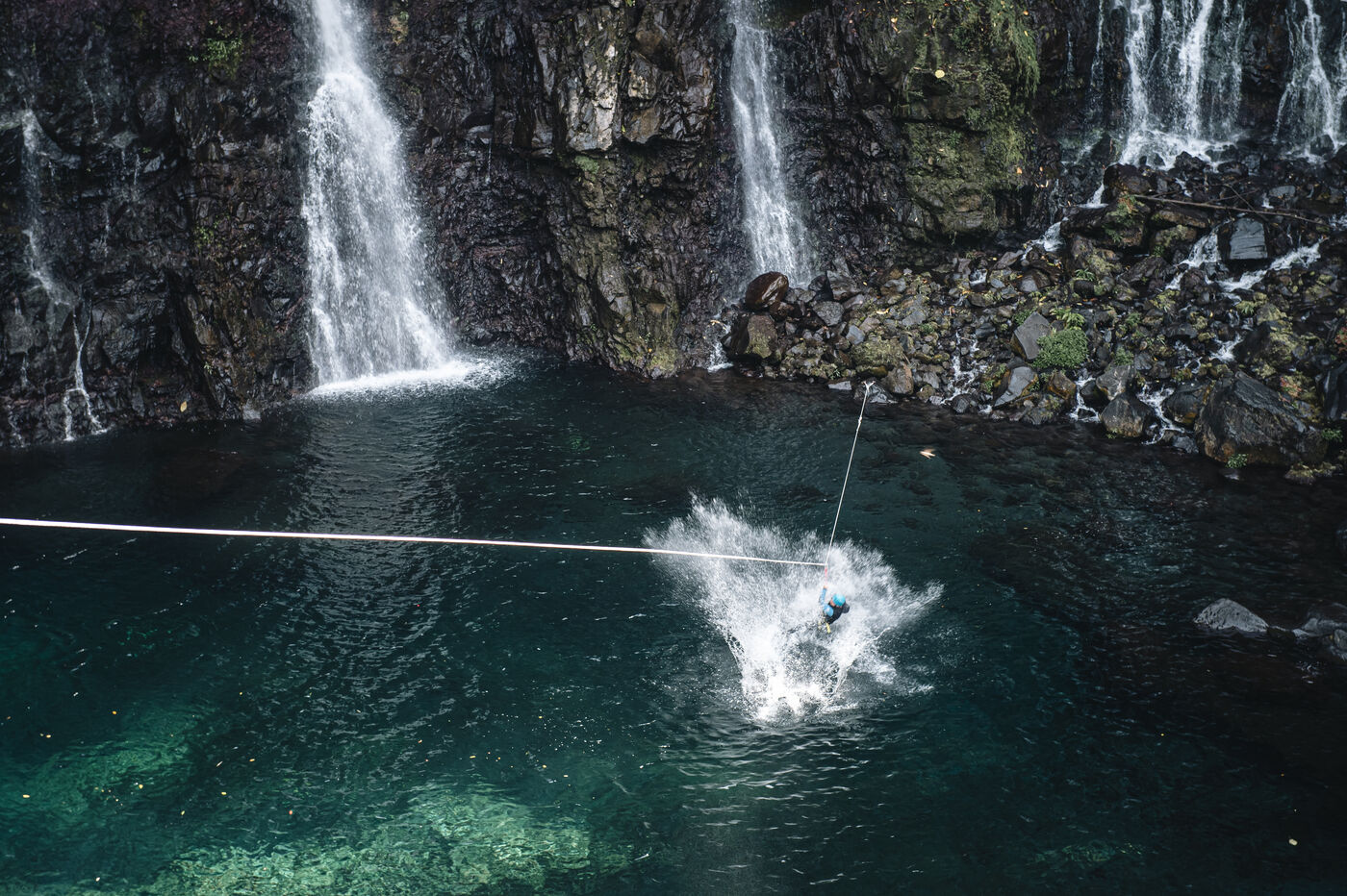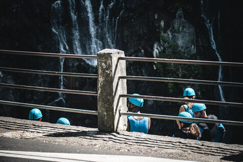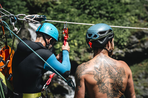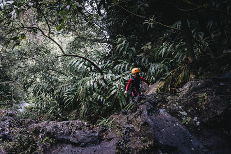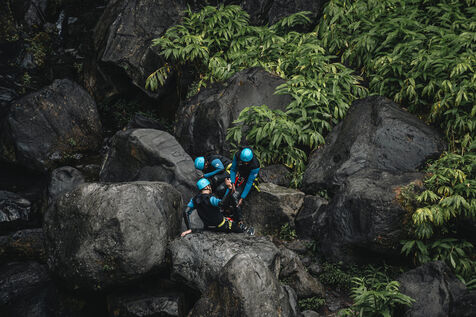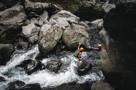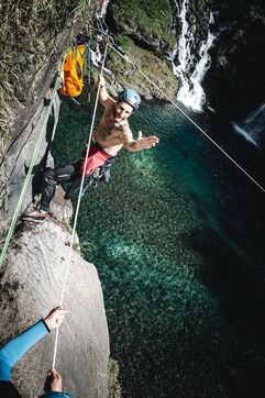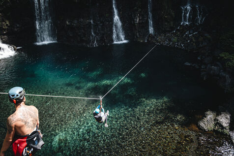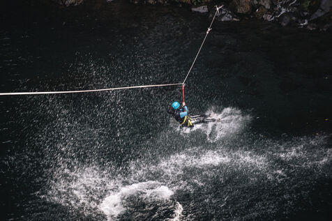 Introductory session to canyoning techniques: zip lines, slides, jumps, white water swimming in the heart of the Langevin canyon, in crystal clear water from volcanic springs.