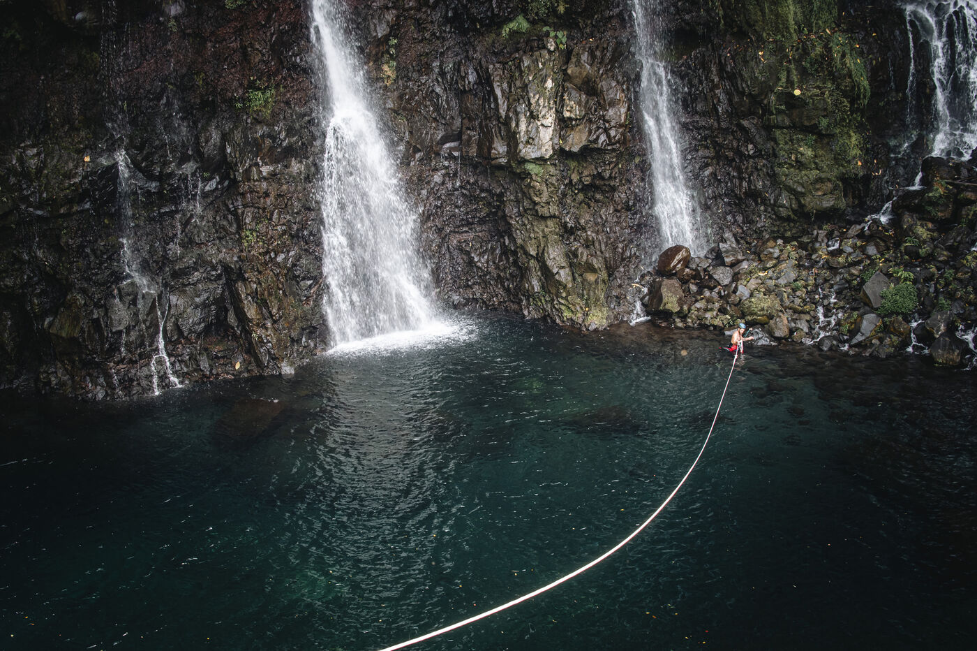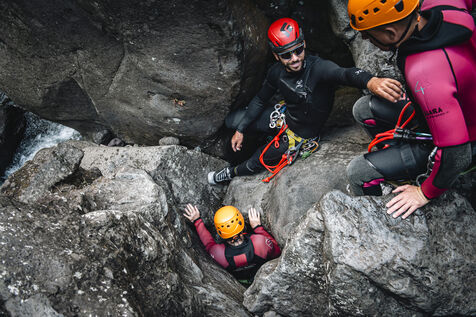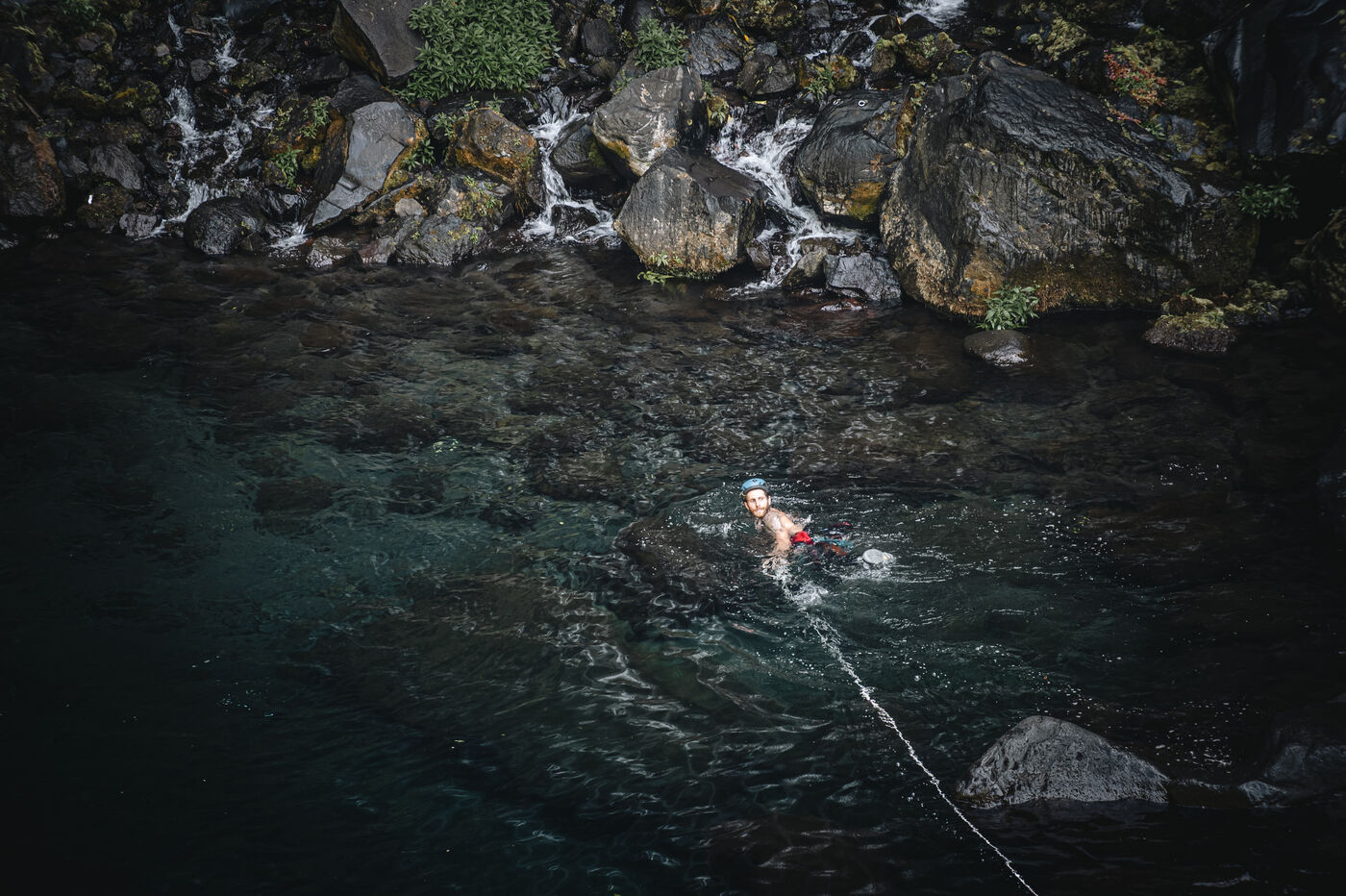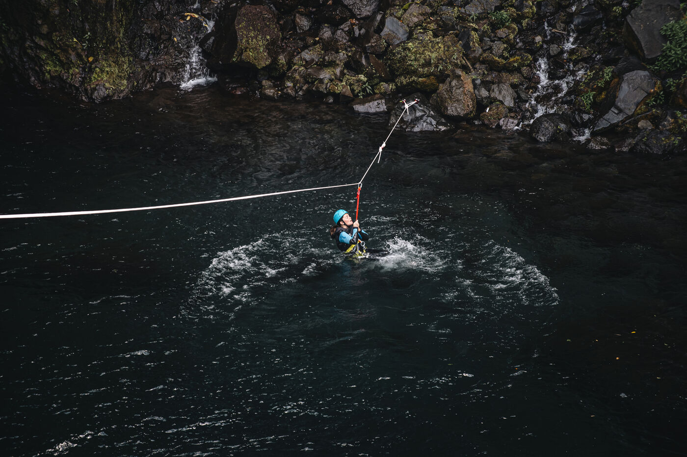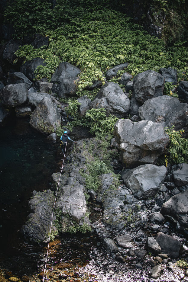 Séance d'initiation aux techniques de progression en canyon : tyrolienne, toboggans, sauts, nage en eau vive au coeur du canyon de Langevin, dans une eau cristalline issue des sources volcaniques.