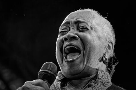 Portrait of singer Barbara Hendricks and her blues band on stage at the Cognac Blues Passion festival in Jarnac on July 2, 2025.