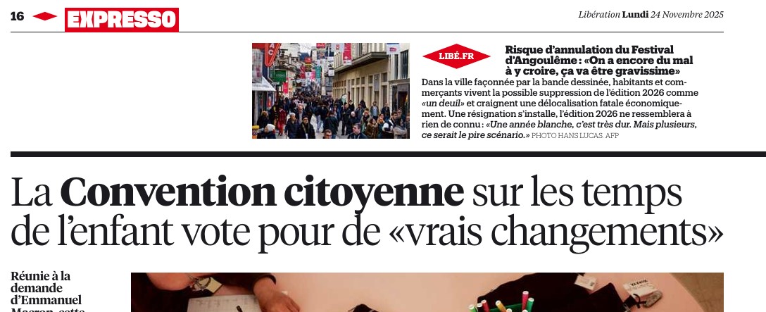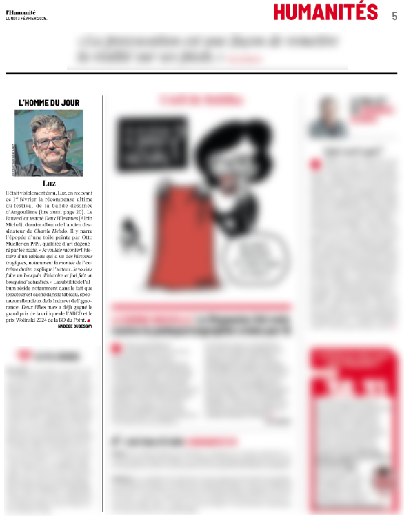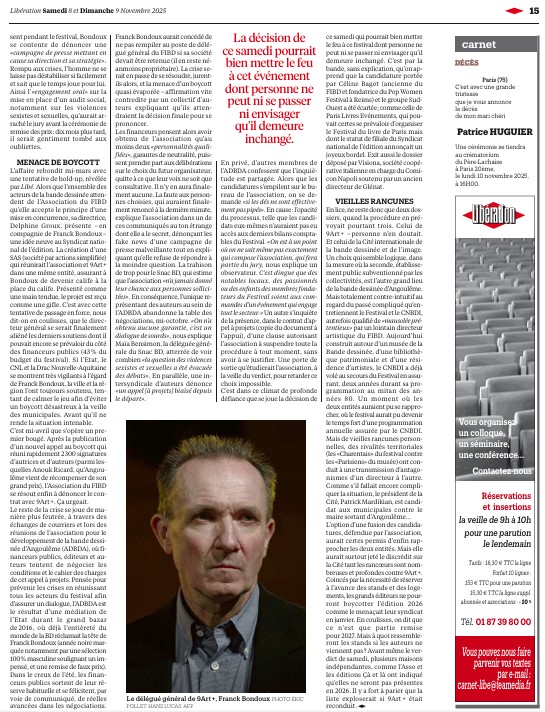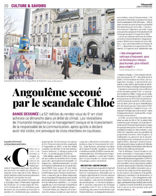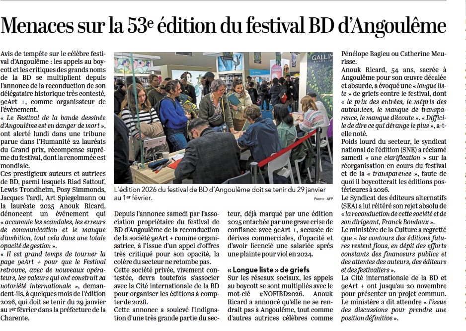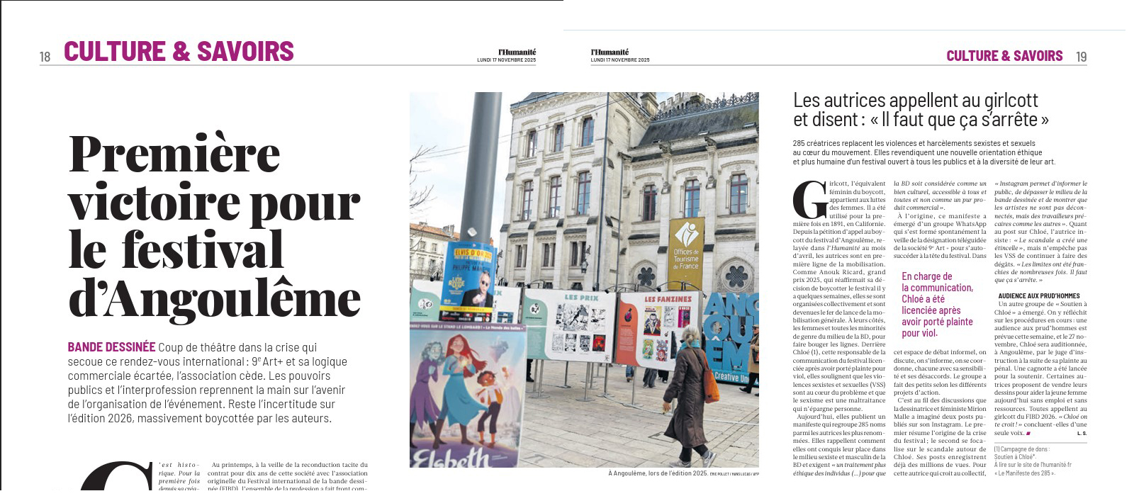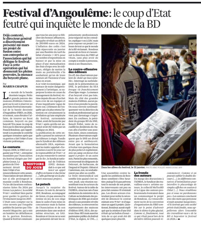 Eric Pollet Publications Séries / Archive Culture — Environnement — Guerre et conflits — Nouvelle Aquitaine — Politique — Société — Spiritualité — Sport Sélection de séries Challenges Libération : Risque d'annulation du festival d'Angoulême L'Humanité : Première victoire pour le Festival d'Angoulême Le Courrier de l'Ouest : menaces sur la 53e édition Libération : A Angoulême, le festival de la bande décriée Libération : Festival d’Angoulême : le coup d’Etat feutré qui inquiète le monde de la BD Le Nouvel Obs : Stérin, saint patron des réacs L'Humanité L'Humanité