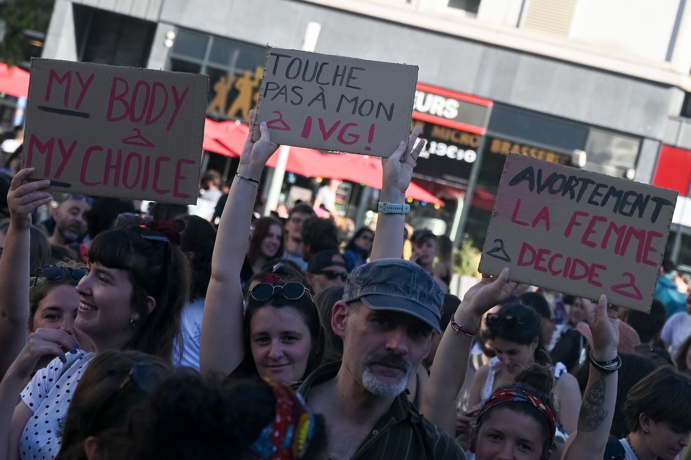 Nouveau rassemblement pro-IVG (interruption volontaire de grossesse) à Nantes organisé par des collectifs féministes pour dénoncer l'abrogation par la Cour suprême américaine de l'arrêt Roe vs Wade qui garantissait la protection fédérale du droit à l'avortement aux citoyens américains depuis 1973 et pour exiger l'inscription de ce droit fondamental dans la constitution française pour la protection du droit à l'avortement.