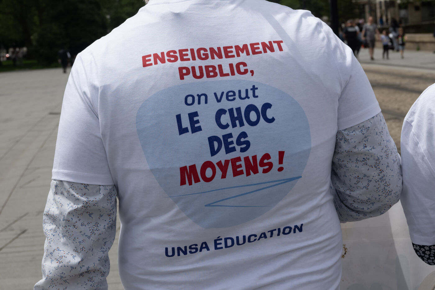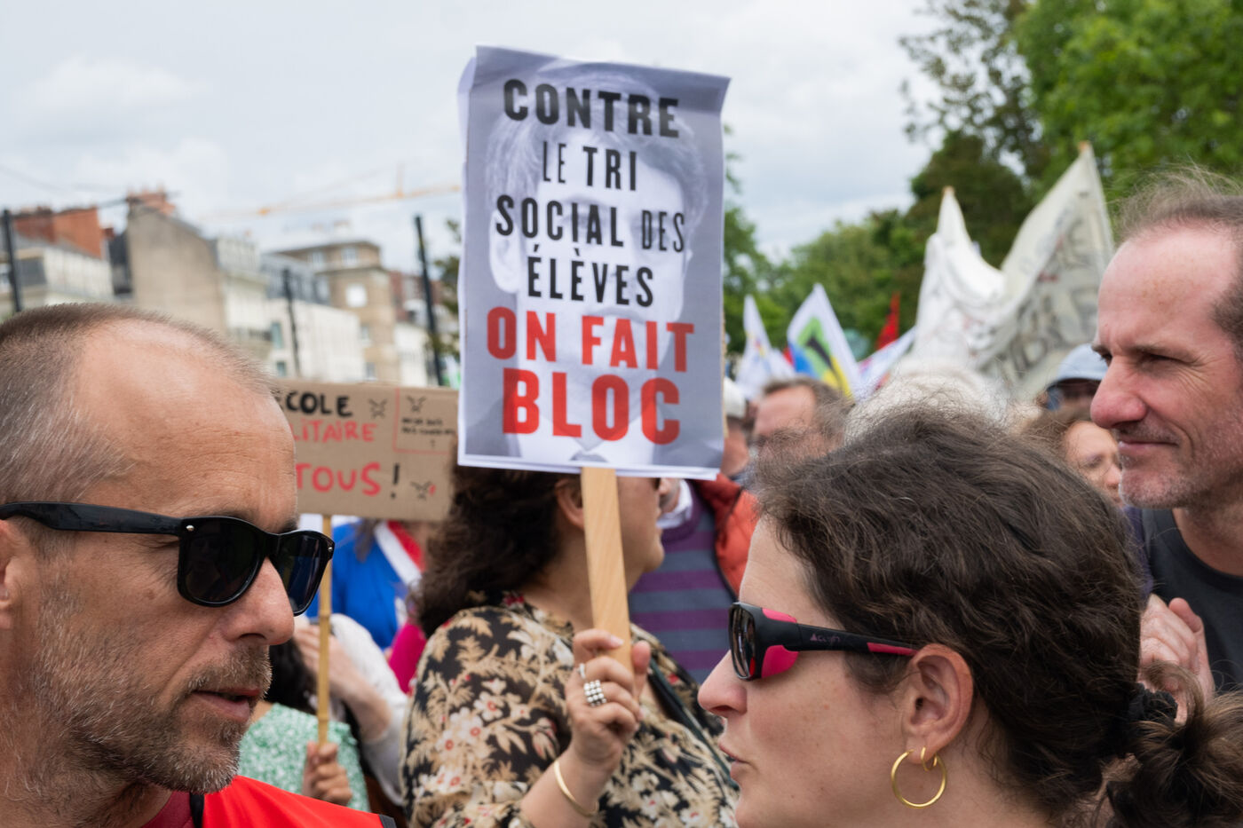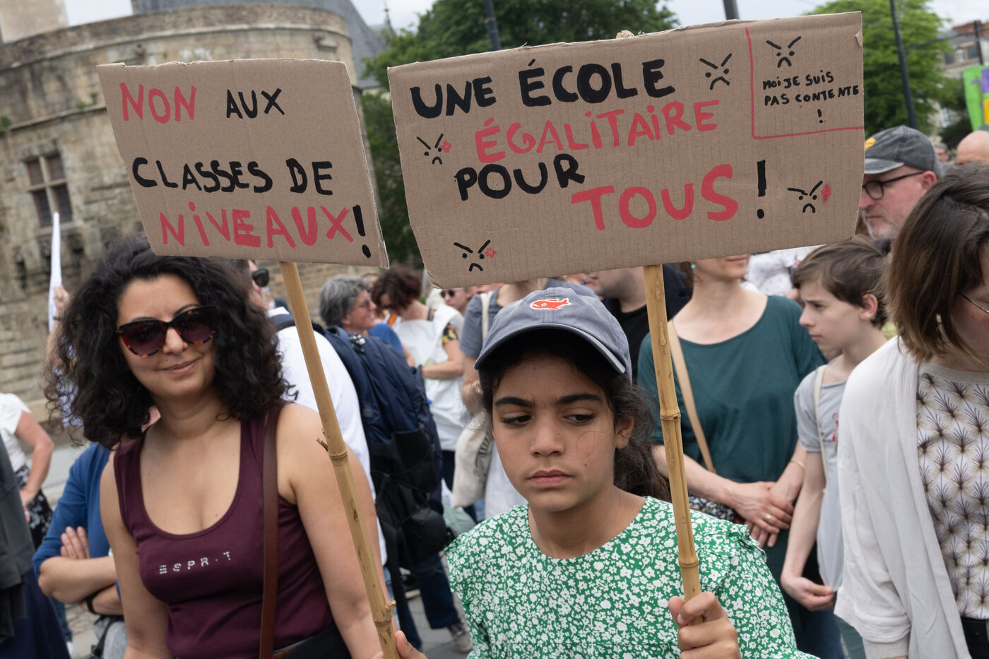 Environ un millier d'enseignants et de parents d'élèves ont manifesté à Nantes (France) samedi 25 mai 2024 à l?appel de l?ensemble des organisations syndicales de l?enseignement contre la réforme du "Choc des savoirs" voulue par Gabriel Attal. Les manifestants s'opposent principalement à l'instauration de groupe de niveaux au collège.