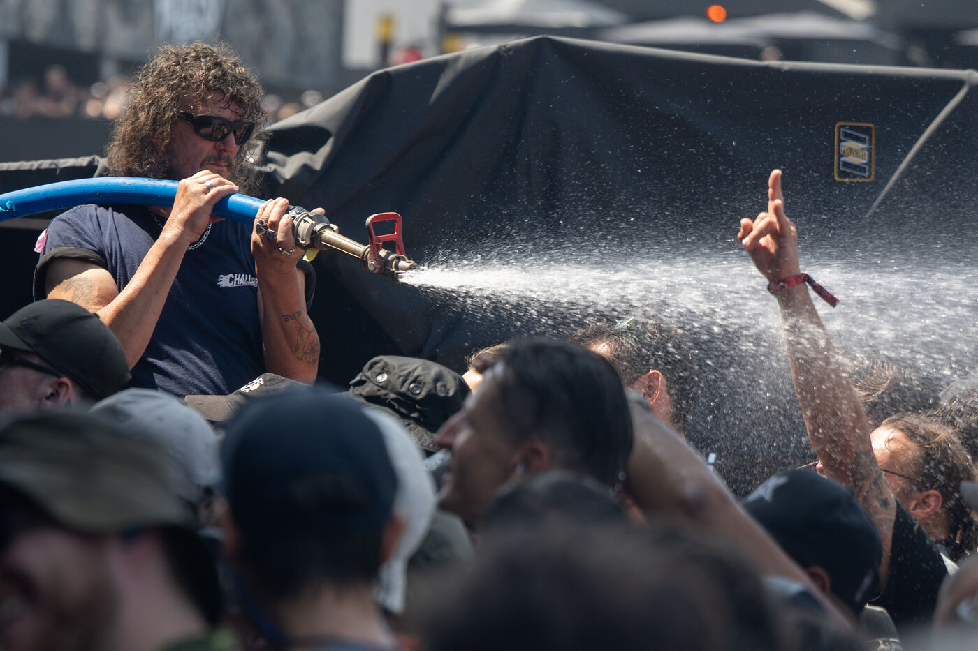 Face à la canicule qui s'abat sur la Loire-Atlantique, les bénévoles du Hellfest arrosent les festivaliers pour les rafraichir. Photo prise le 20 juin 2025 à Clisson.