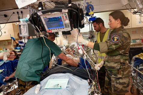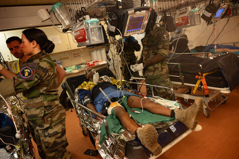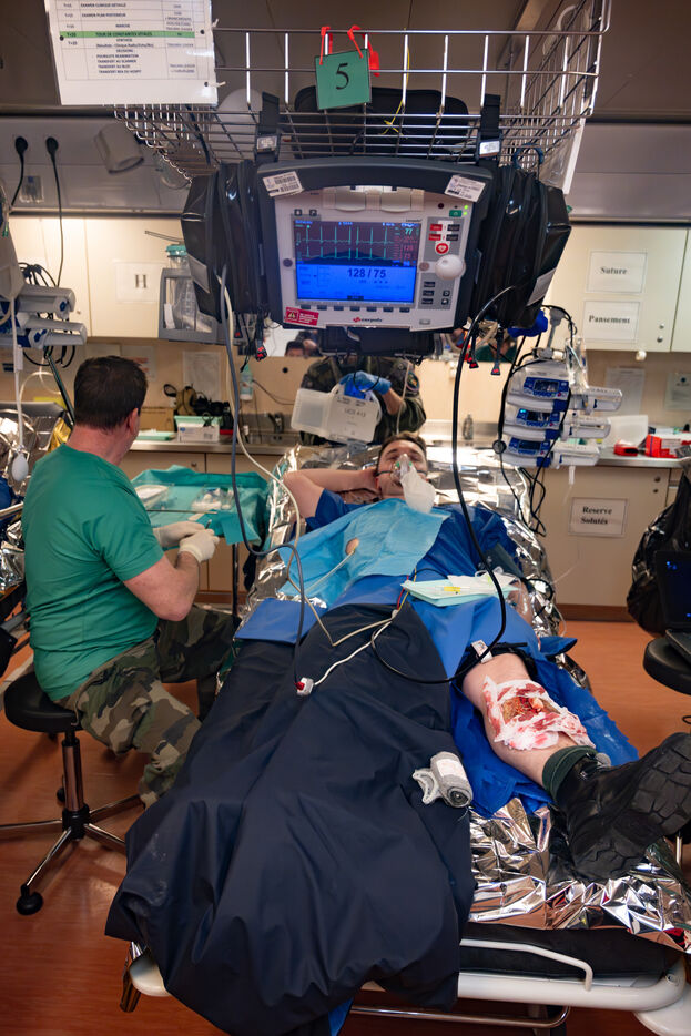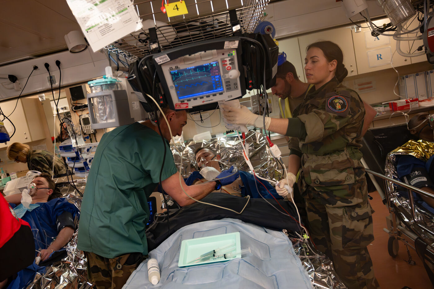 Un hôpital est intégré au sein du Tonnerre, un des porte-hélicoptères amphibie (PHA) de la Marine Nationale. Dans le cadre de l'opération Orion 2026, le personnel médical a simulé une situation dans laquelle il devait faire face à l'afflux massif de blessés comme cela pourrait être le cas lors d'un conflit haute intensité.