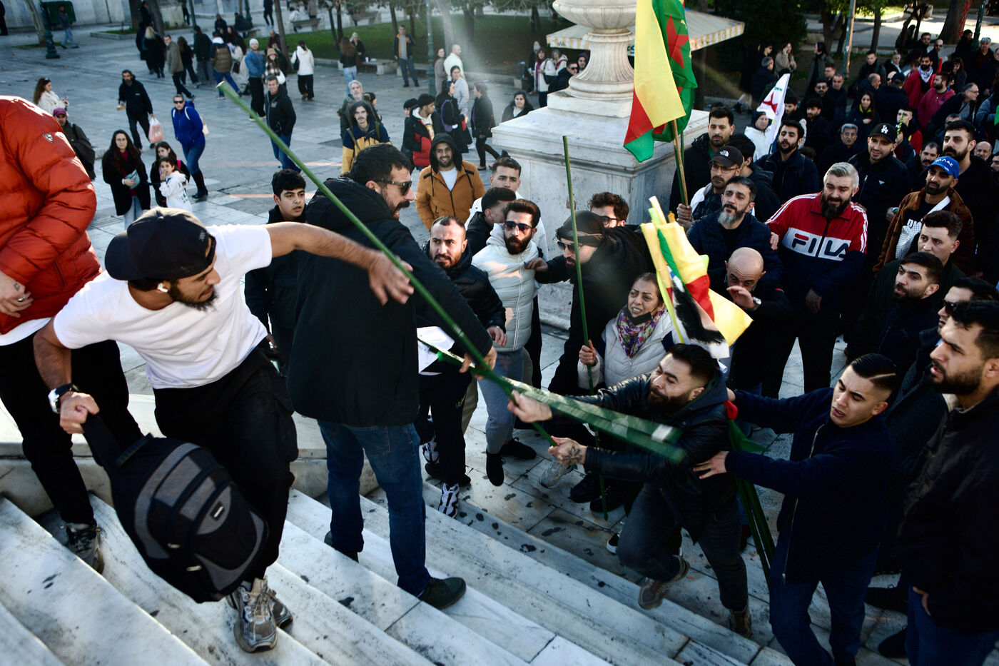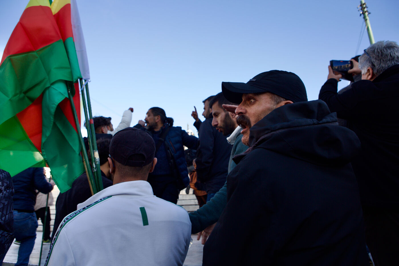 Des centaines de personnes se sont rassemblées sur la place Syntagma à Athènes, en Grèce, le 11 janvier 2026, pour manifester leur solidarité avec les communautés kurdes d’Alep. Organisée par le Kurdish Social Center of Athens, la manifestation a vu des drapeaux kurdes, des banderoles des YPJ et des images d’Abdullah Öcalan. Des tensions sont apparues lorsque un petit groupe de manifestants pro–Armée syrienne libre a confronté les protestataires, entraînant une brève confrontation et l’intervention de la police. Pendant l’agitation, certains manifestants ont également mis le feu à un drapeau pro–Armée syrienne libre. L’événement a reflété la participation active de la diaspora kurde à la solidarité internationale, en défendant les droits humains et la protection des communautés minoritaires touchées par le conflit en cours en Syrie.