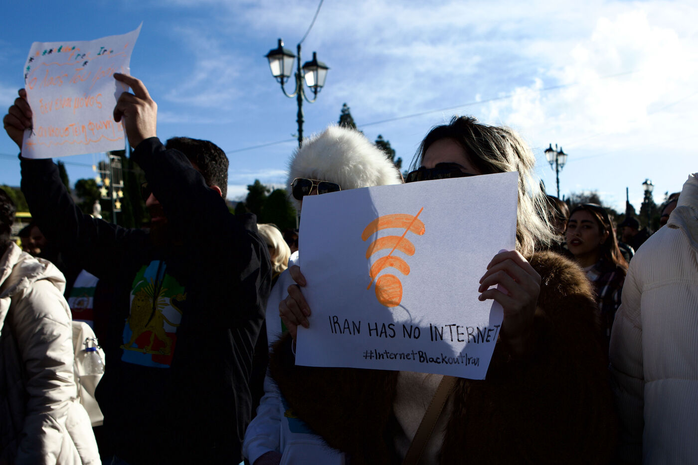 Des images en contre-jour documentent la manifestation iranienne multigénérationnelle sur la place Syntagma à Athènes. Parmi les points forts : un homme haranguant la foule devant un drapeau combiné pro-Shah/grec, un manifestant tenant une pancarte en persan, une famille avec une fille sur les épaules de son père tenant des pancartes pro-Shah, et des portraits rapprochés de Reza Pahlavi. La manifestation met en valeur les symboles visuels du soutien monarchiste et de l’opposition au régime iranien actuel, la lumière et les ombres accentuant la scène de manière dramatique.