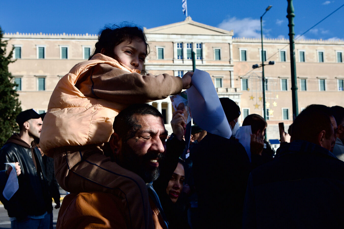 Backlit images document the multi-generational Iranian protest at Syntagma Square, Athens. Highlights include: a man addressing the crowd in front of a combined pro-Shah/Greek flag, a demonstrator holding a Persian-language sign, a family with a daughter on her father’s shoulders holding pro-Shah signs, and close-up portraits of Reza Pahlavi. The protest captures the visual symbols of monarchist support and opposition to the current Iranian regime, with sunlight and shadow adding dramatic emphasis to the scene.