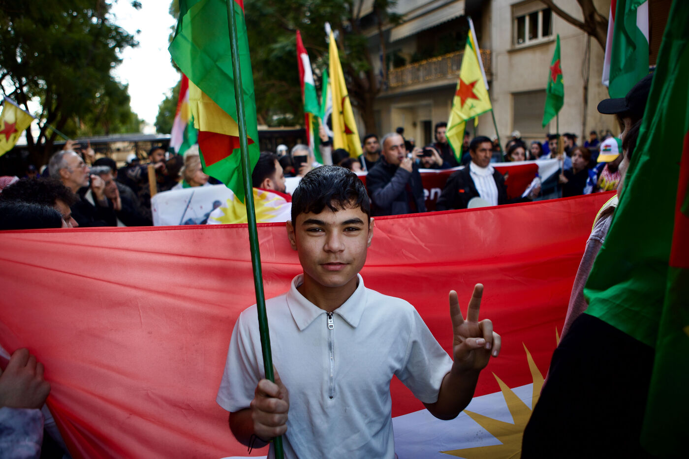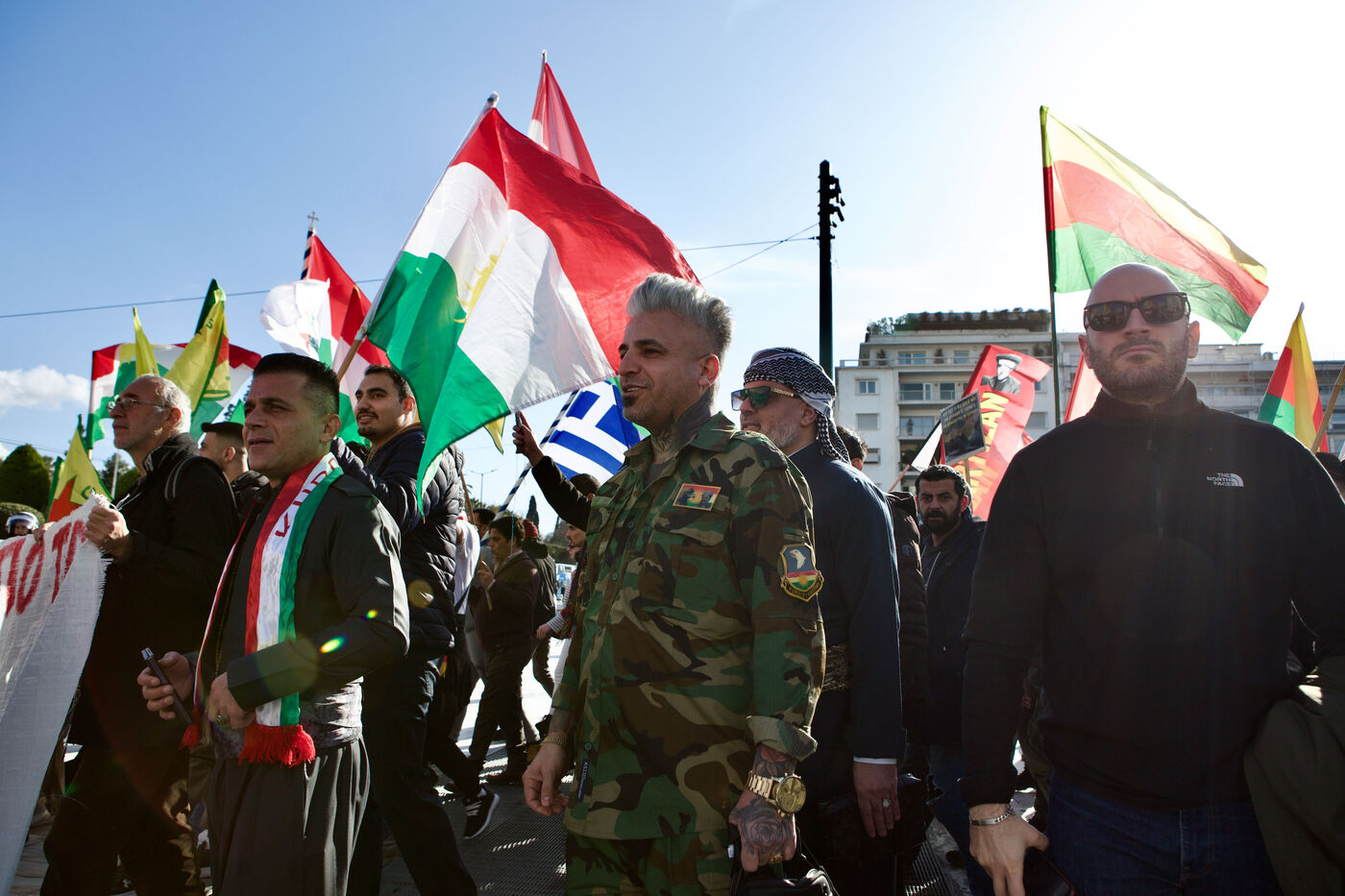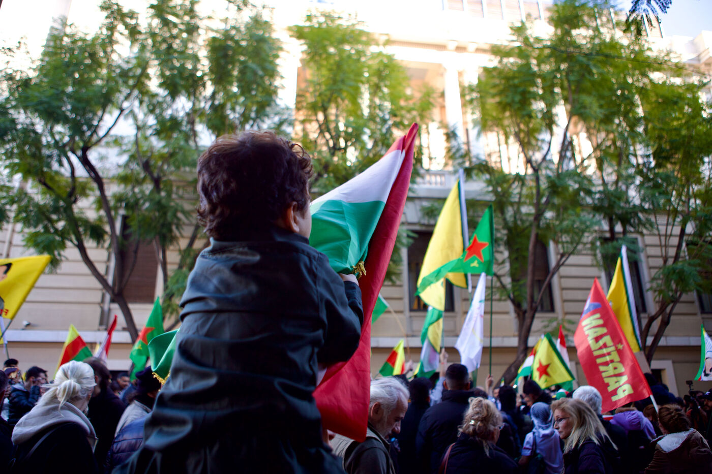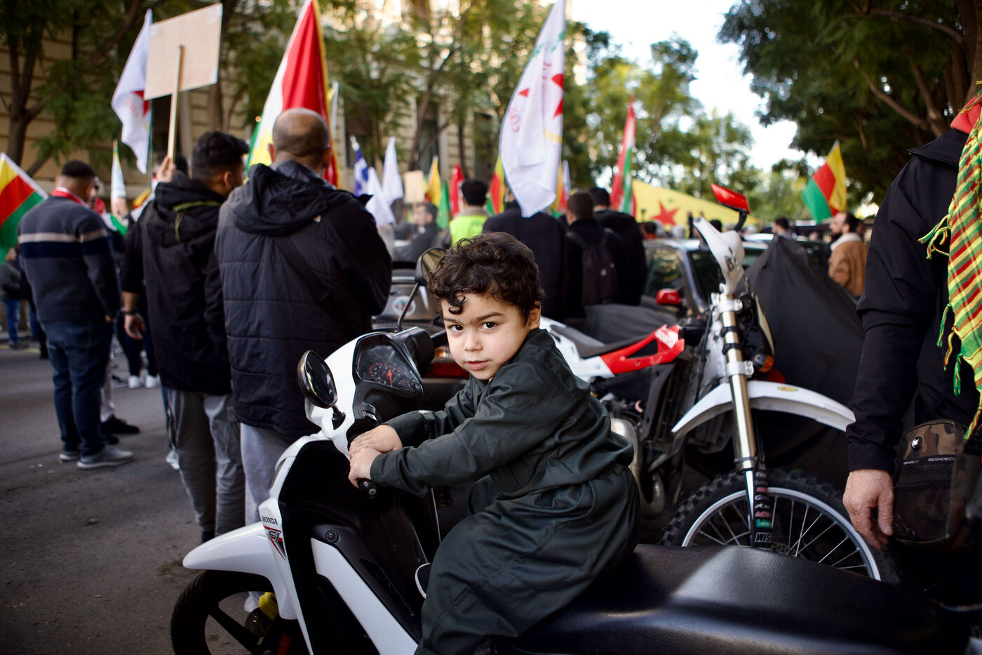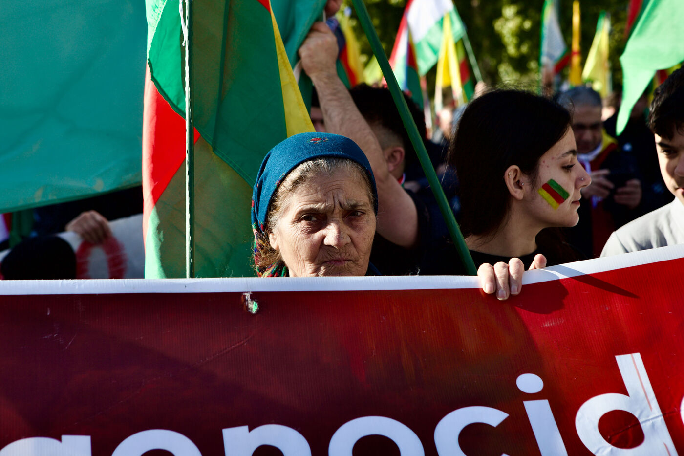 The series showcases the diversity of participants: children and babies waving flags, men and women posing peace gestures, and expressive portraits of activists, some with Kurdish symbols on their uniforms or face paint. These images convey unity, resistance, and collective commitment within the demonstration, while also capturing intimate and focused moments at the heart of the mobilization.