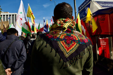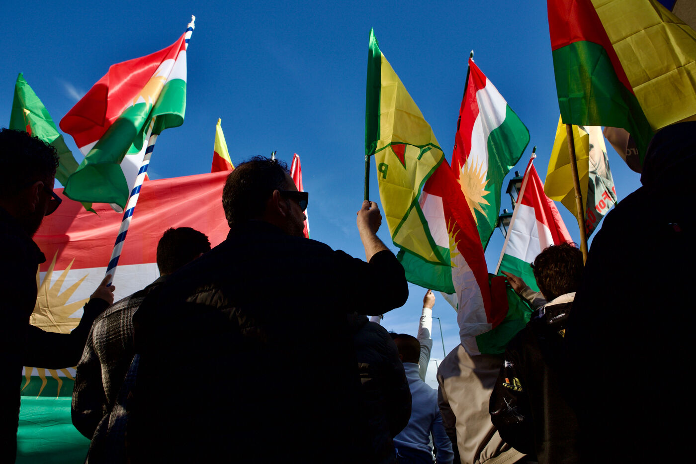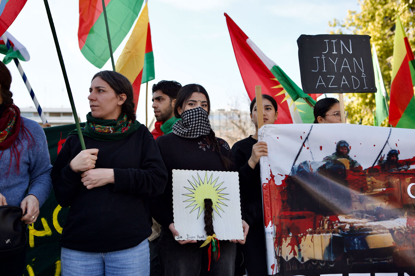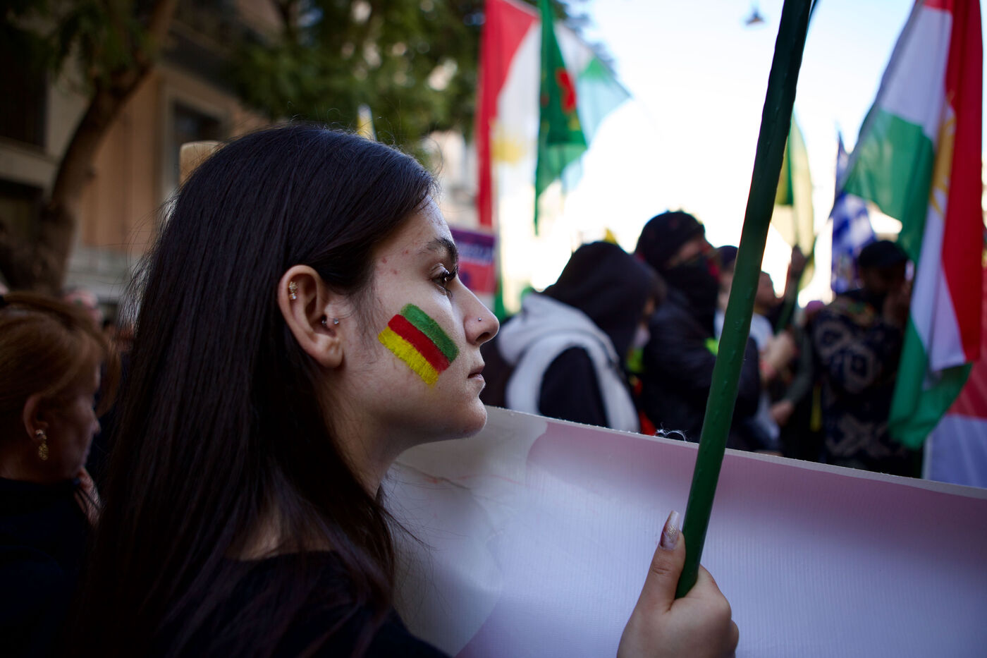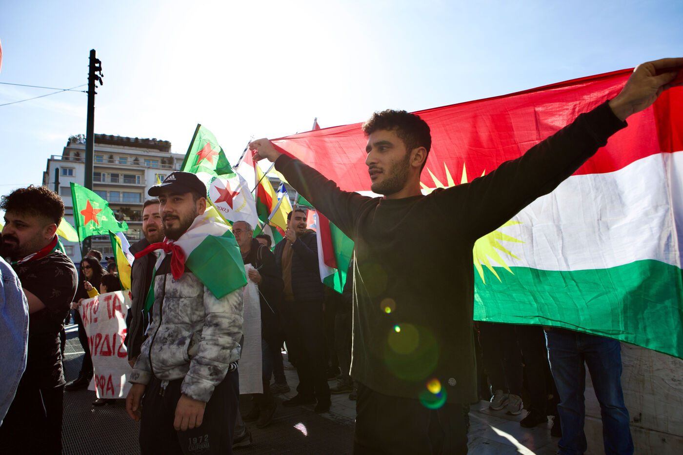 The series showcases the diversity of participants: children and babies waving flags, men and women posing peace gestures, and expressive portraits of activists, some with Kurdish symbols on their uniforms or face paint. These images convey unity, resistance, and collective commitment within the demonstration, while also capturing intimate and focused moments at the heart of the mobilization.