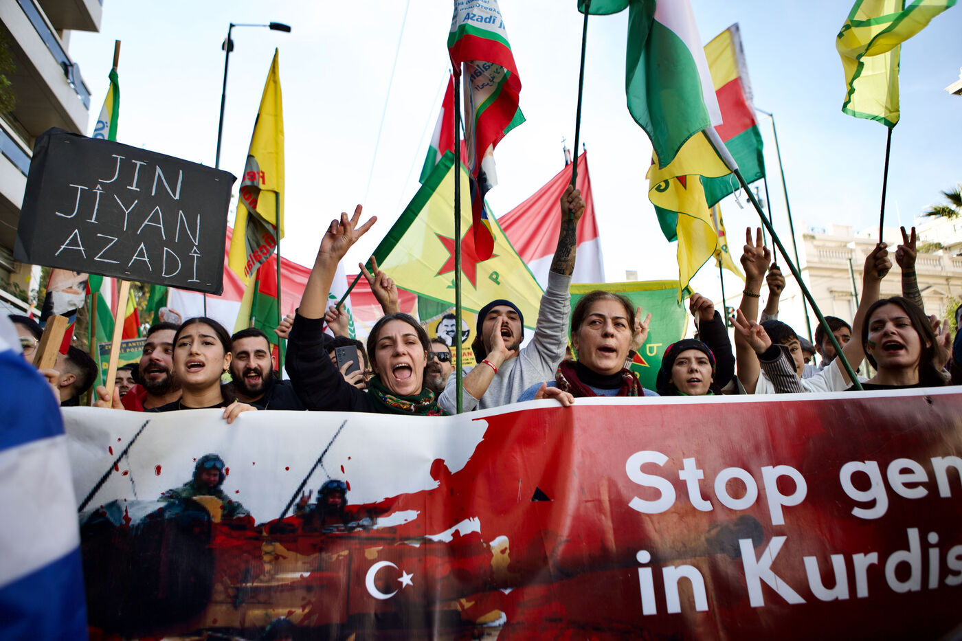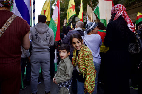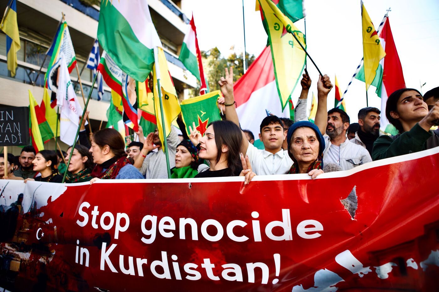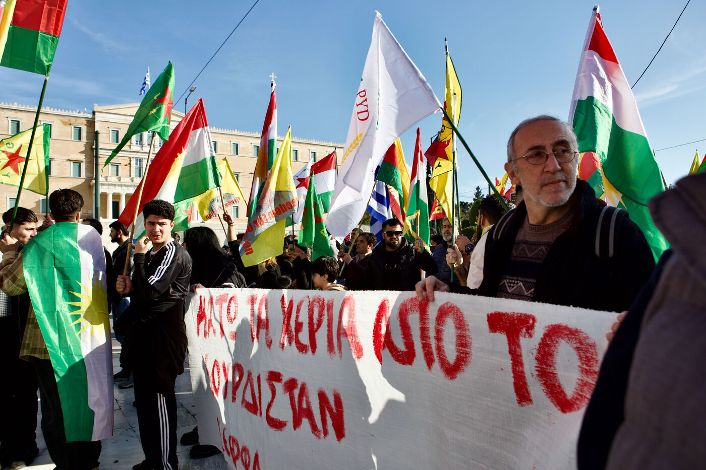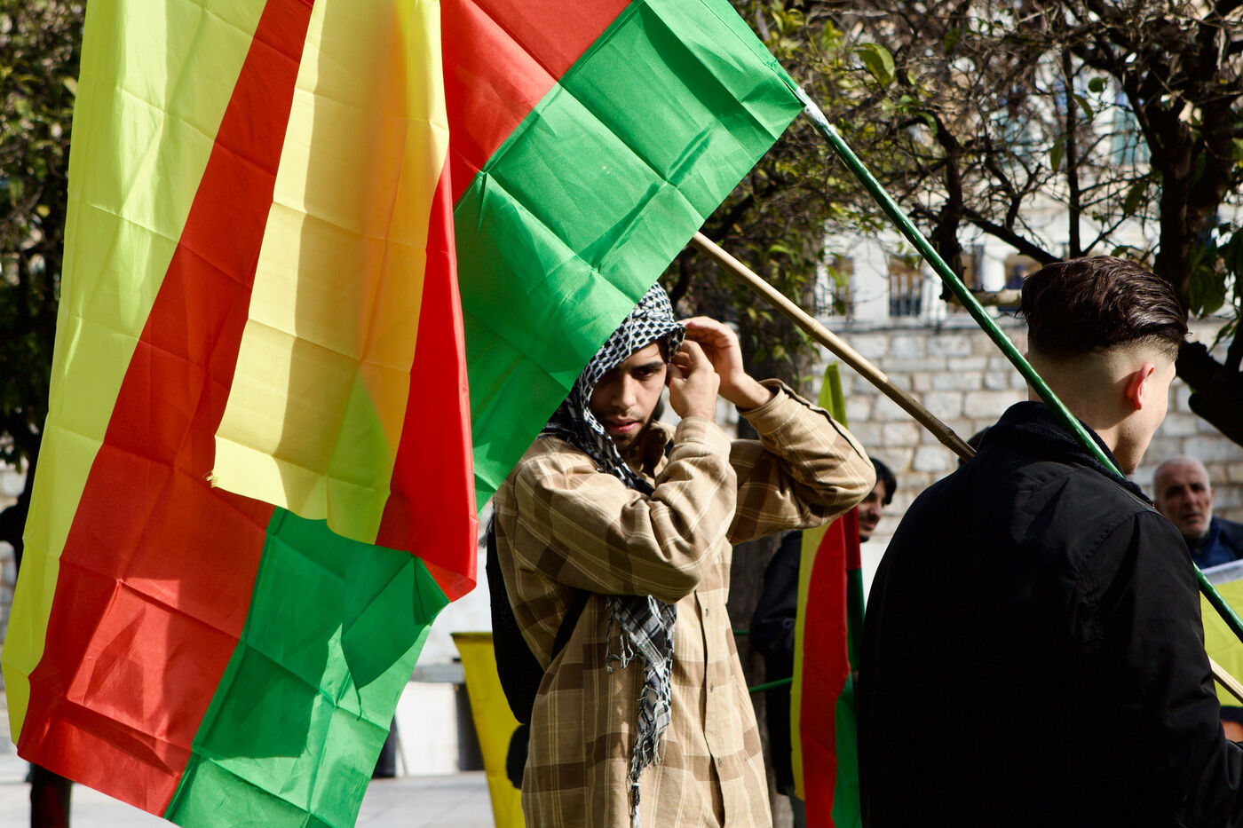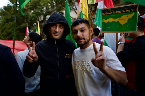 The series showcases the diversity of participants: children and babies waving flags, men and women posing peace gestures, and expressive portraits of activists, some with Kurdish symbols on their uniforms or face paint. These images convey unity, resistance, and collective commitment within the demonstration, while also capturing intimate and focused moments at the heart of the mobilization.